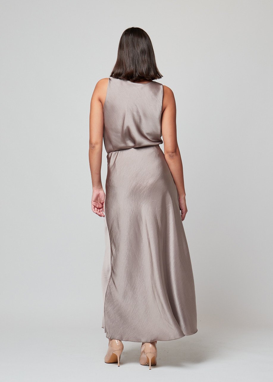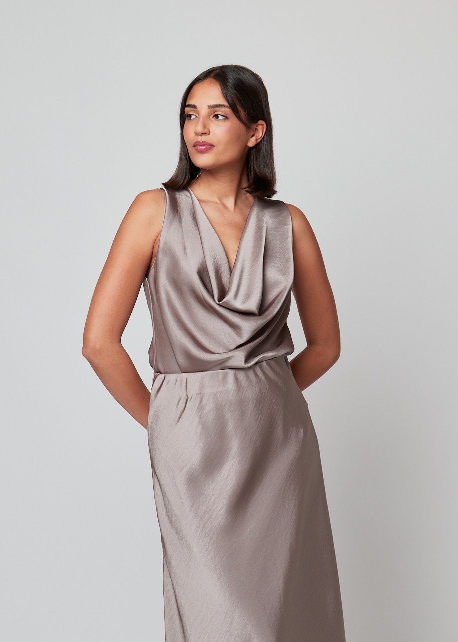El Top Velmira es esa prenda clave que eleva cualquier look sin esfuerzo. Su escote drapeado suave aporta movimiento y feminidad, mientras que el tejido fluido con acabado satinado cae de forma natural sobre el cuerpo, creando una silueta ligera y elegante.