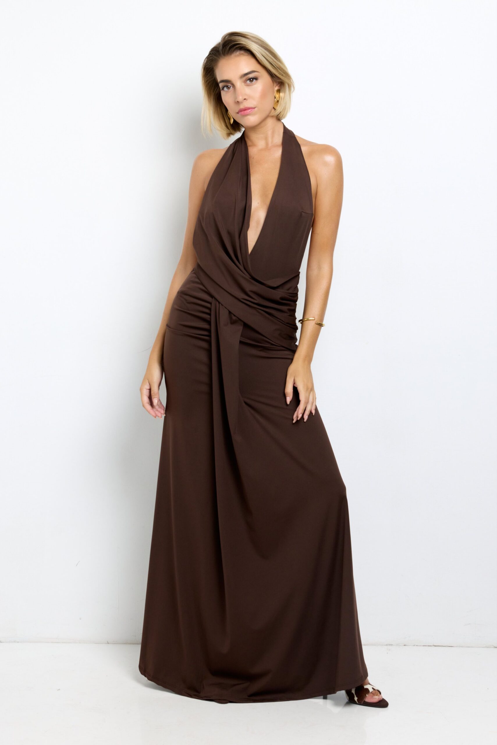 El Vestido Améliane encarna la elegancia más sensual. Su tono marrón chocolate, intenso y cálido, se funde con un escote halter profundo que estiliza la figura y realza la feminidad con sutileza.