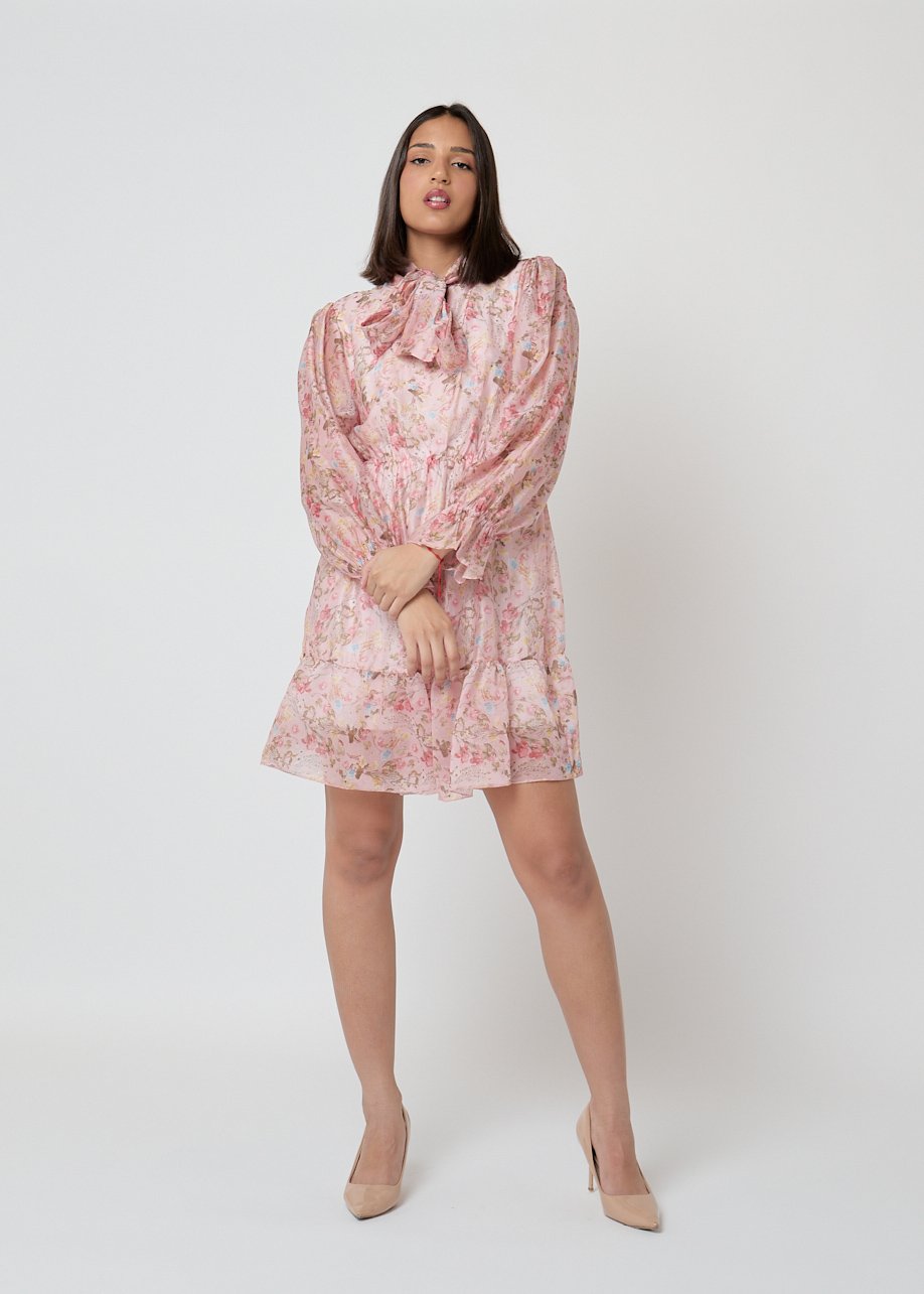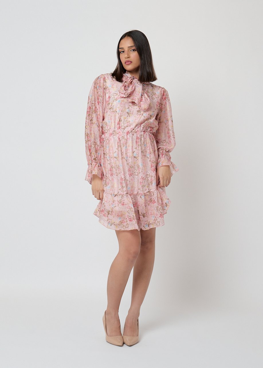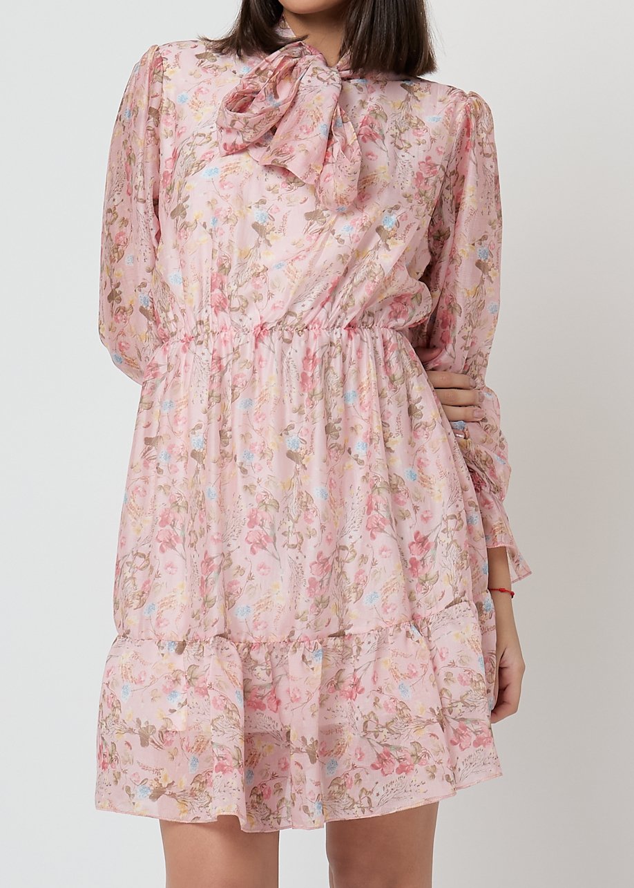 Vestido corto floral rosa con lazada al cuello y volantes. Femenino, ligero y perfecto para looks casual chic.