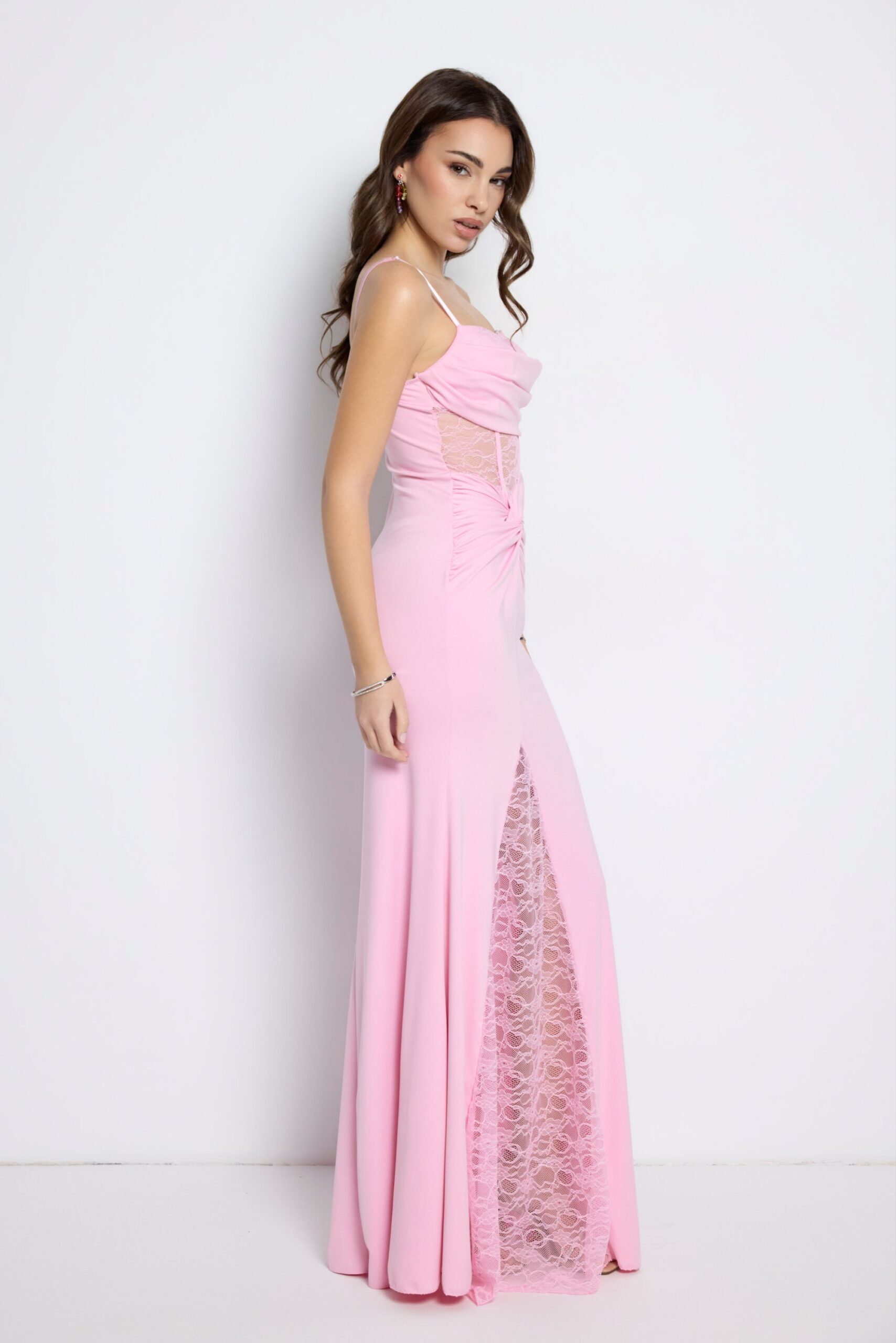 Vestido largo rosa con encaje y drapeado. Elegante, femenino y perfecto para eventos especiales.