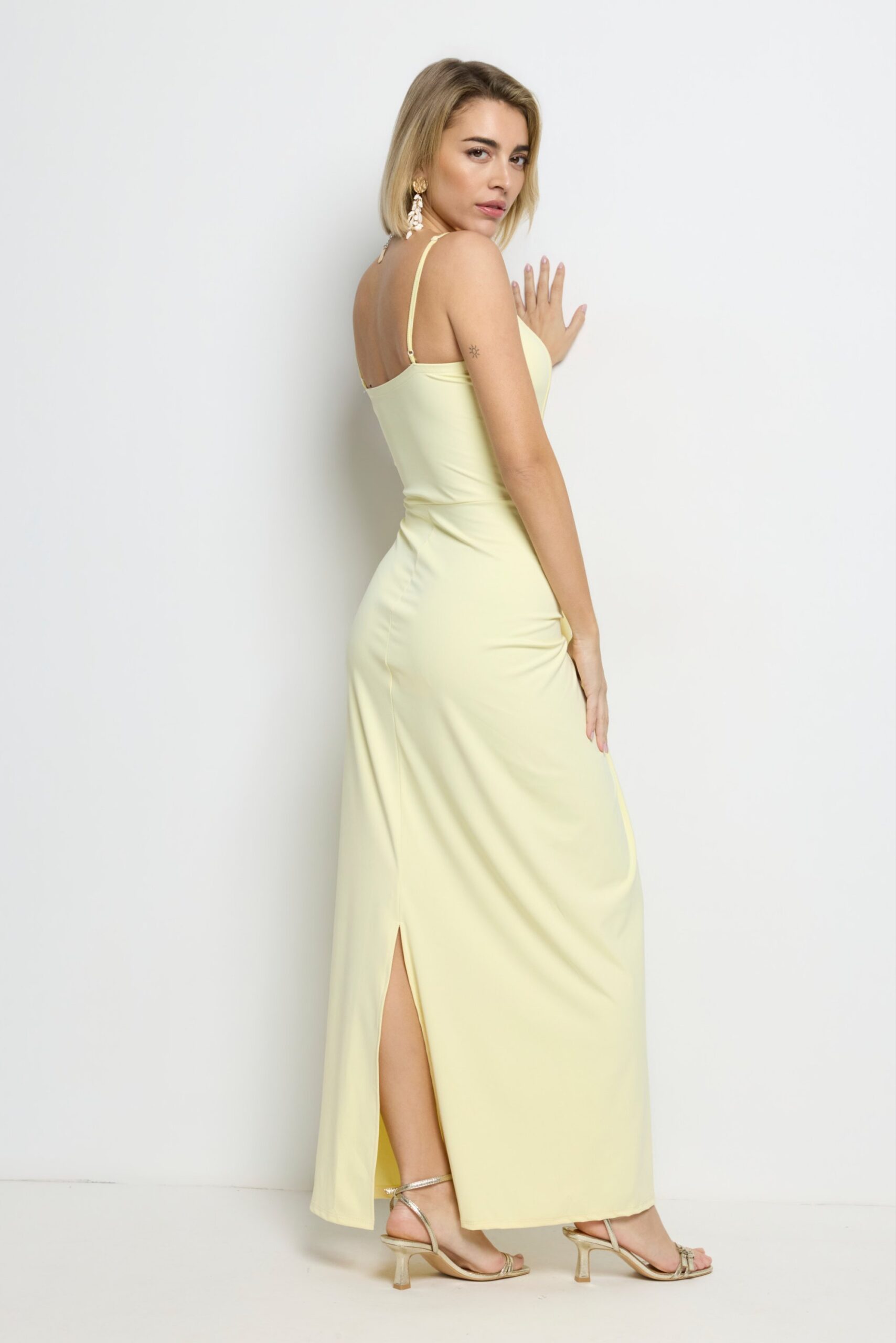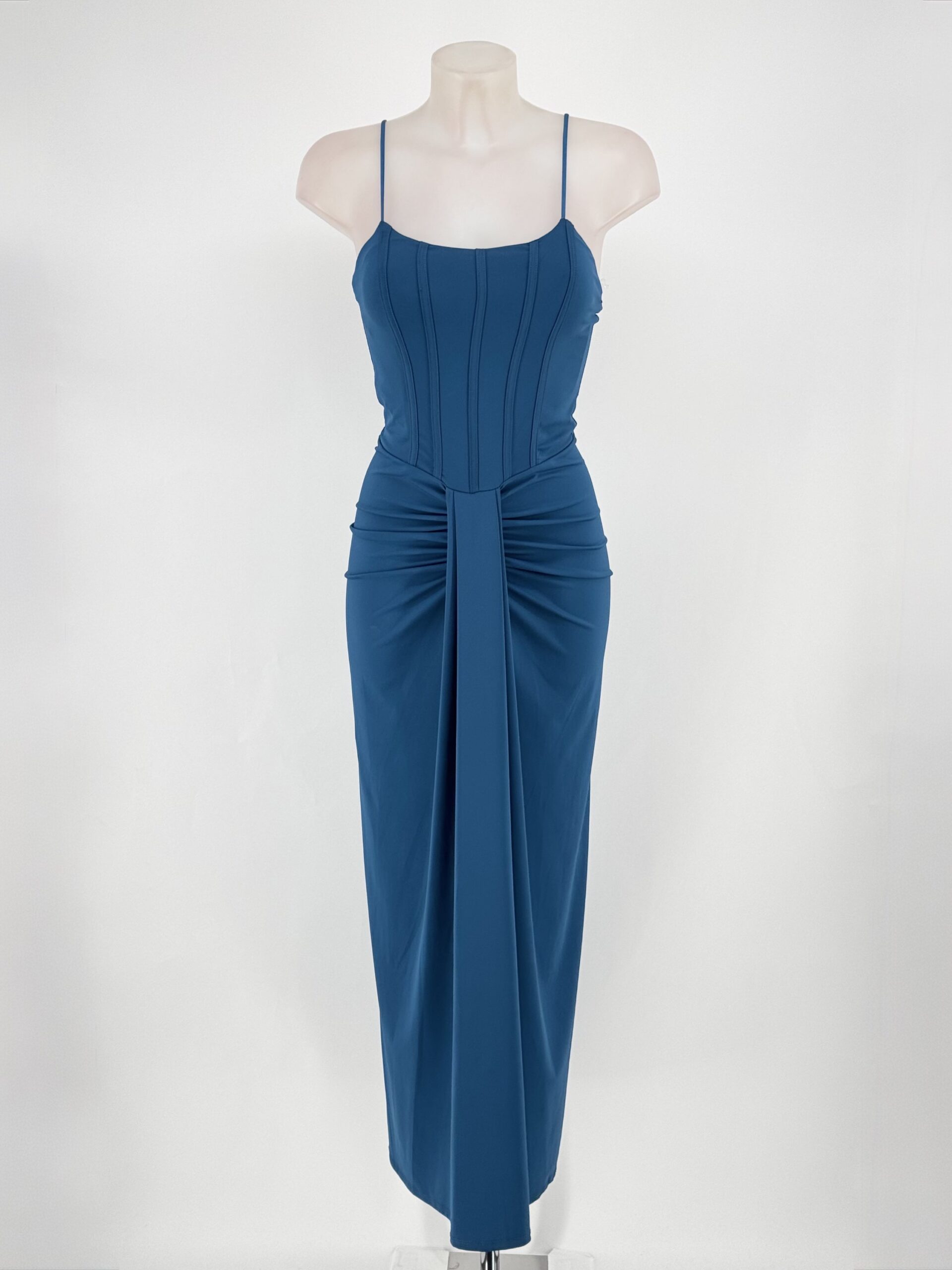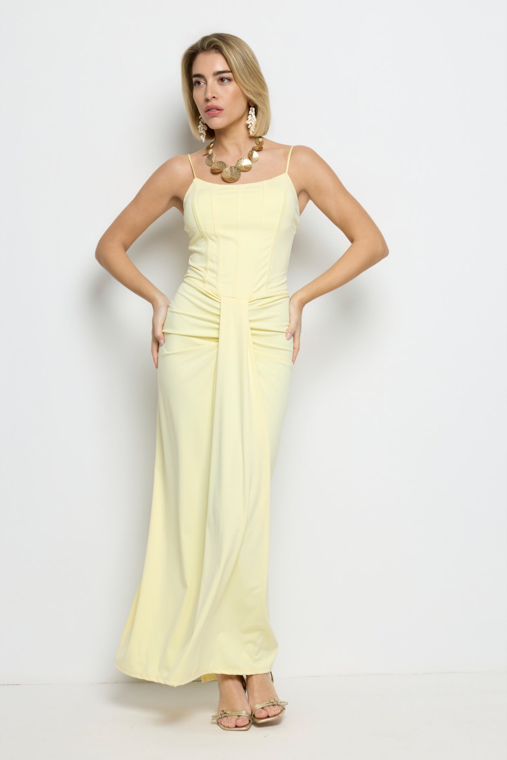 Vestido largo con efecto corset, tirantes finos y drapeado frontal. Elegante y favorecedor para eventos.
