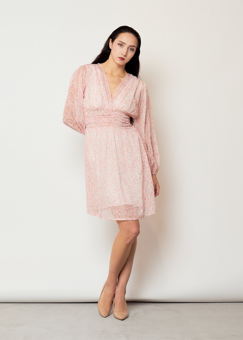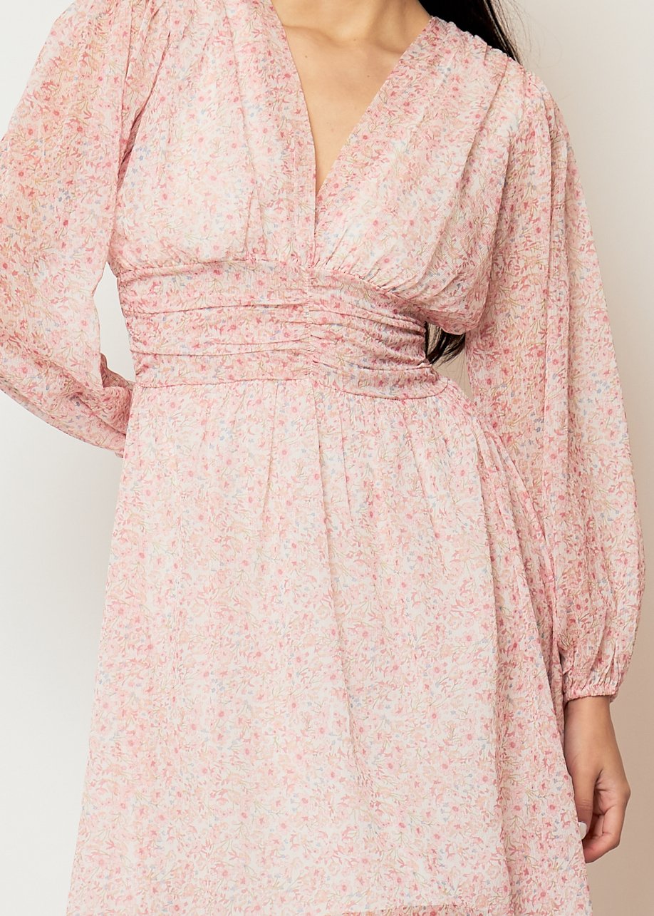 Vestido corto floral rosa con manga larga y cintura fruncida. Femenino, ligero y perfecto para looks casual elegantes.