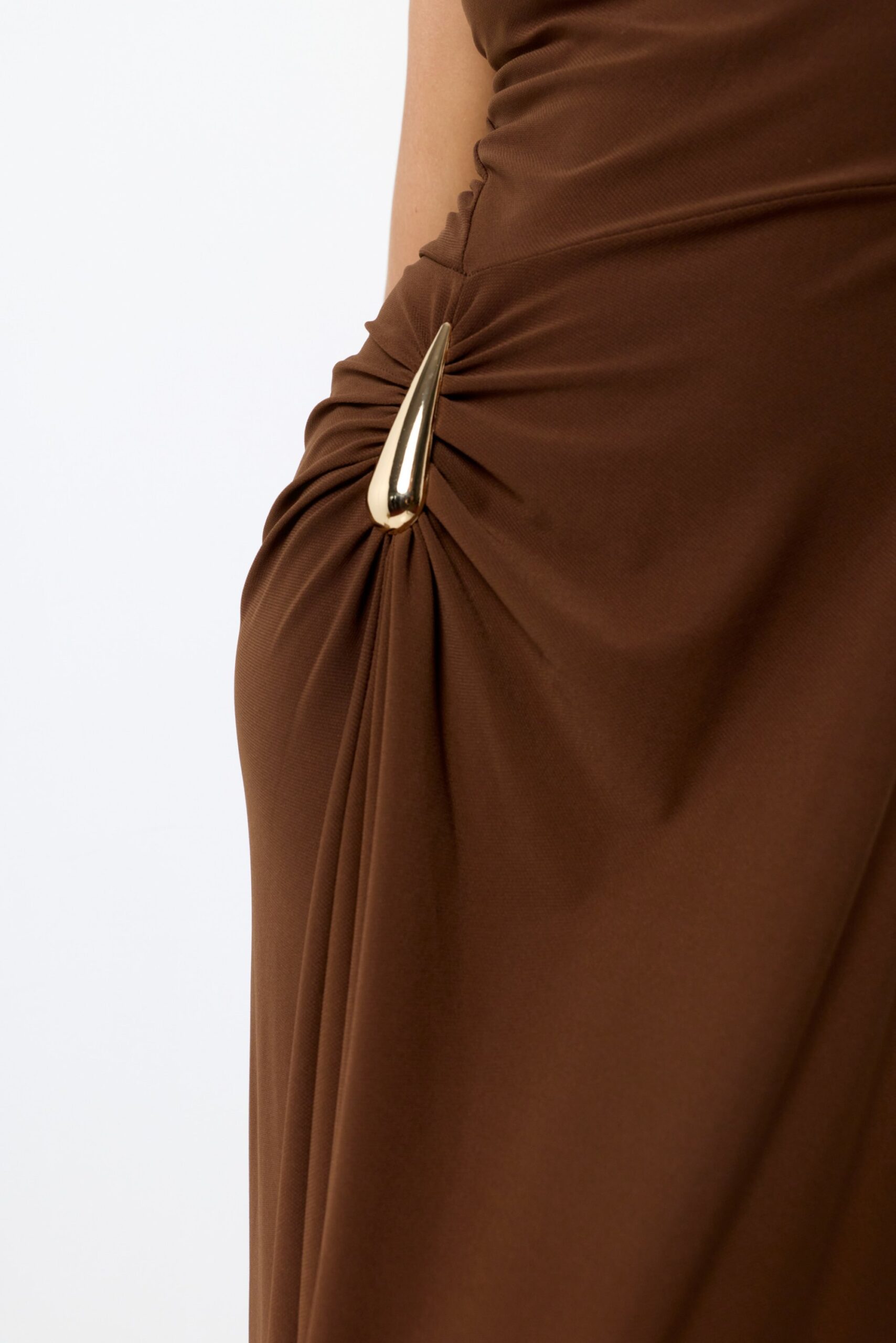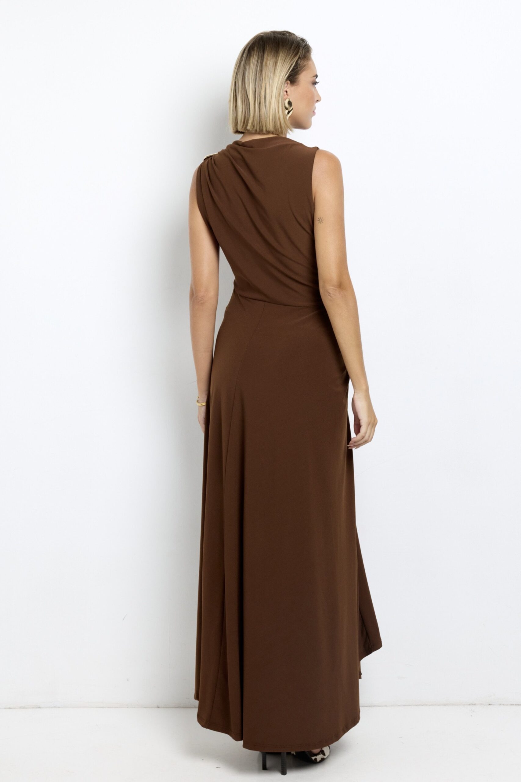 Vestido largo marrón cacao con hombro estructurado y detalle dorado. Elegancia moderna con inspiración griega.