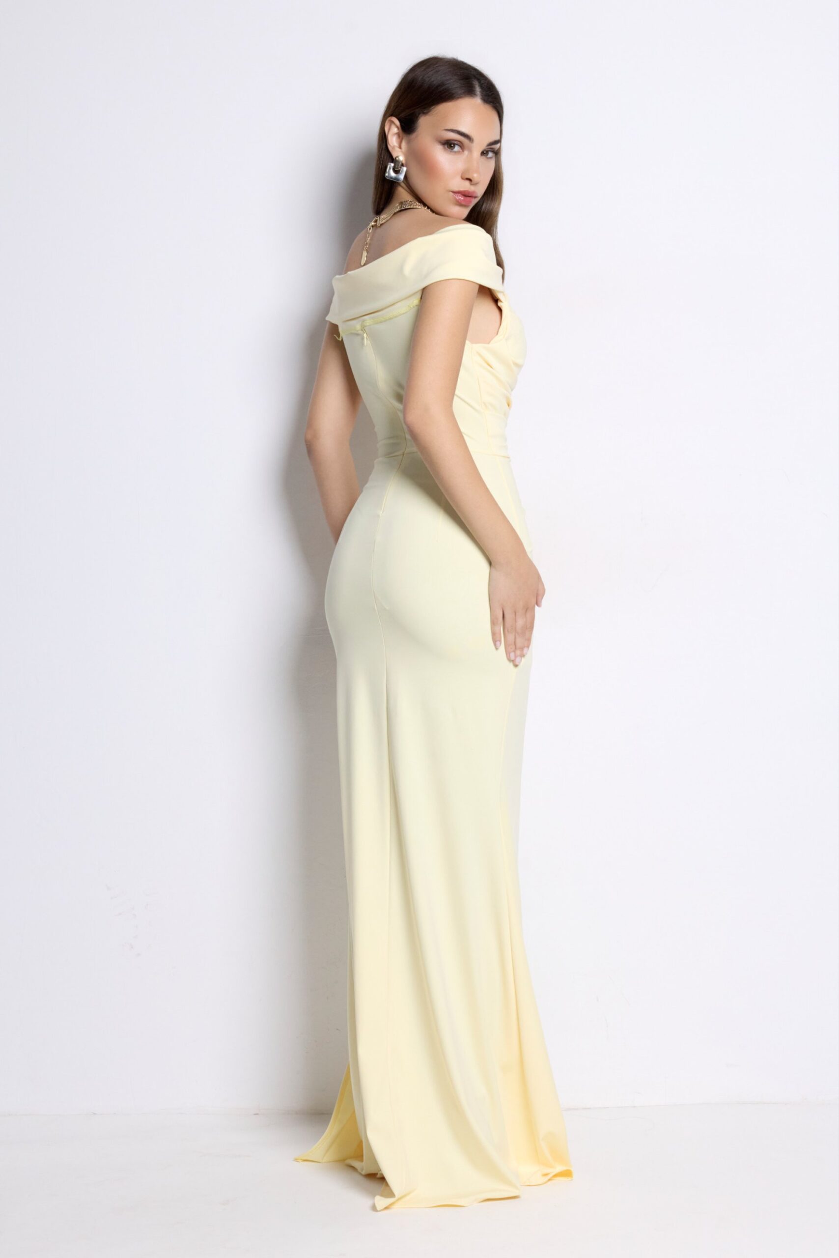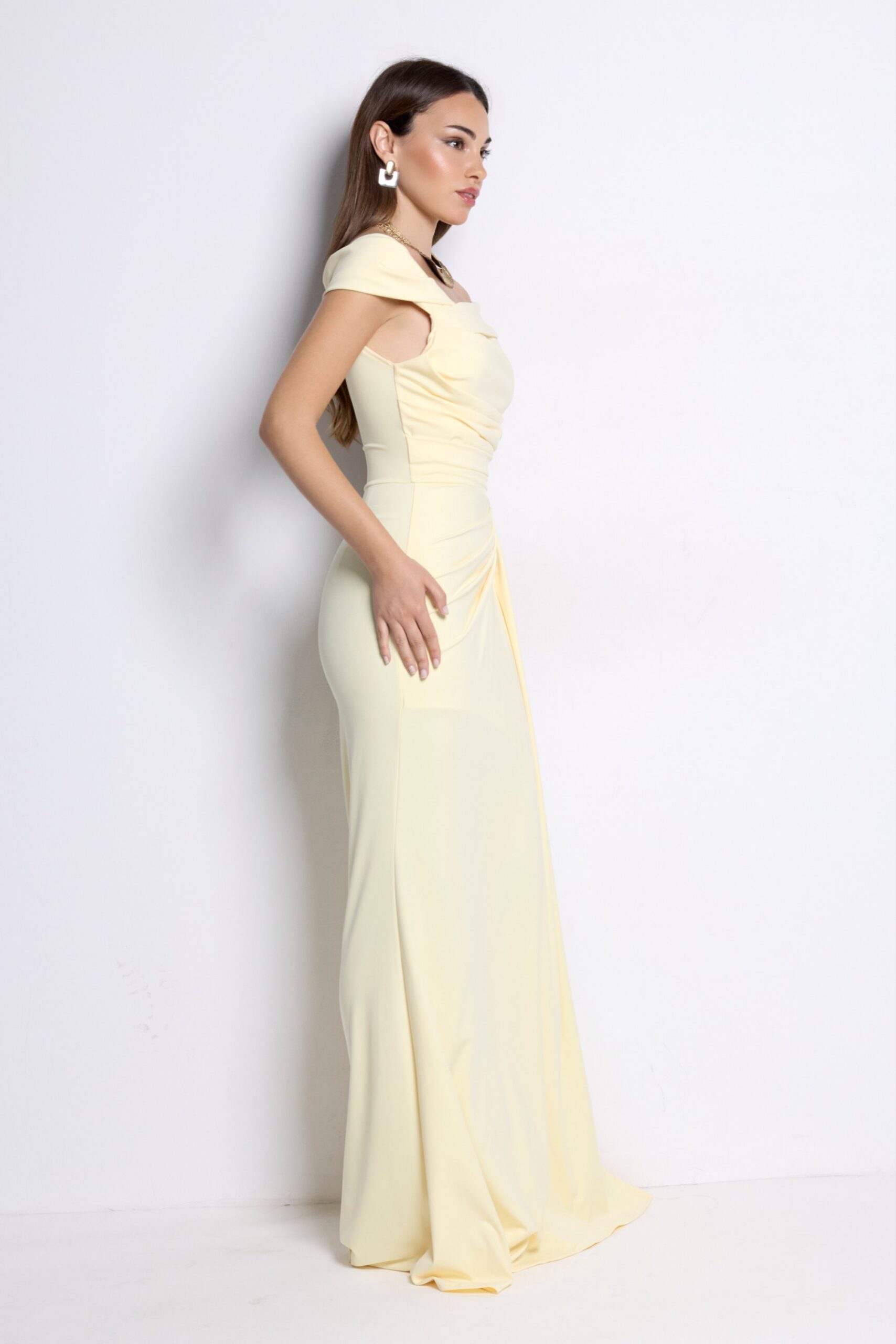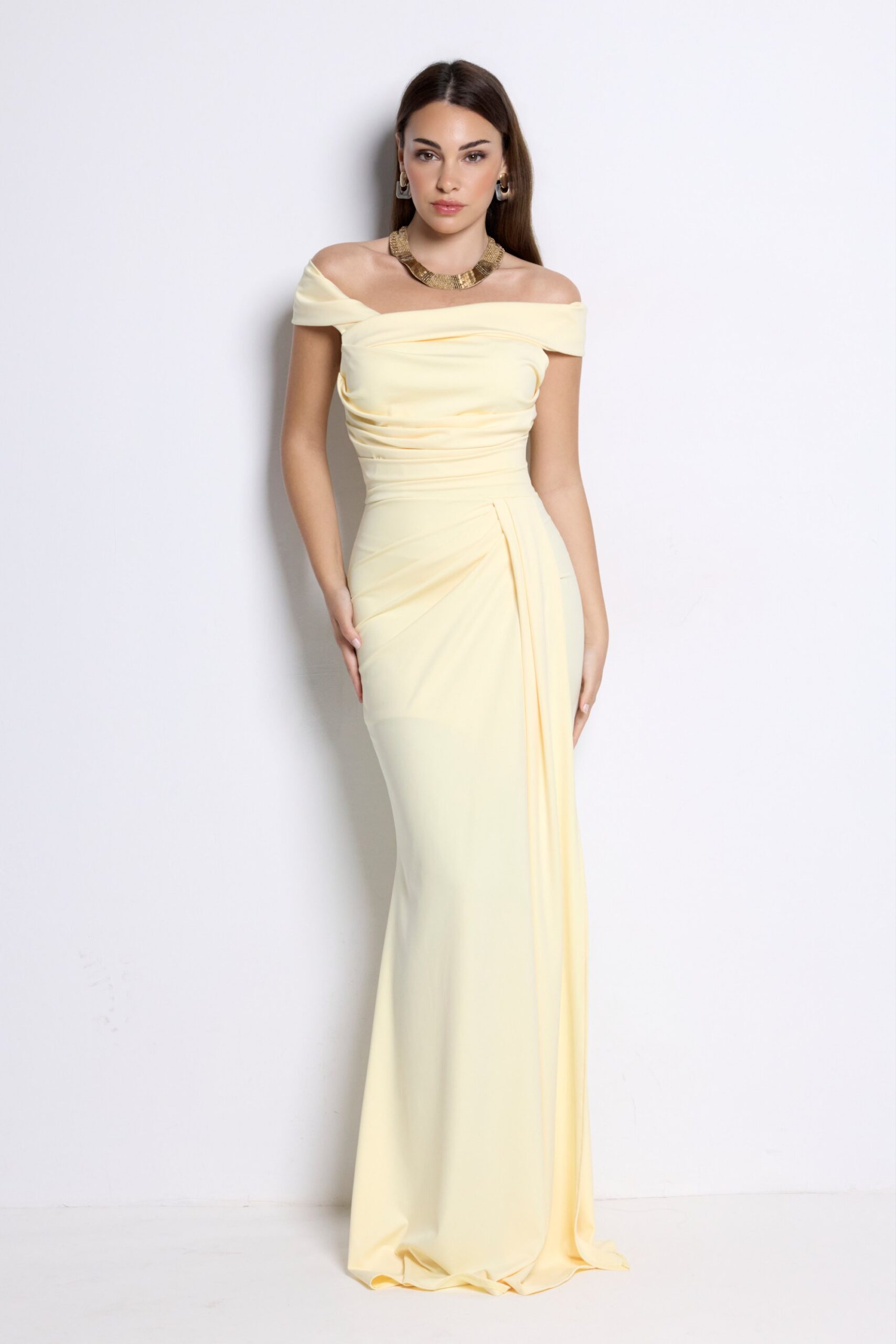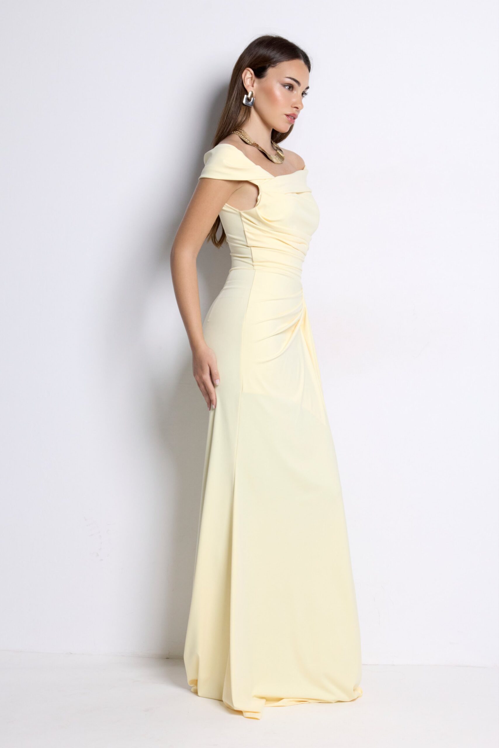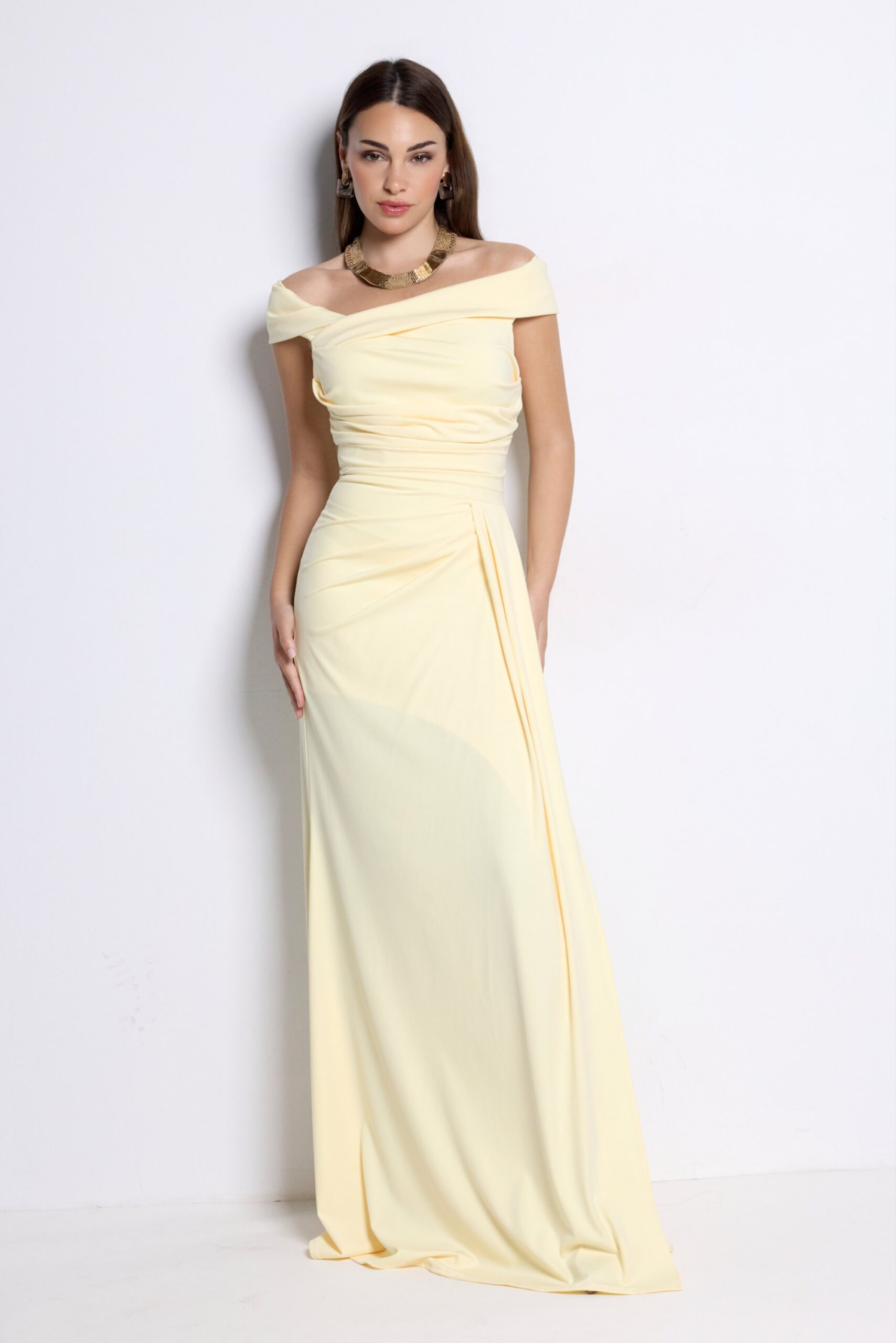 Vestido largo elegante amarillo mantequilla con escote bardot y drapeado. Perfecto para bodas y eventos especiales.