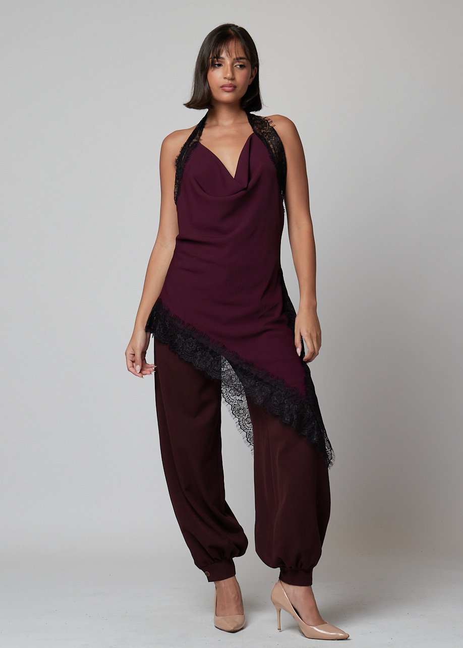 El escote drapeado en forma de cascada y la espalda completamente descubierta convierten este diseño en la elección perfecta para cenas, fiestas o eventos donde quieras brillar con estilo. Su caída fluida estiliza la figura, y el pantalón abombado aporta un contraste moderno y cómodo, ideal para moverte con libertad sin perder glamour.