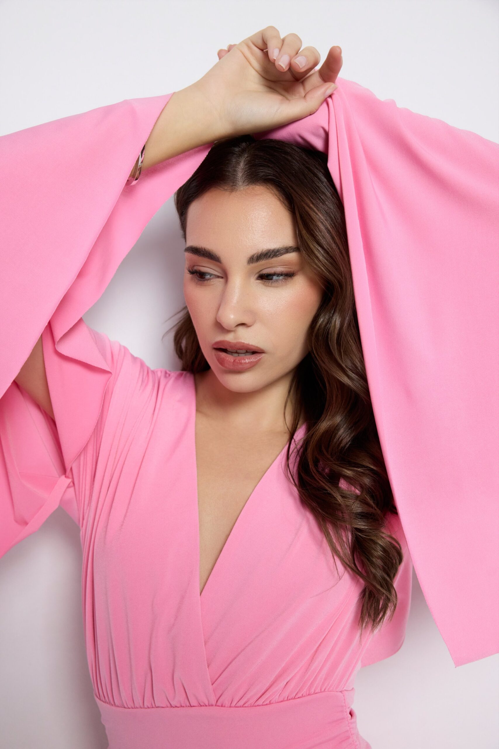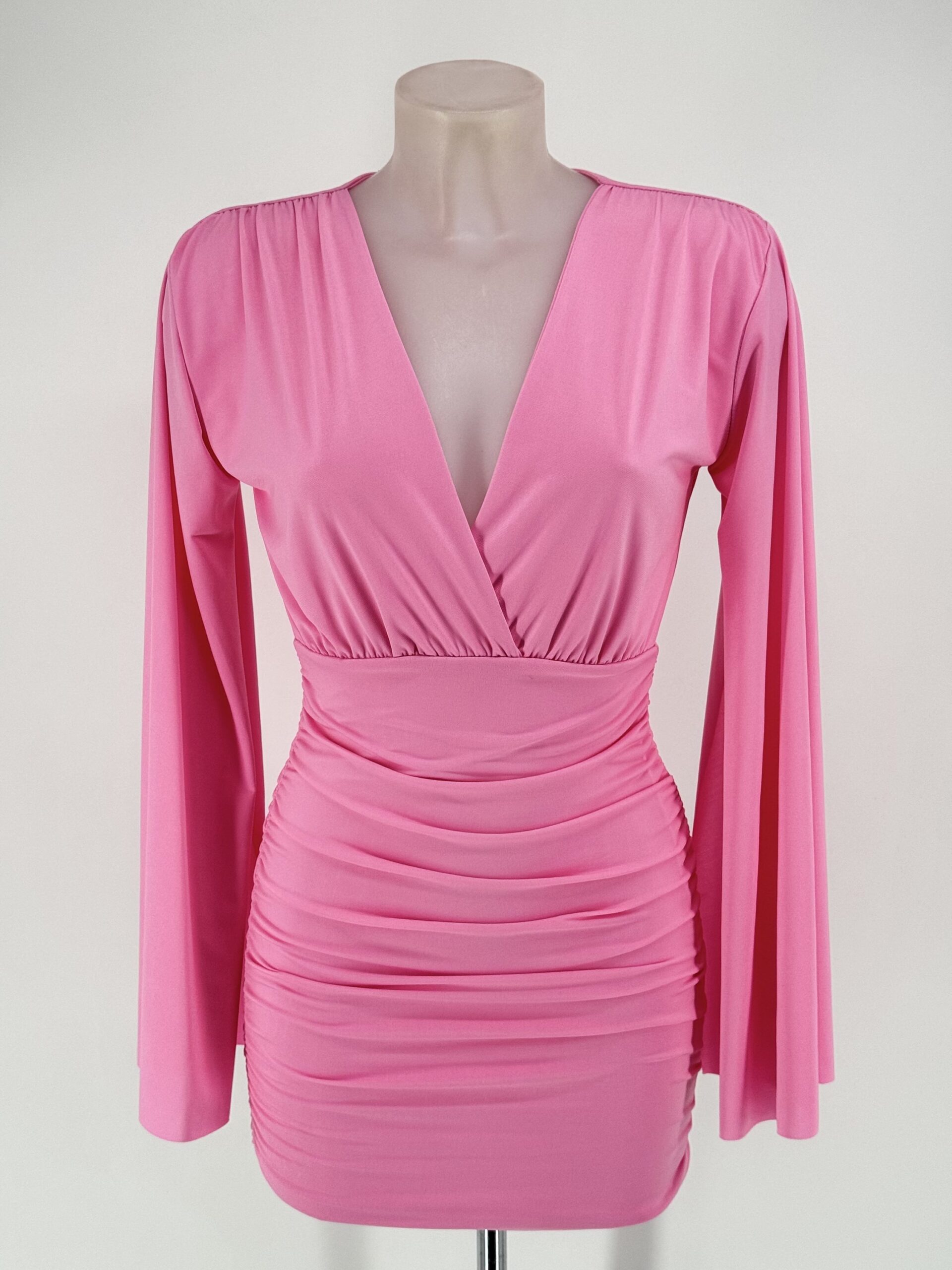 Vestido corto rosa Barbie de evento con escote en pico, mangas fluidas y falda fruncida. Femenino, elegante y llamativo.