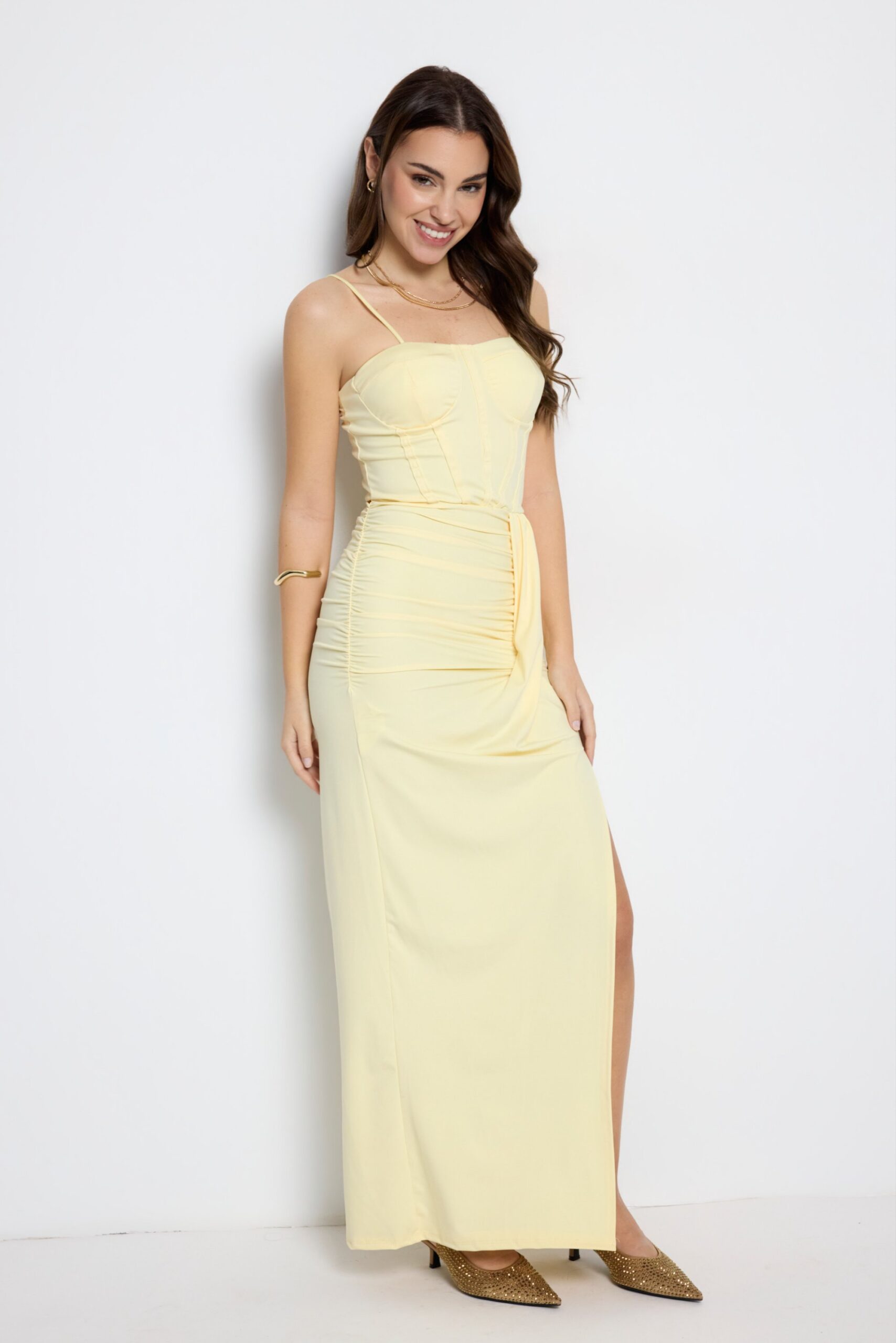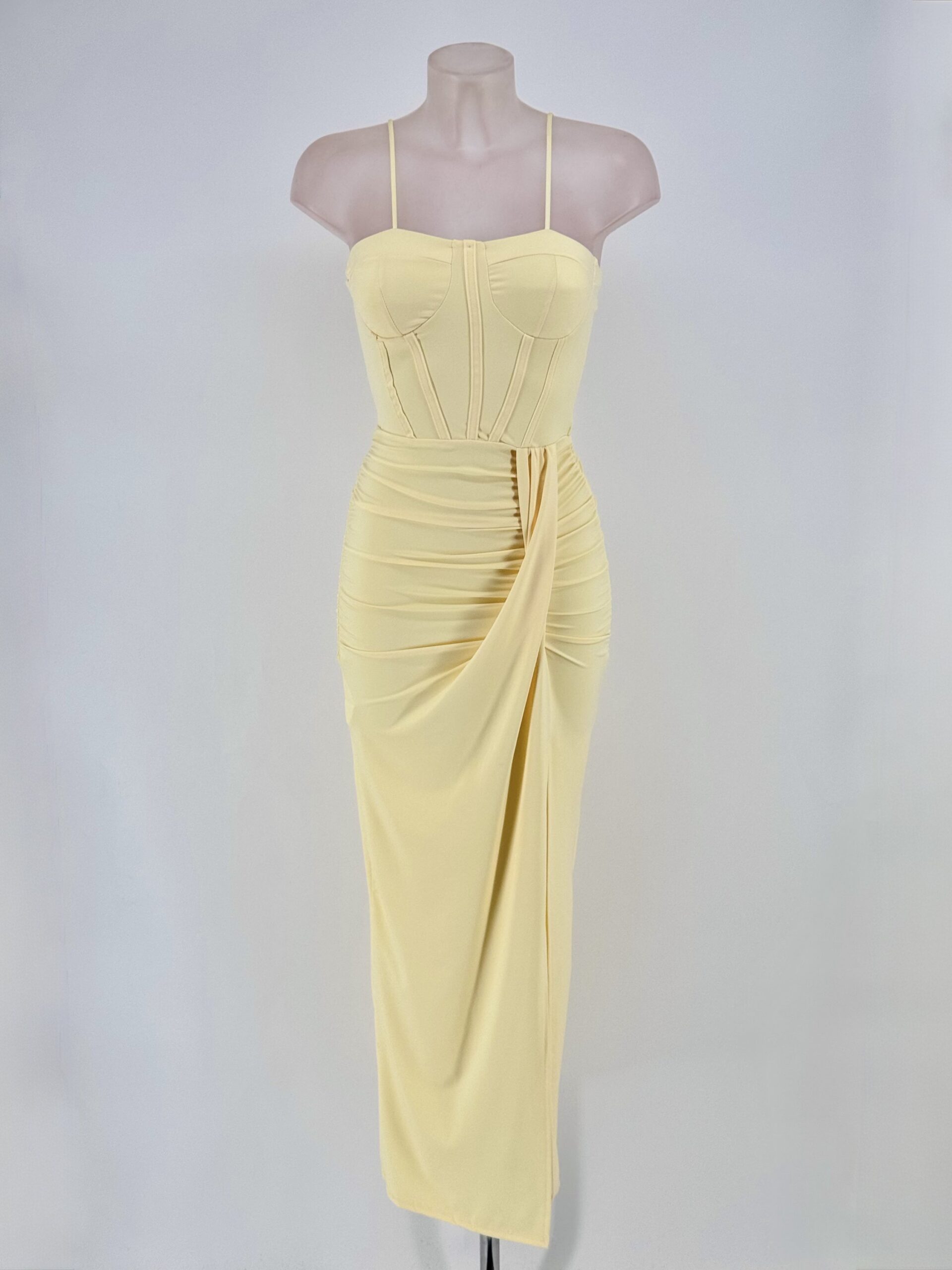 Vestido largo amarillo pastel de evento con cuerpo tipo corsé, drapeado en la cintura y abertura frontal. Elegante y femenino.