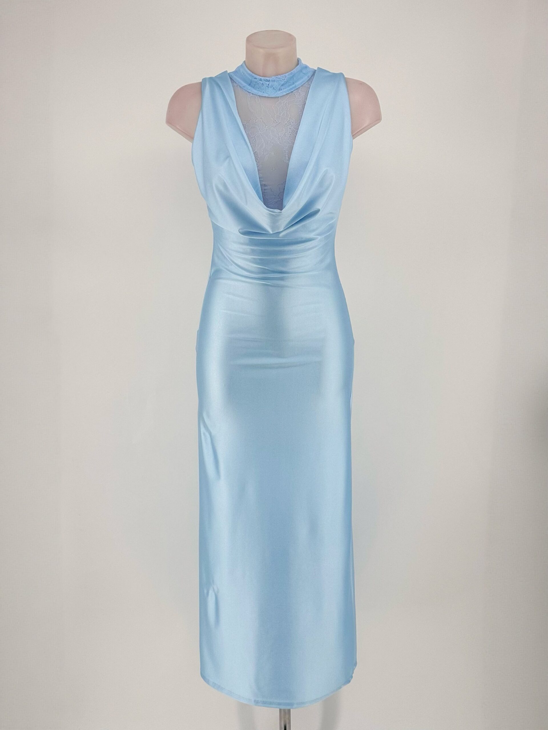 Vestido azul largo con detalle de encaje y cuello alto. Diseño sofisticado ideal para bodas y eventos formales.