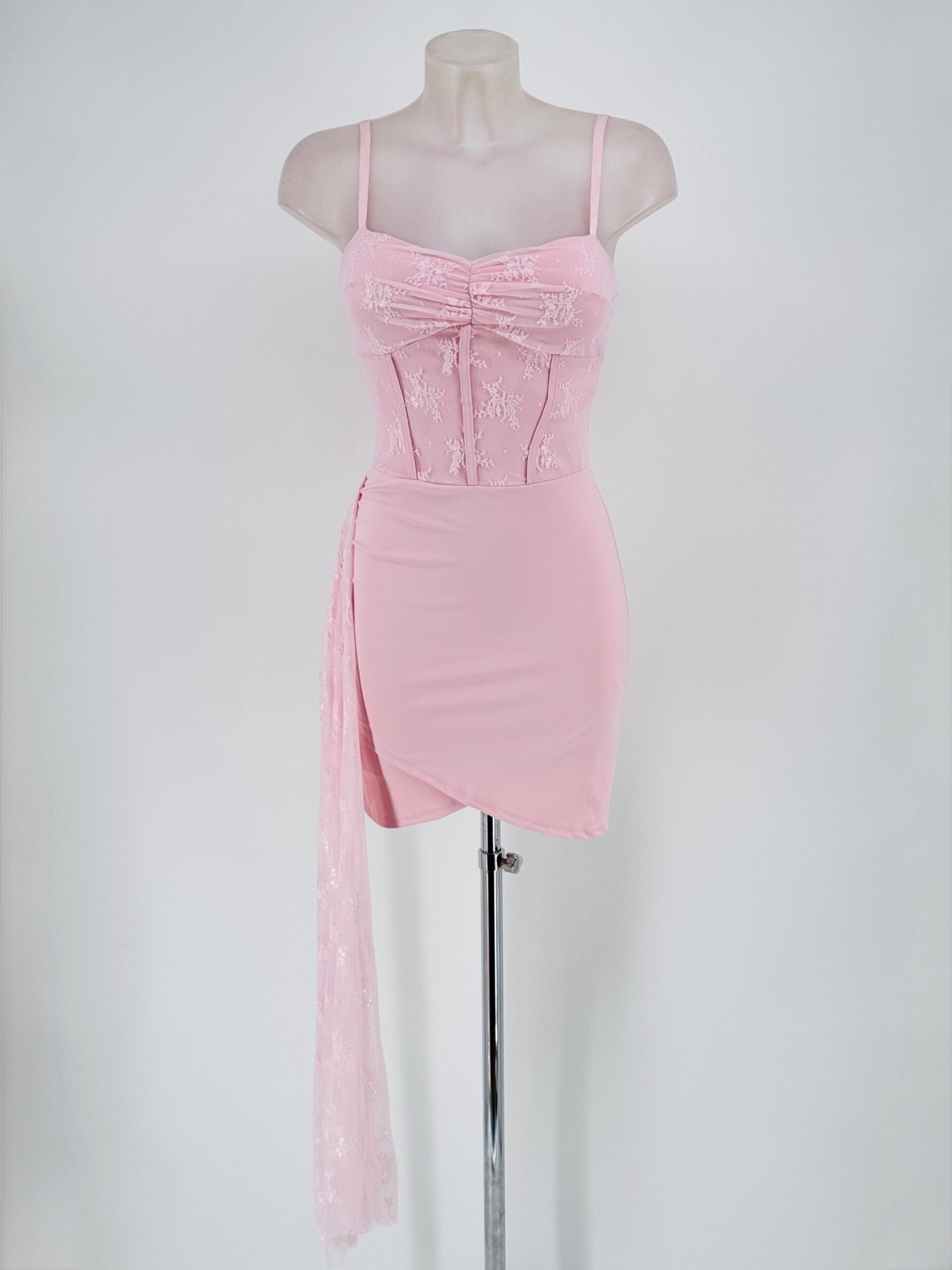 Vestido corto rosa elegante con efecto corsé y detalle lateral. Ideal para bodas, fiestas y eventos especiales.