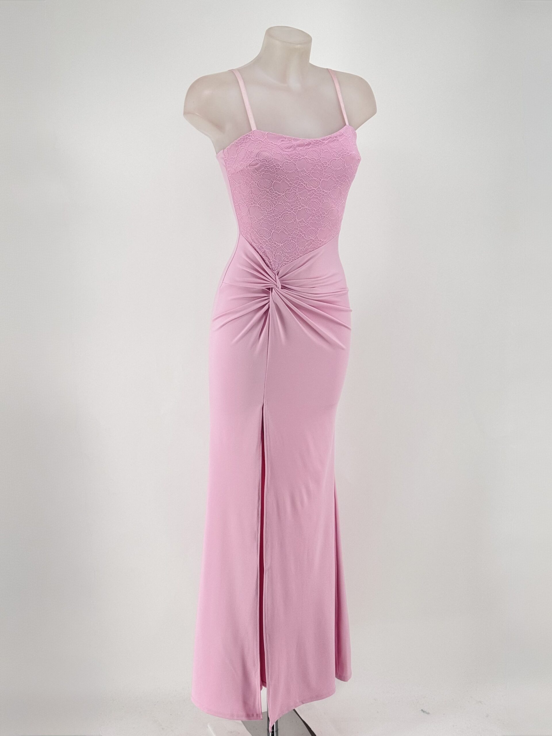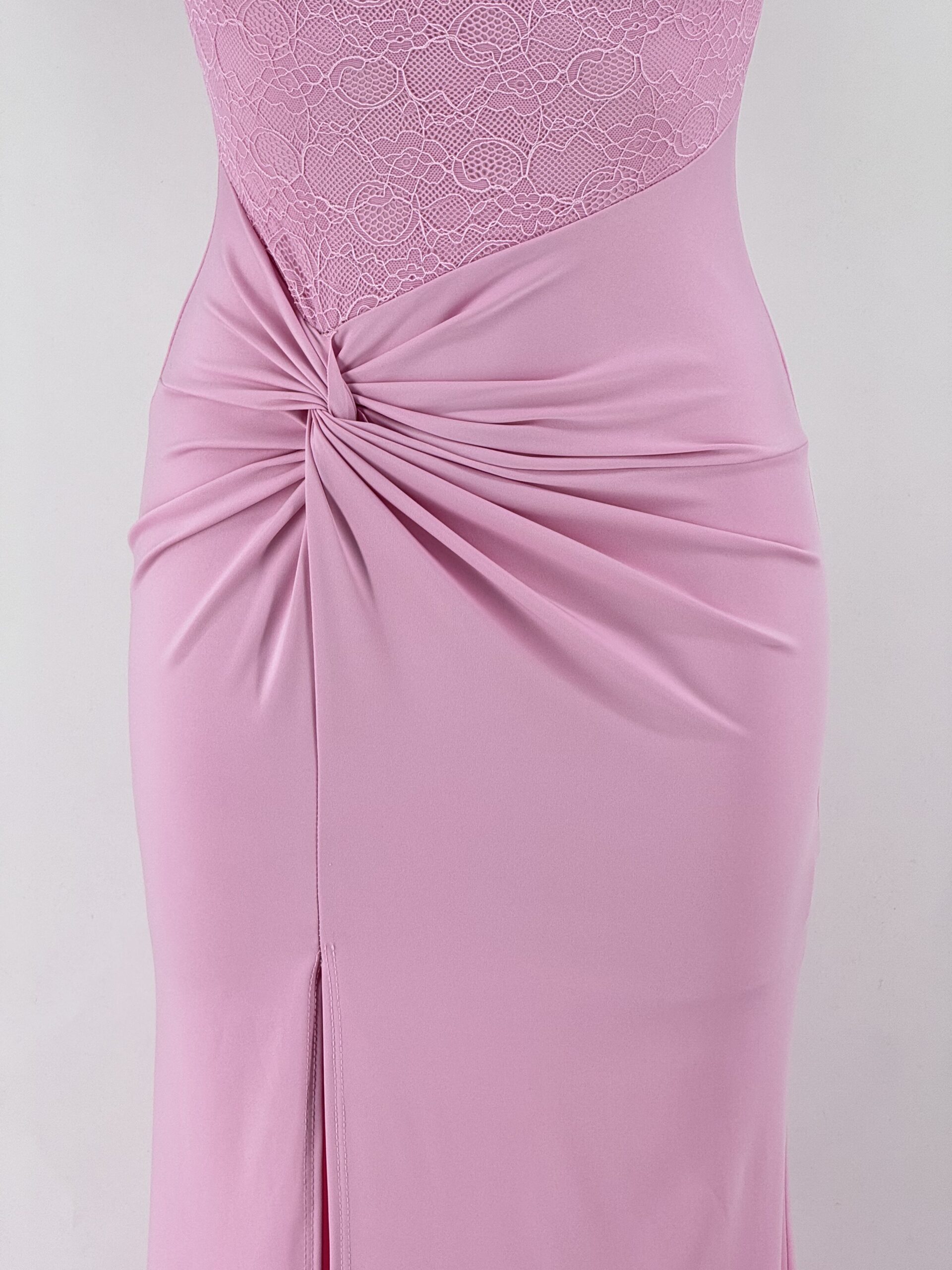 Vestido largo rosa de evento con cuerpo de encaje, drapeado lateral y abertura frontal. Sofisticado, favorecedor y elegante.