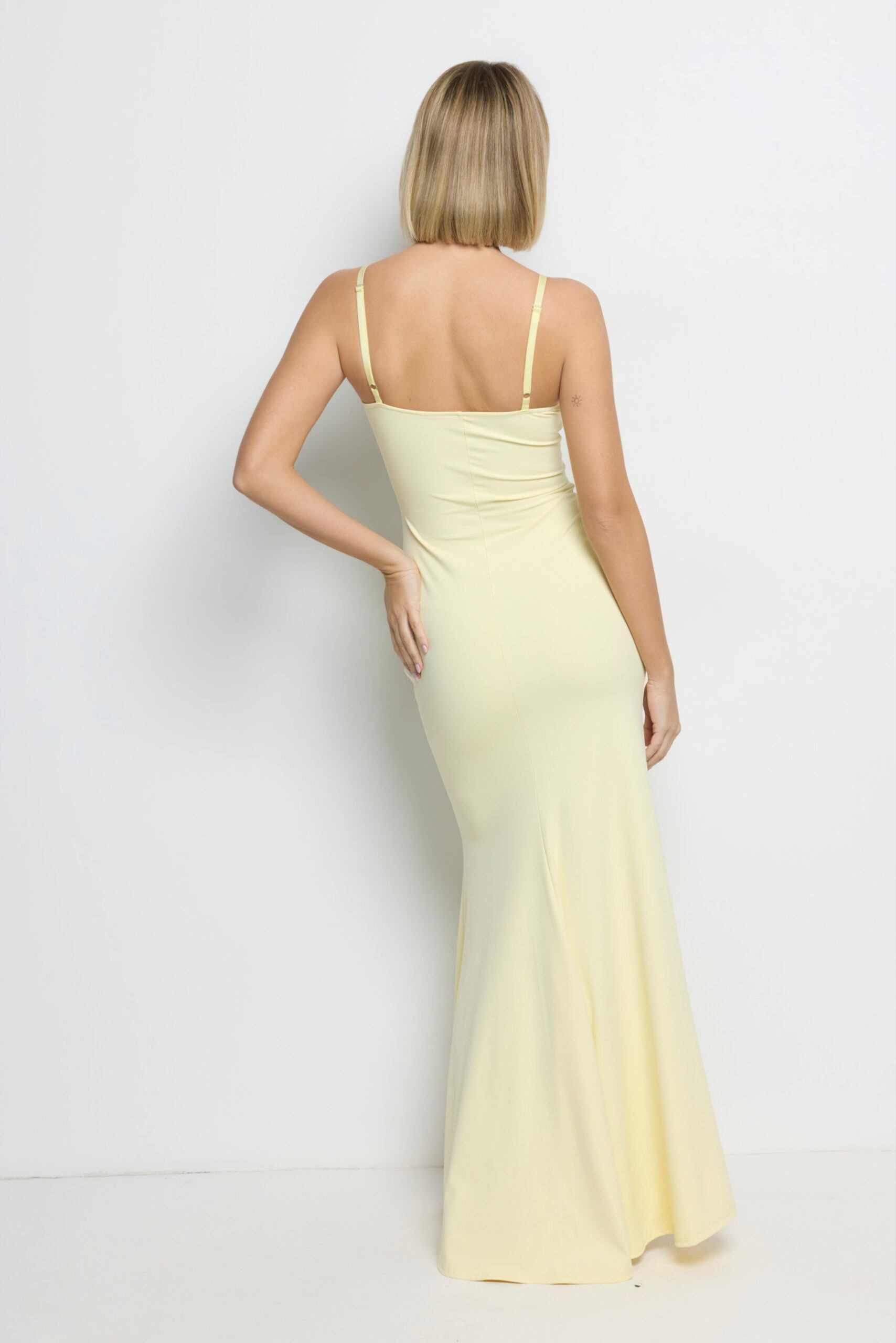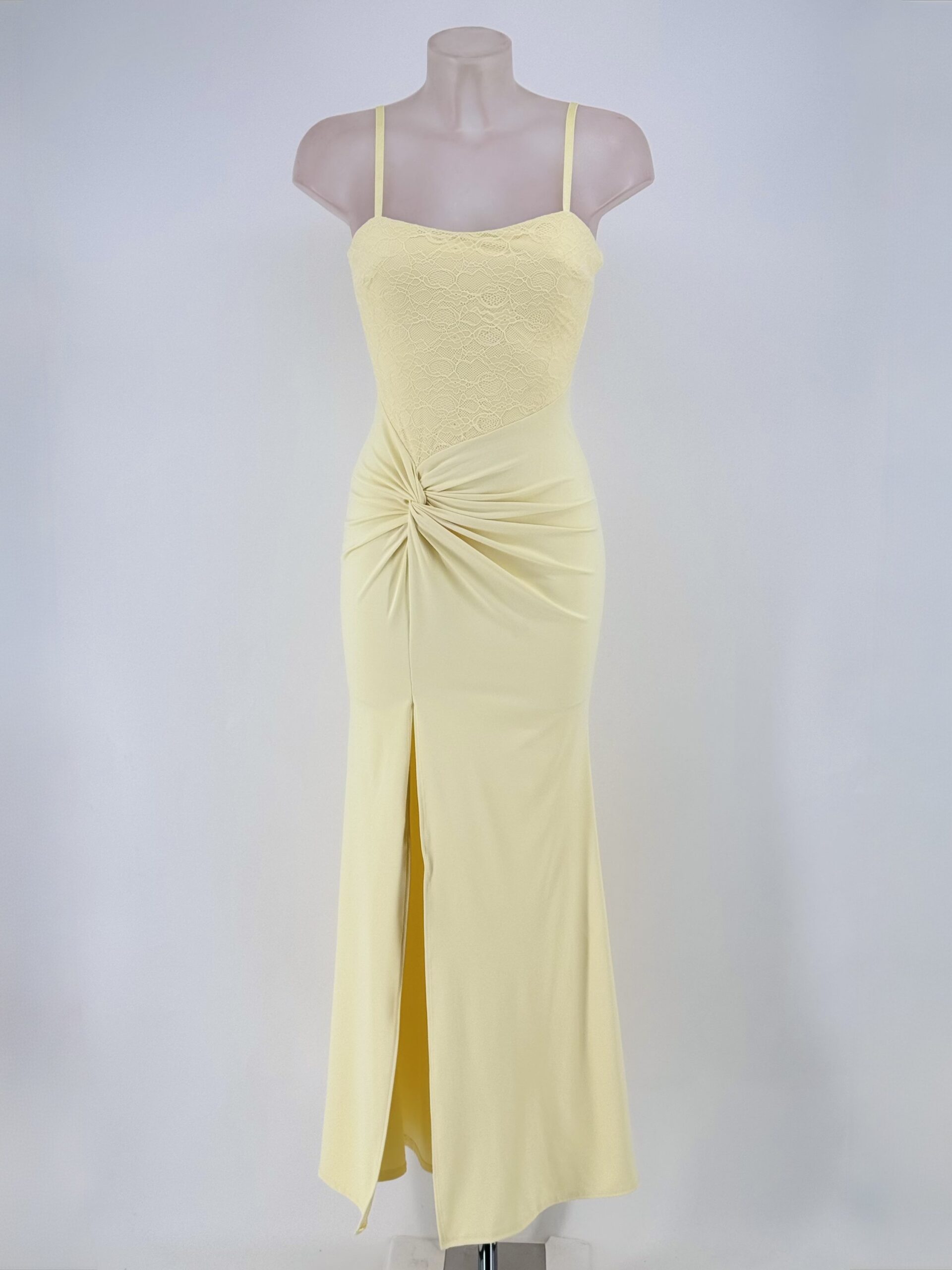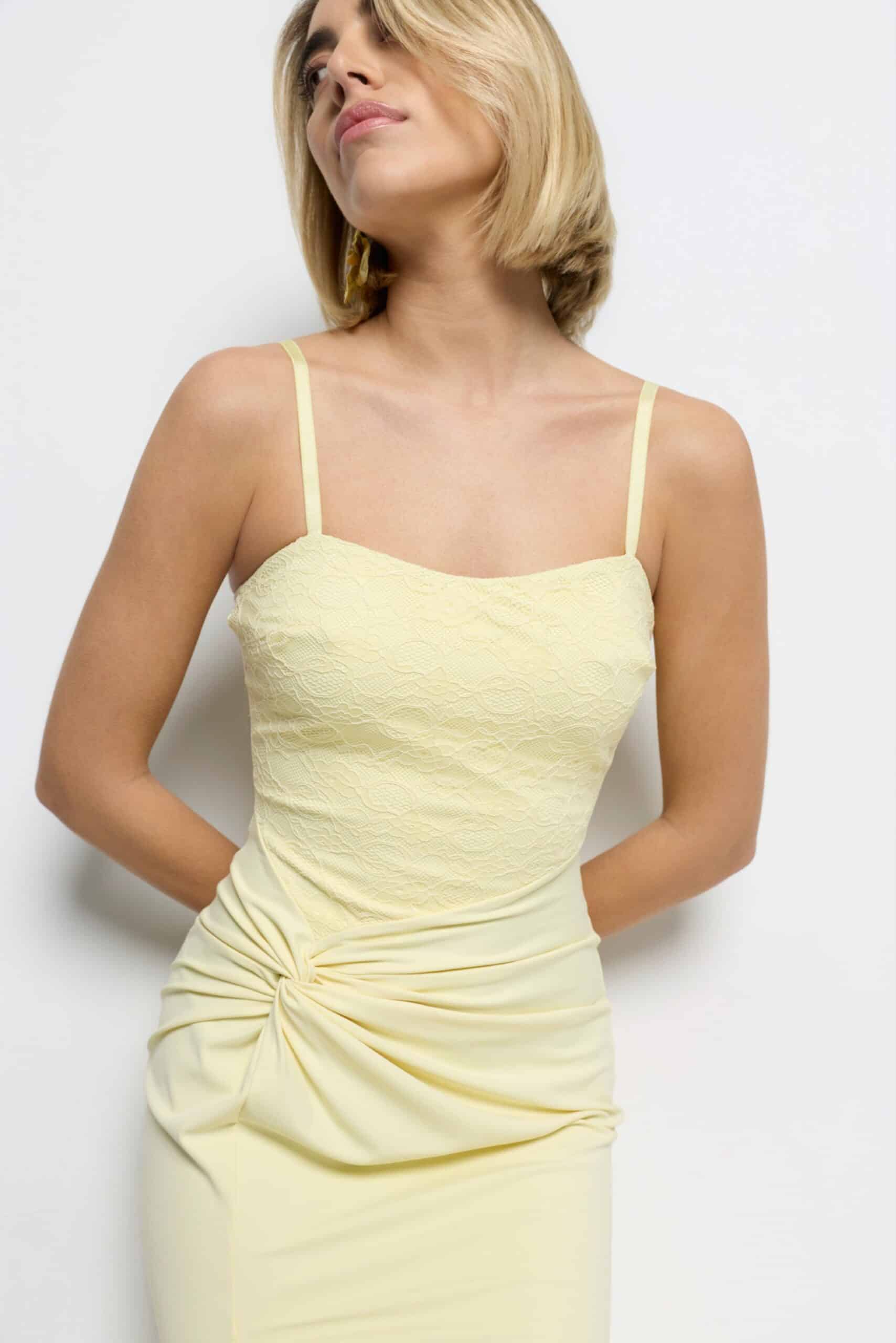El cuerpo superior de encaje con tirantes finos realza el busto con sutileza y aporta un toque romántico muy cuidado. El drapeado lateral en la cintura estiliza la figura y define las curvas de forma favorecedora, mientras que la abertura frontal en la falda alarga visualmente la pierna y aporta movimiento y sensualidad al caminar.