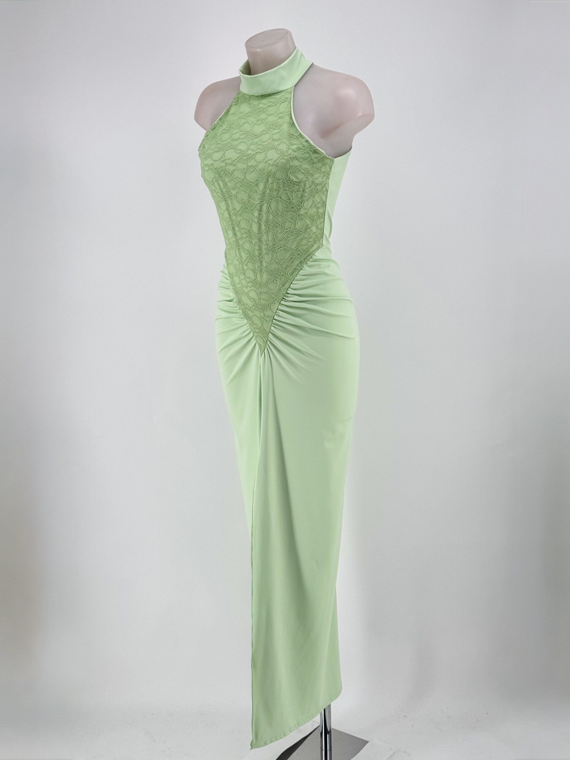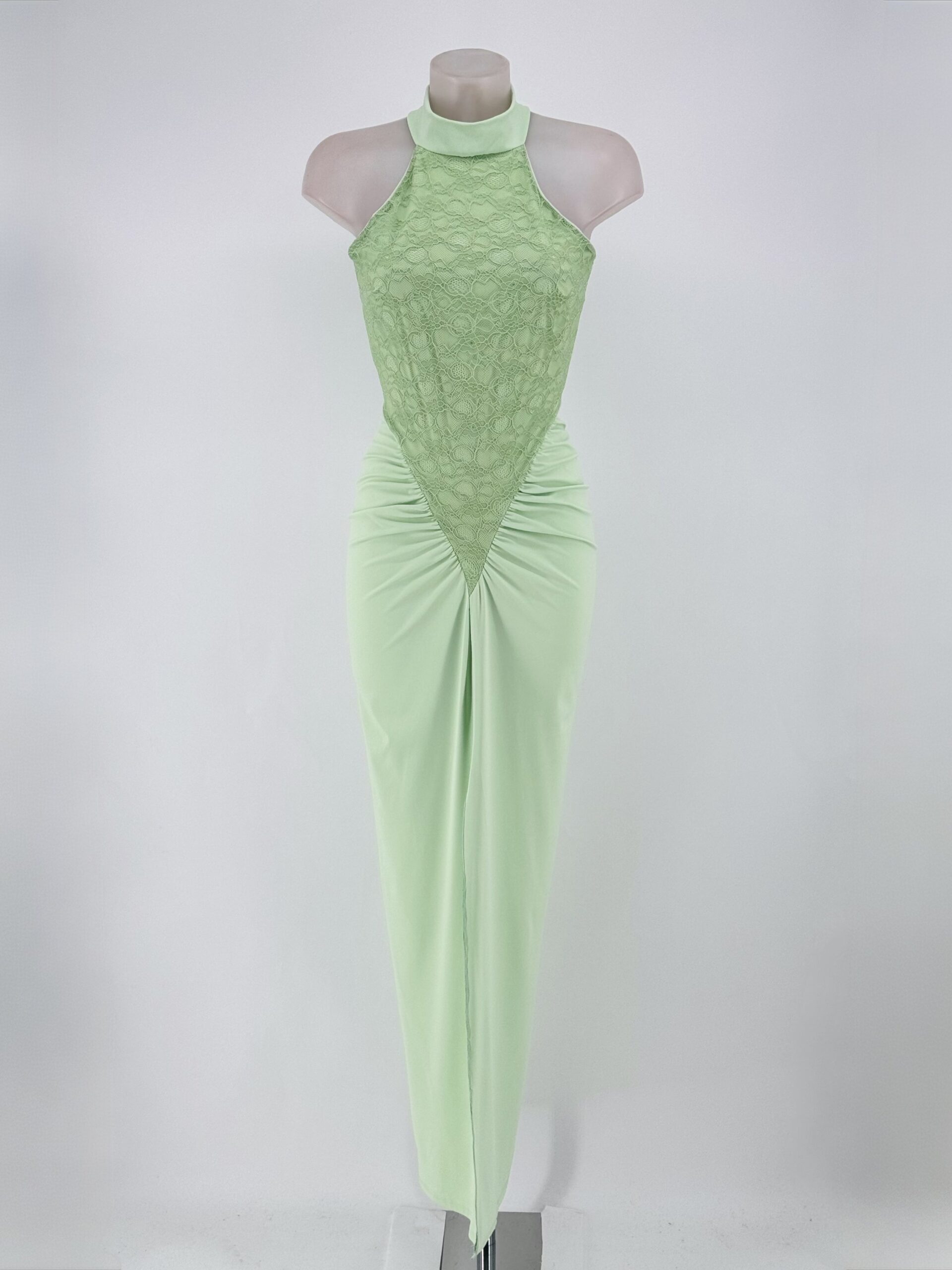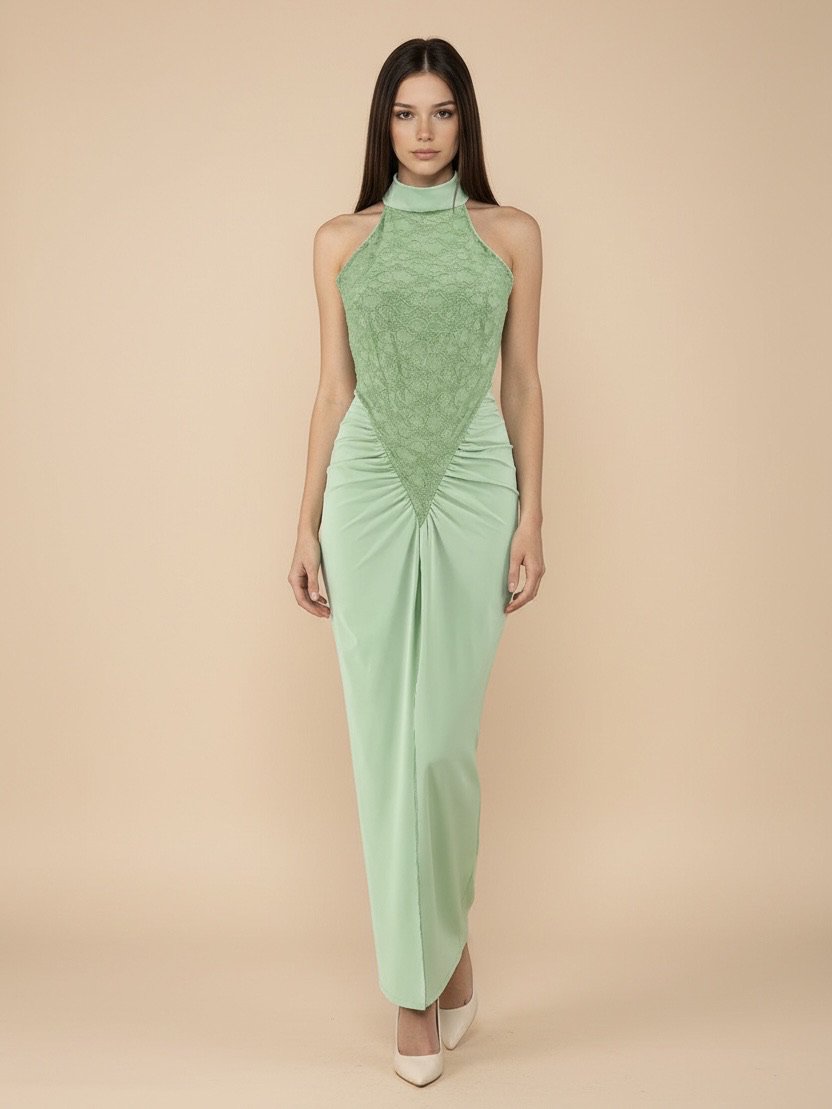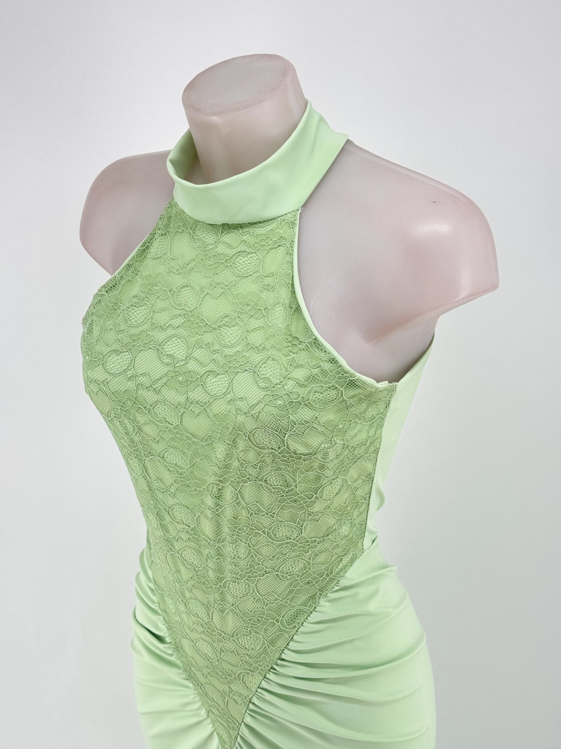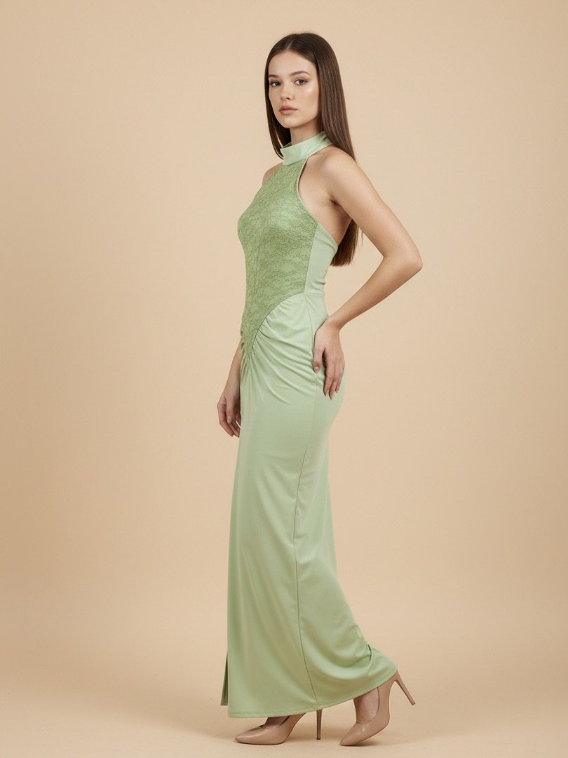 Vestido largo verde salvia de evento con escote halter, cuerpo de encaje y drapeado favorecedor. Elegante y muy estilizador.