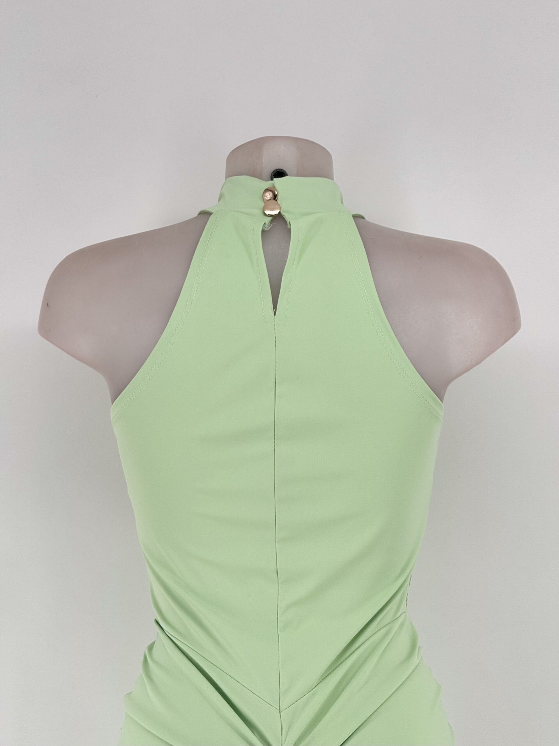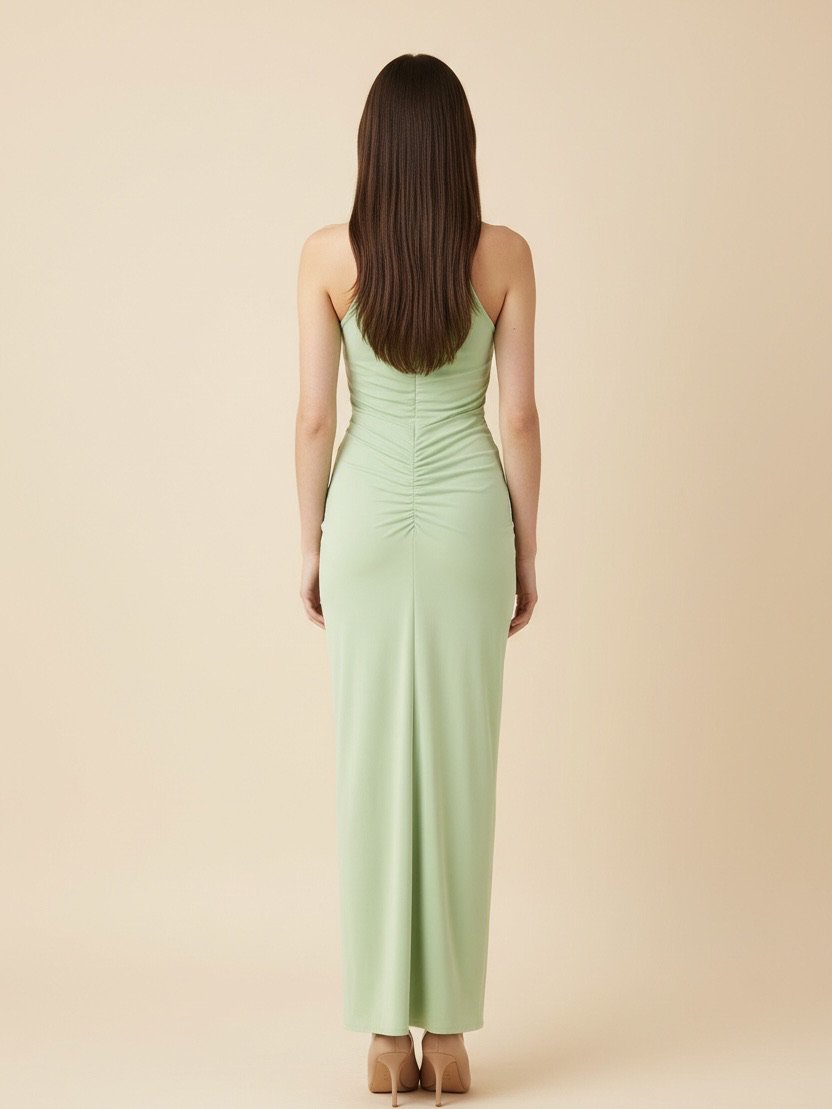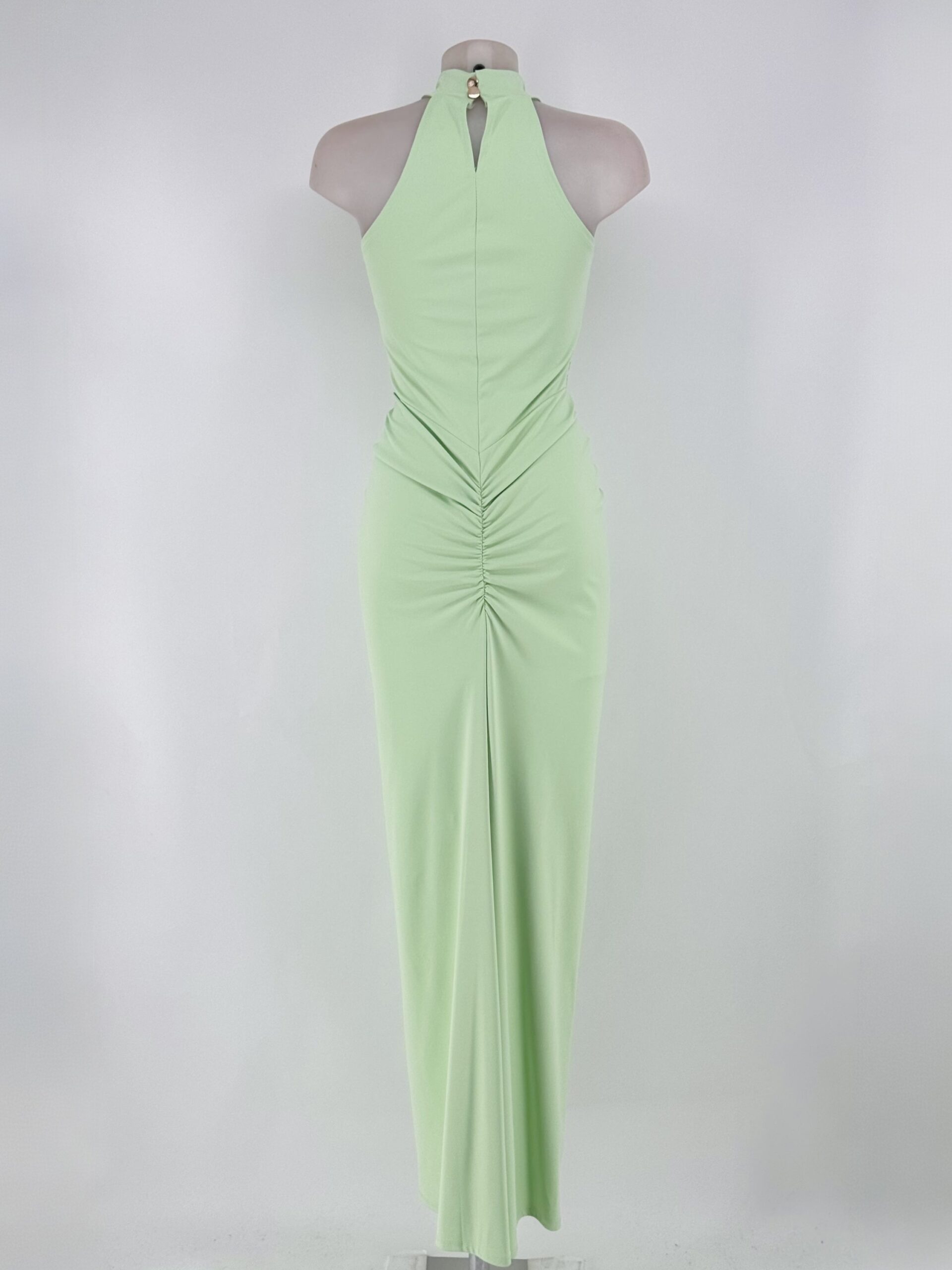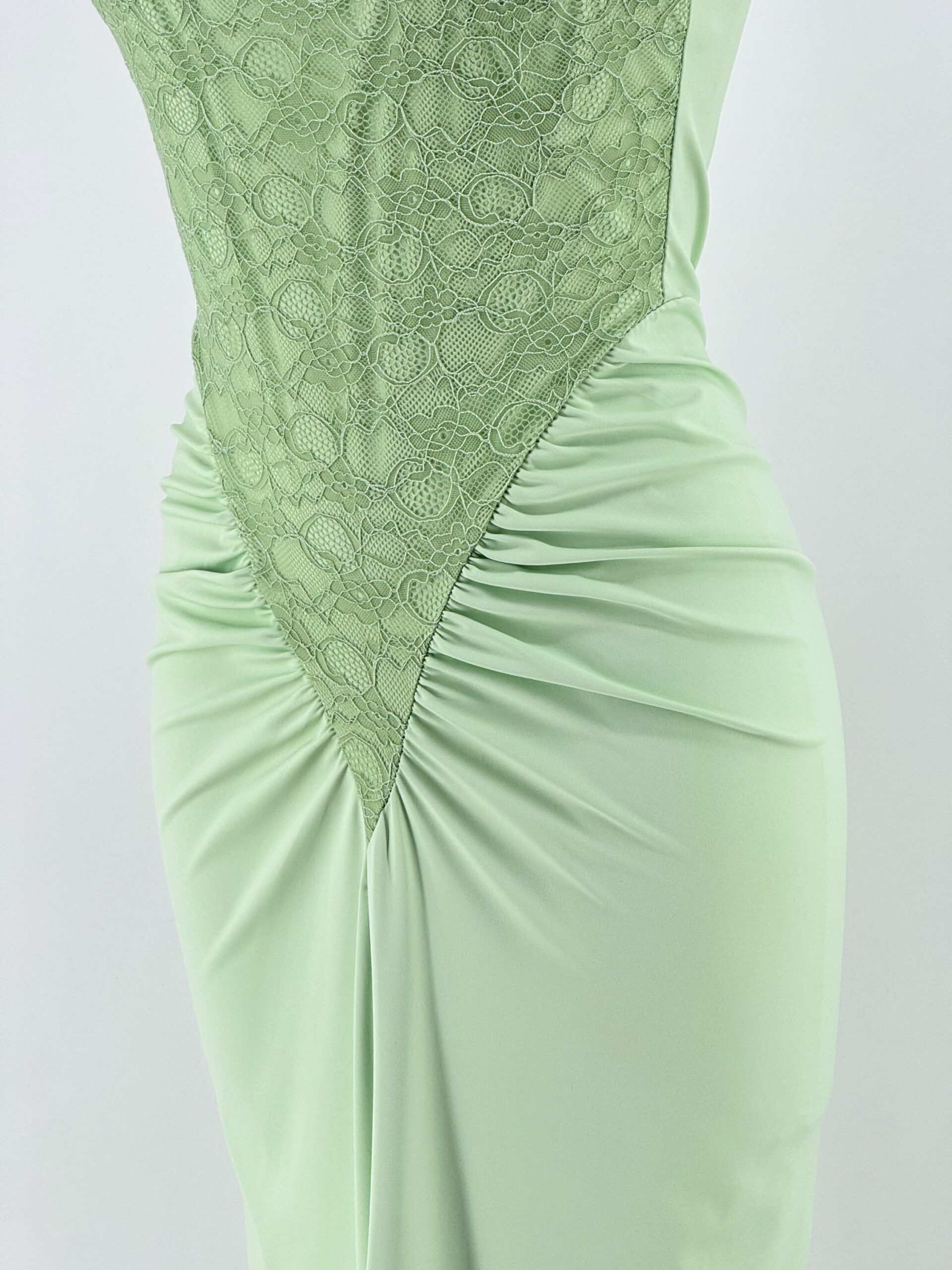 Vestido largo verde salvia de evento con escote halter, cuerpo de encaje y drapeado favorecedor. Elegante y muy estilizador.