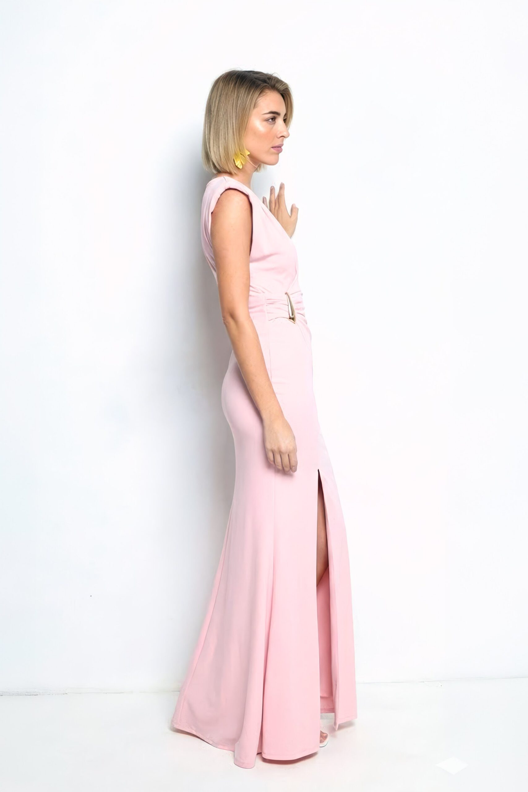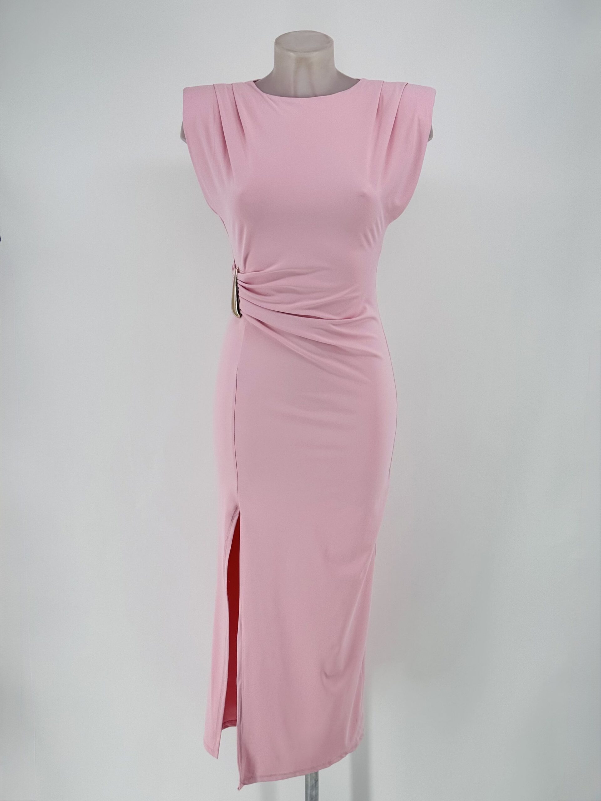 Vestido rosa midi elegante con hombreras, drapeado lateral y abertura frontal. Ideal para bodas y eventos especiales.