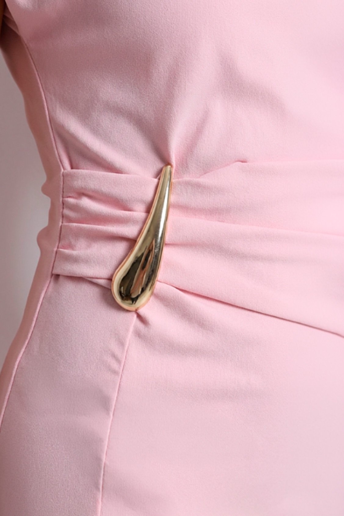 El drapeado lateral con detalle metálico estiliza la cintura y crea un efecto favorecedor que realza la figura sin marcar en exceso. La abertura frontal añade movimiento y un toque sofisticado, perfecto para eventos donde quieres destacar con discreción y carácter.