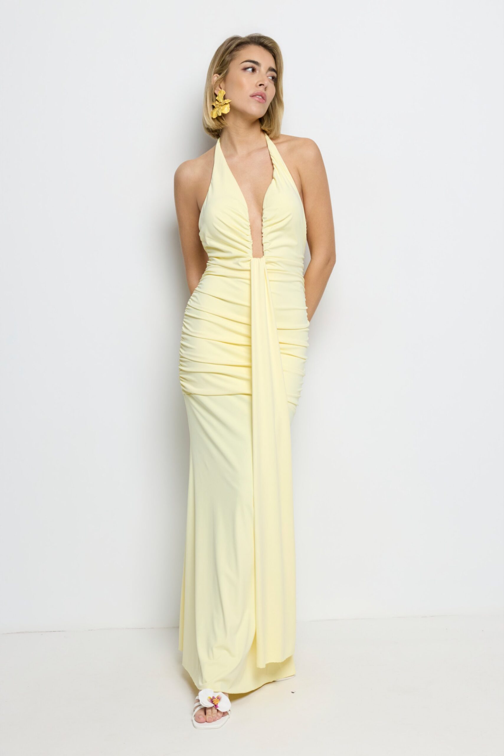 Vestido largo amarillo mantequilla con escote profundo y efecto fruncido. Ideal para bodas y eventos especiales.