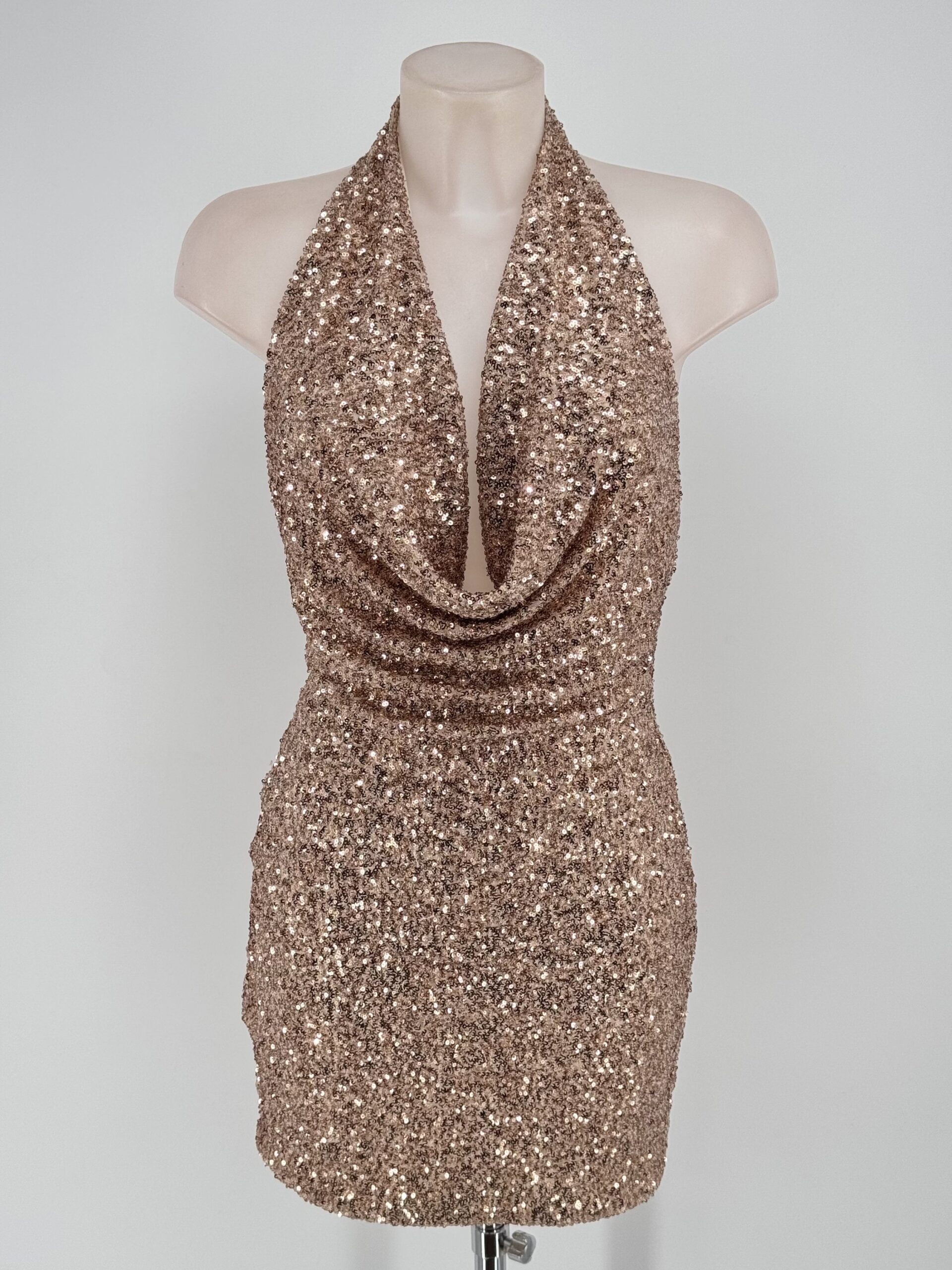 Vestido mini halter con lentejuelas, disponible en dorado y negro. Brillante, elegante y perfecto para fiestas y noches especiales.