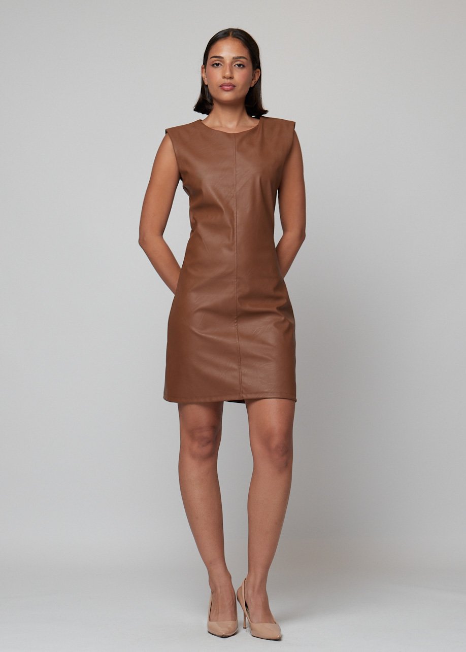 Con corte recto, hombros marcados y tejido efecto cuero suave, este vestido crea una silueta estructurada y femenina. Combínalo con tacones para un look sofisticado o con botas para un aire más urbano.