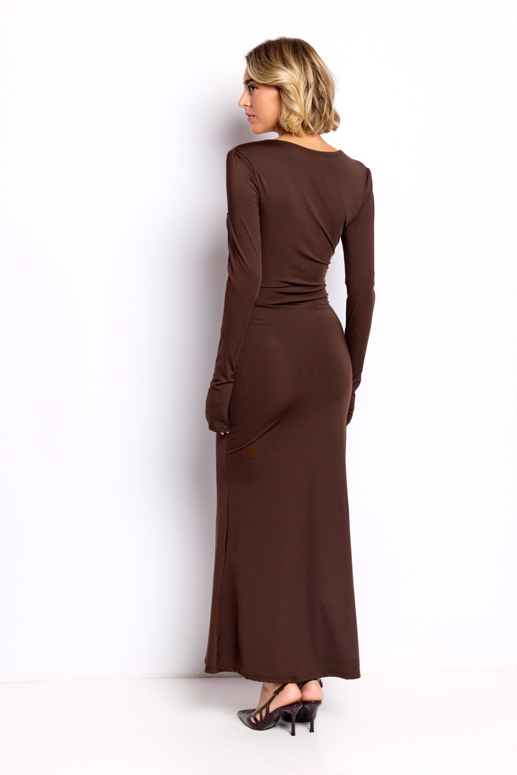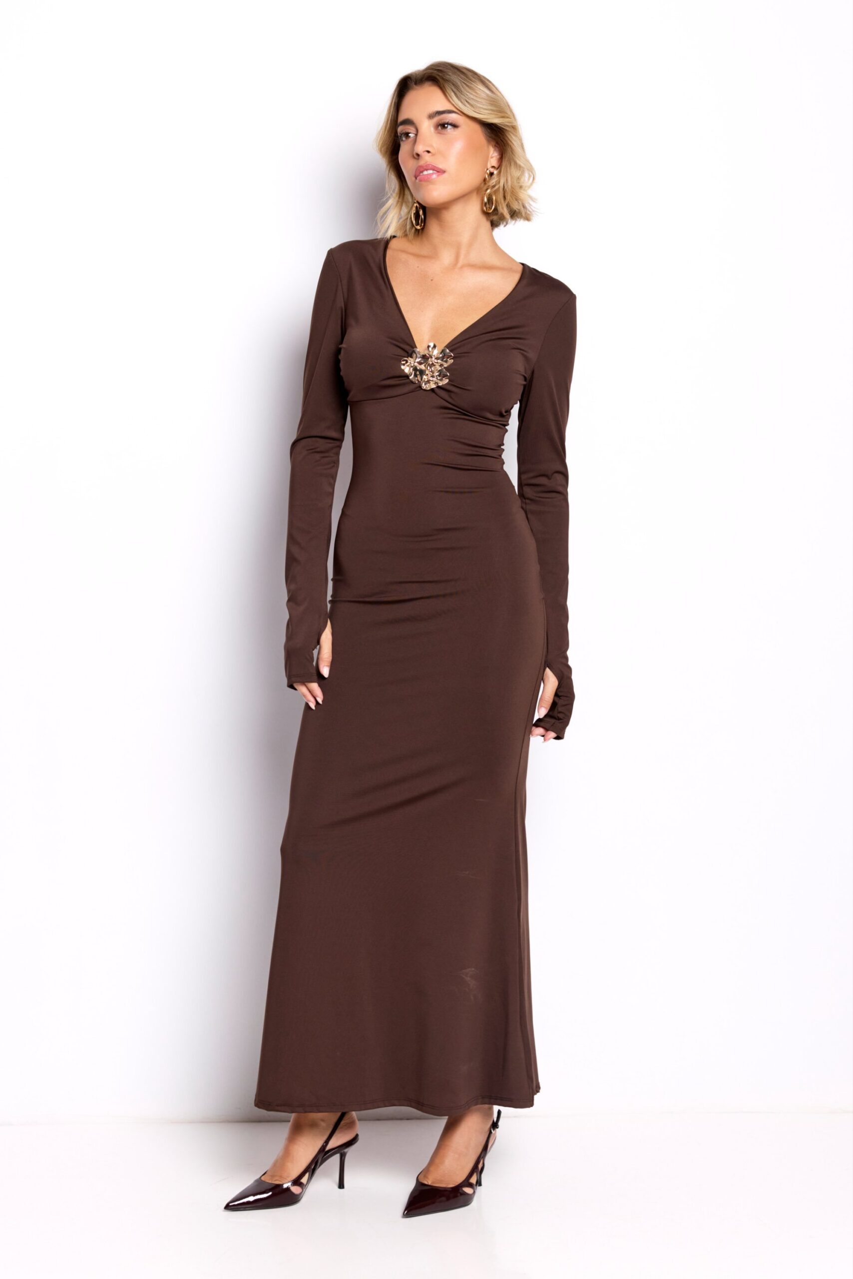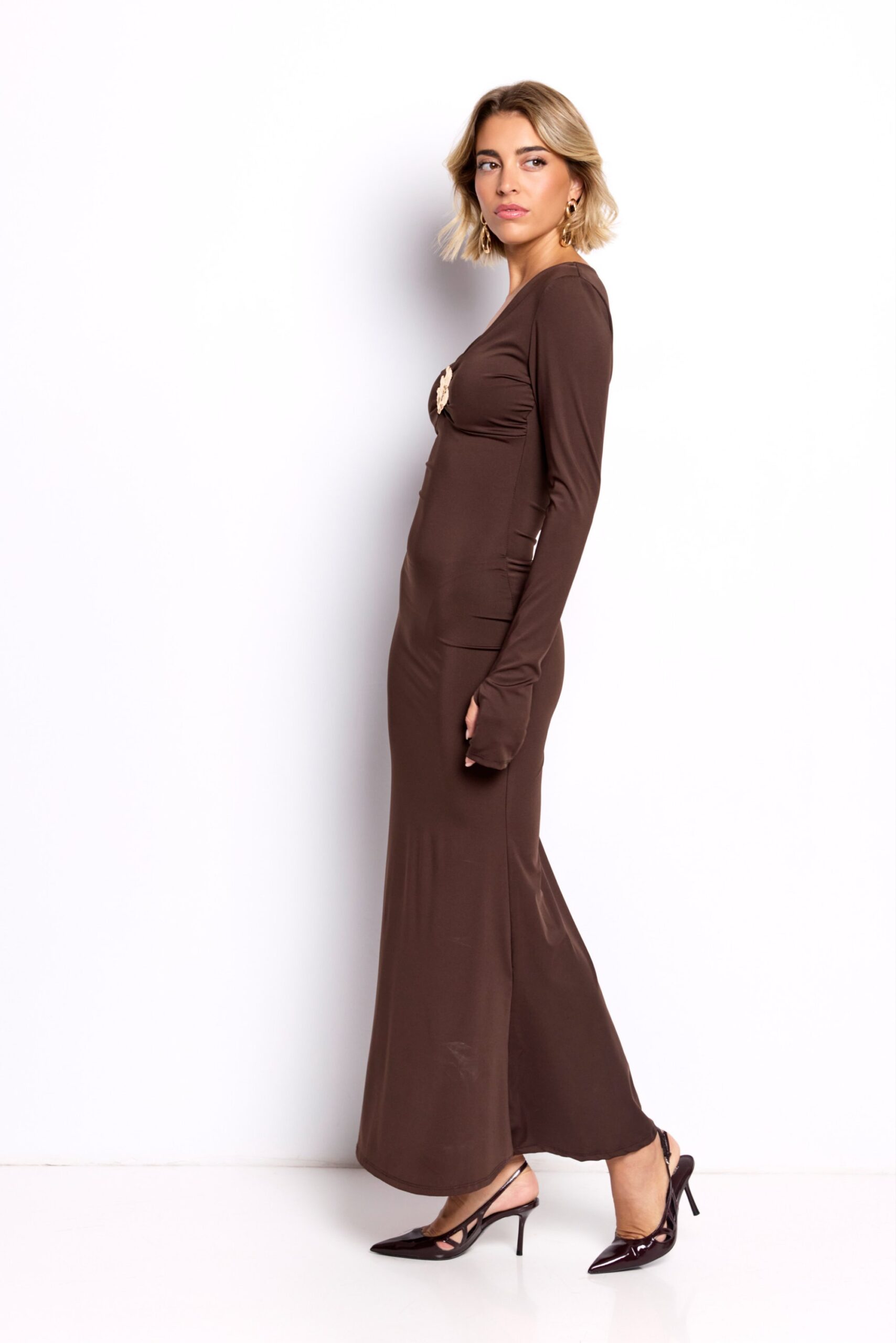 Vestido largo marrón chocolate con escote profundo y detalle metálico. Elegante, moderno y con aire griego.