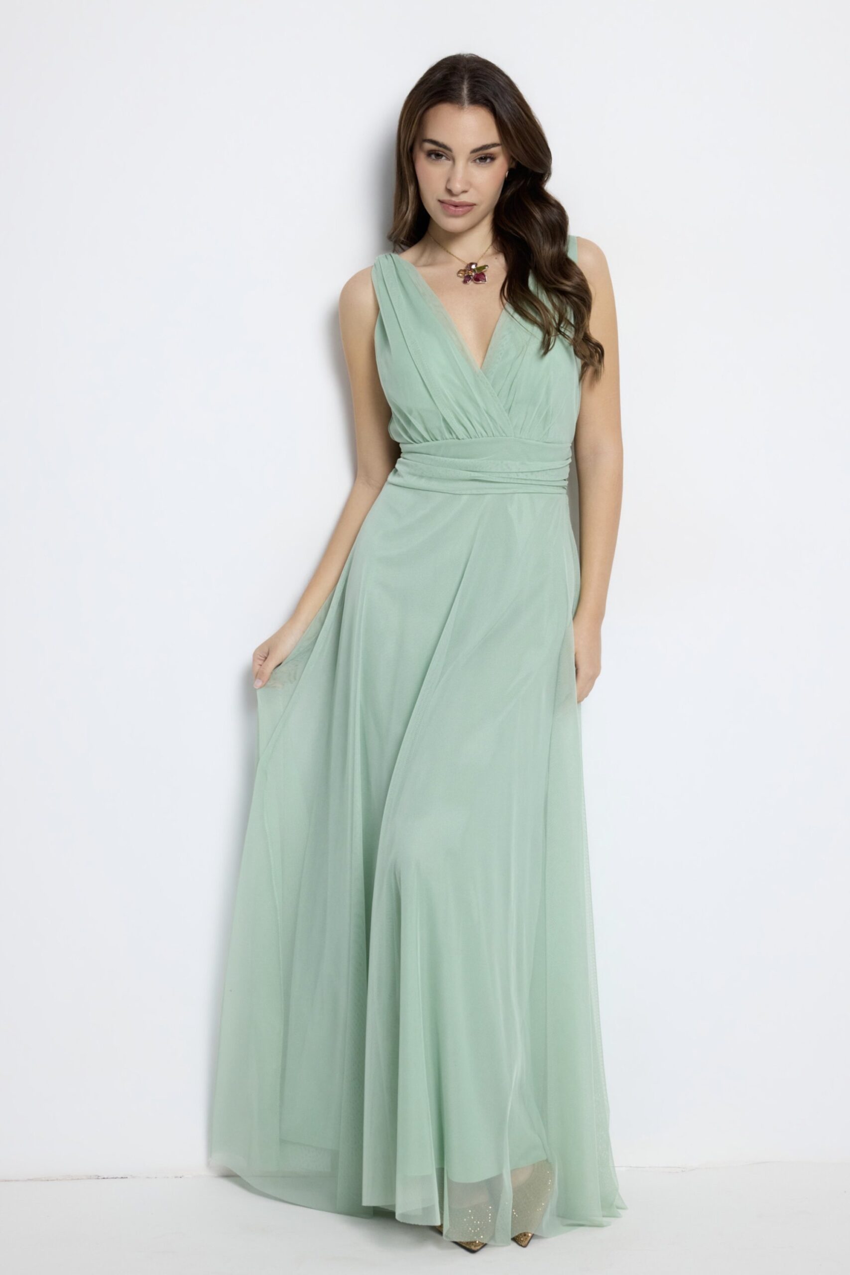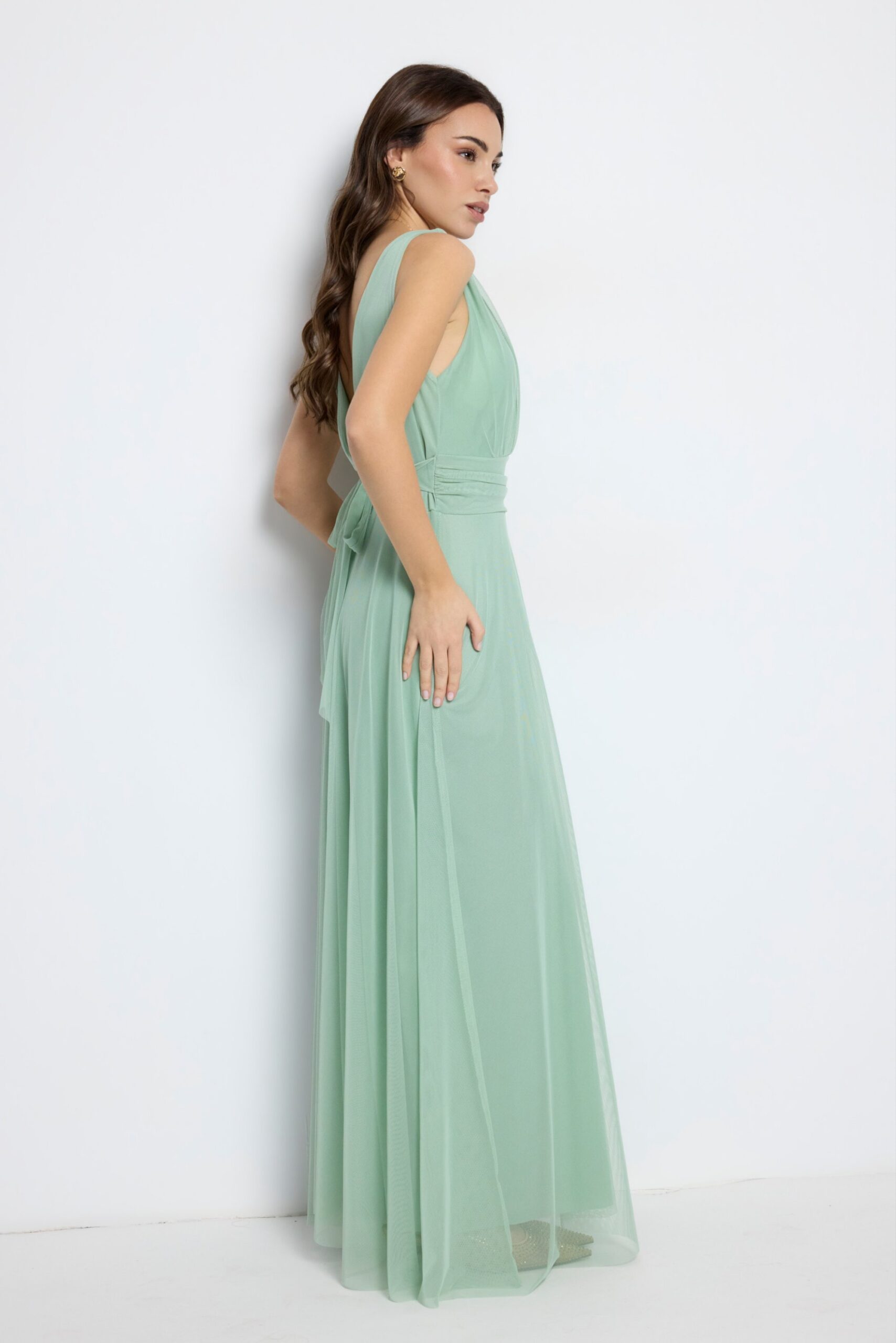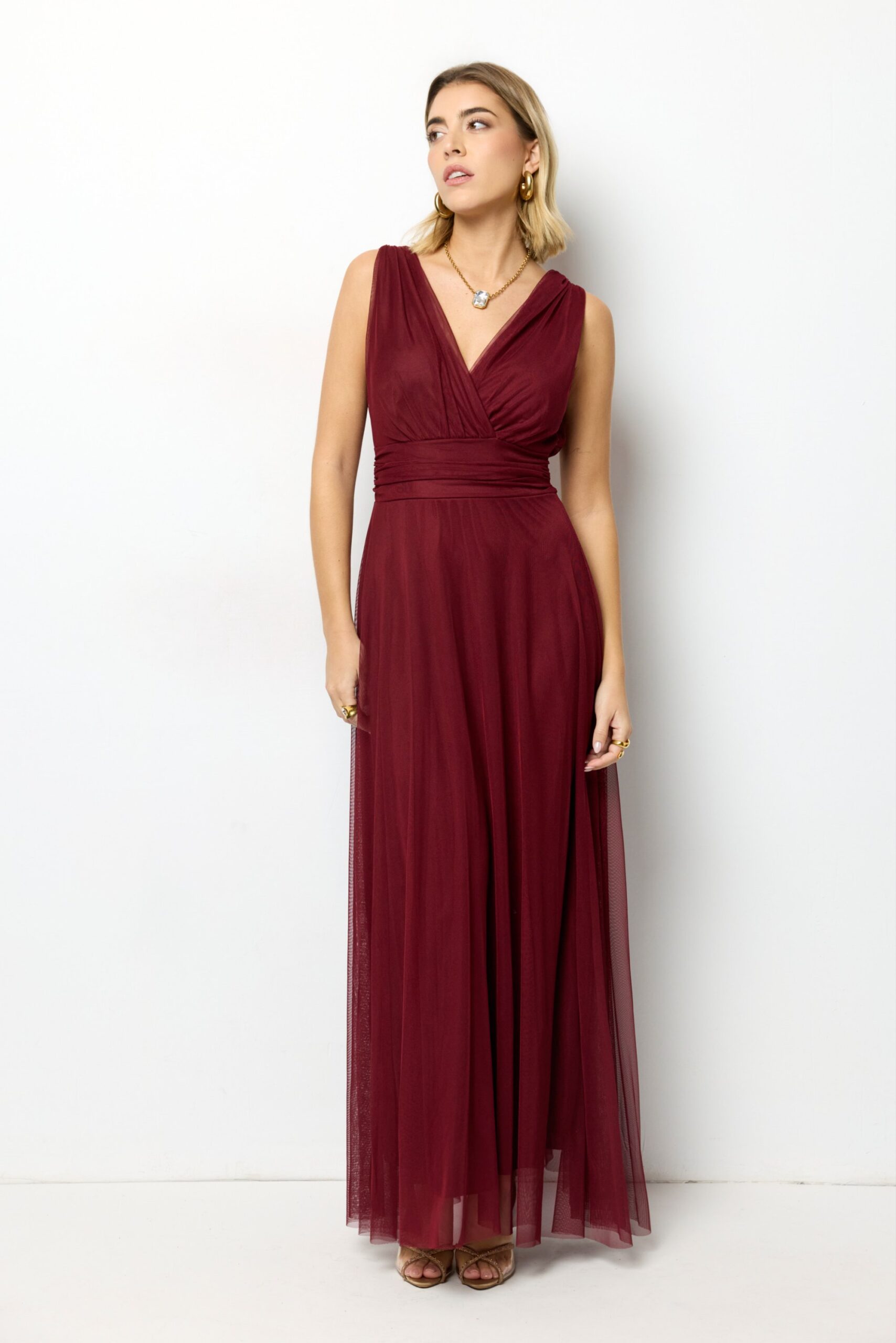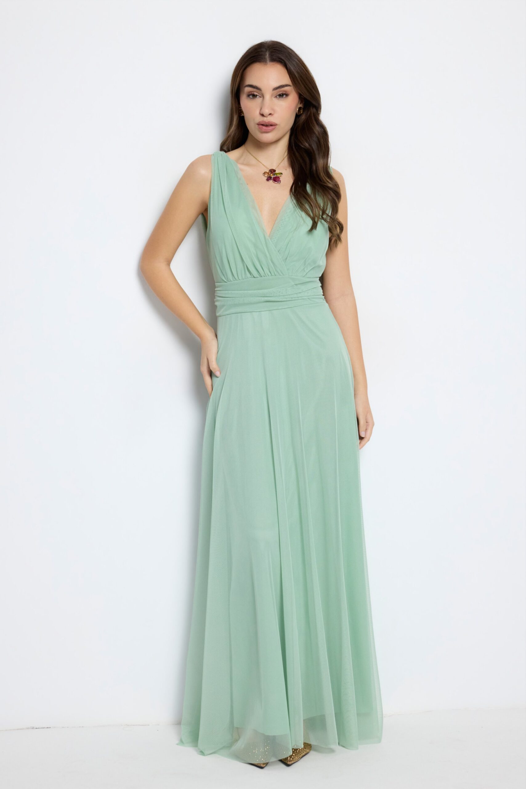 Vestido largo rosa empolvado Amber, ideal para boda, bautizo o comunión. Diseño elegante y fluido que realza la silueta.
