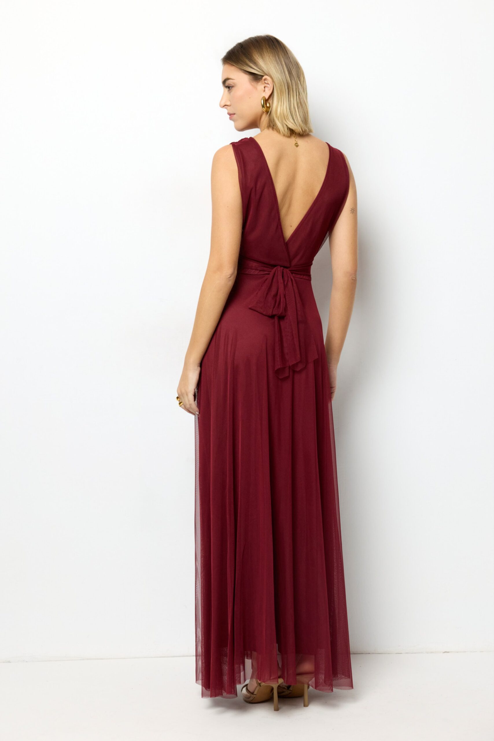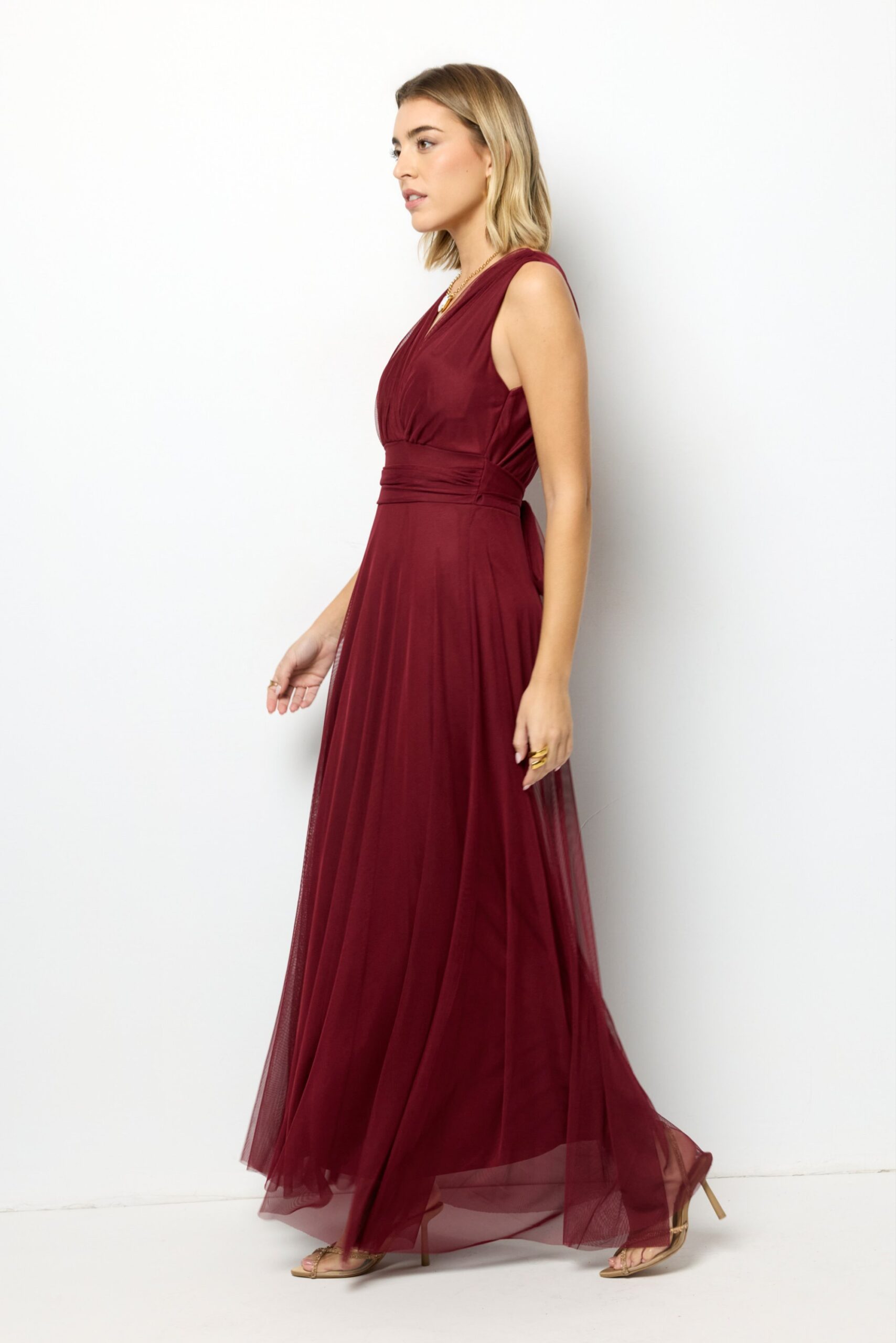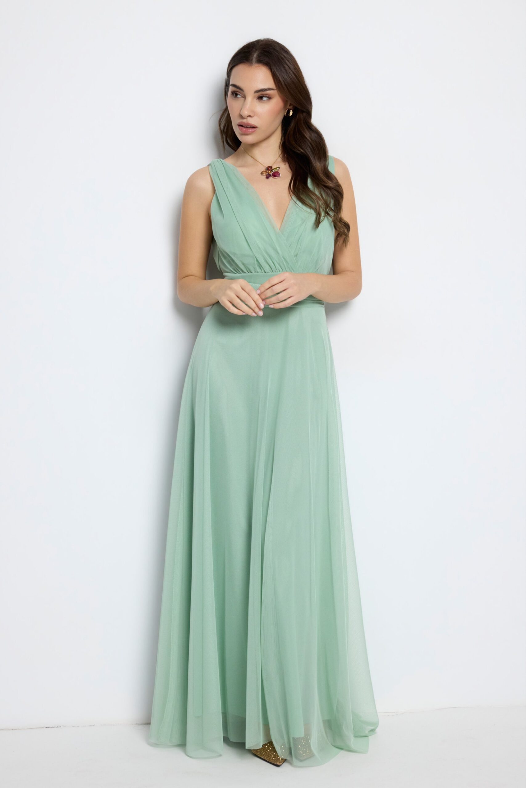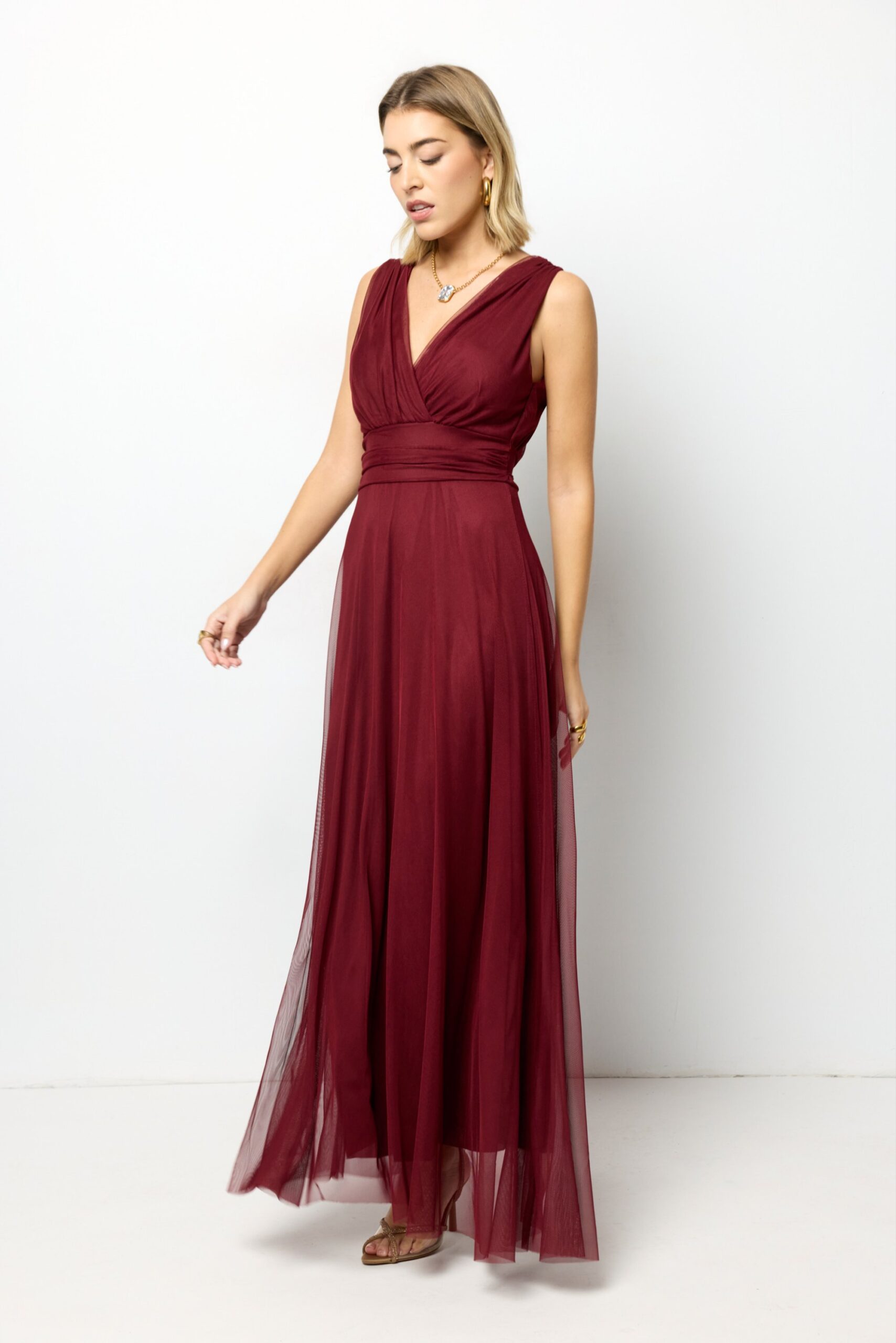Vestido largo rosa empolvado Amber, ideal para boda, bautizo o comunión. Diseño elegante y fluido que realza la silueta.