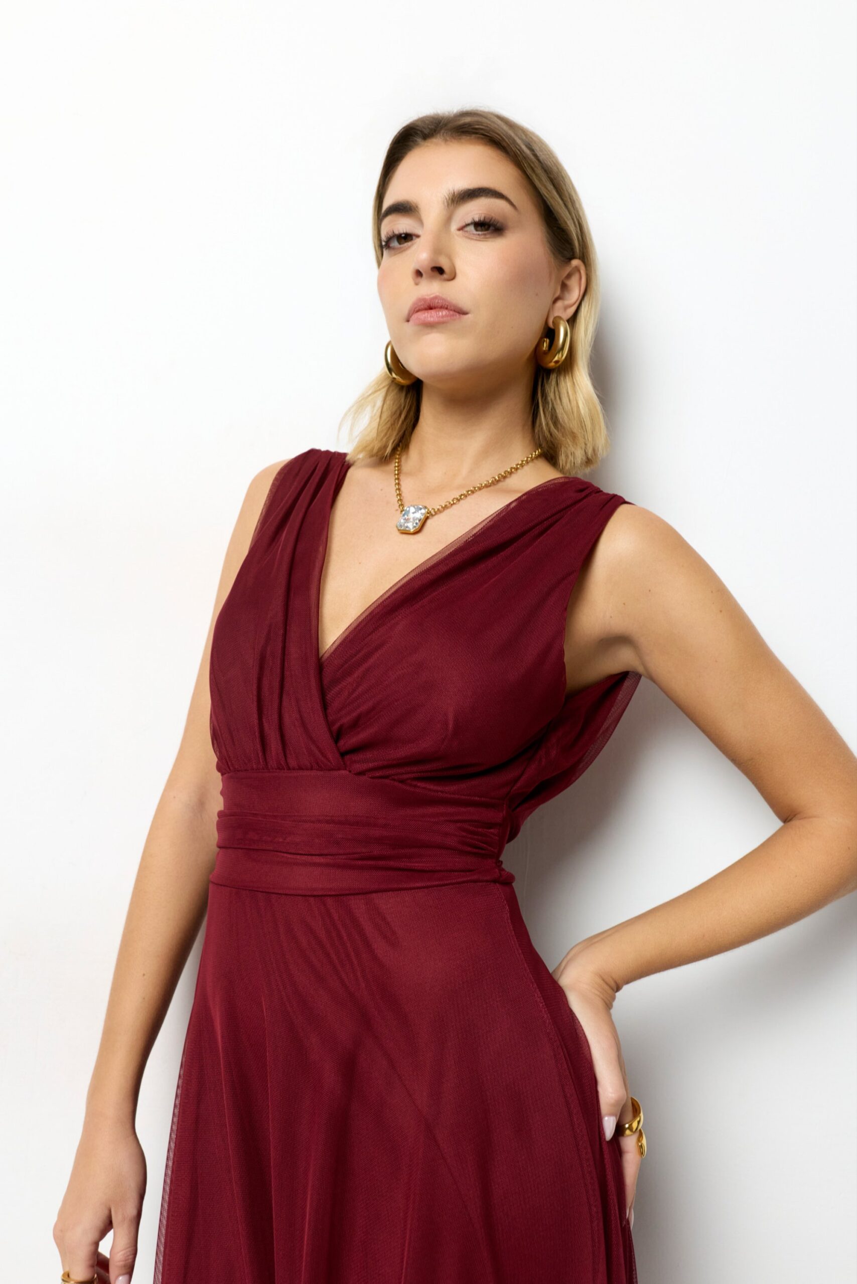 El Vestido Amber en color rosa empolvado es la definición de elegancia y feminidad. Con un corte largo y fluido, escote cruzado y cintura ceñida, estiliza la figura aportando movimiento y delicadeza en cada paso.