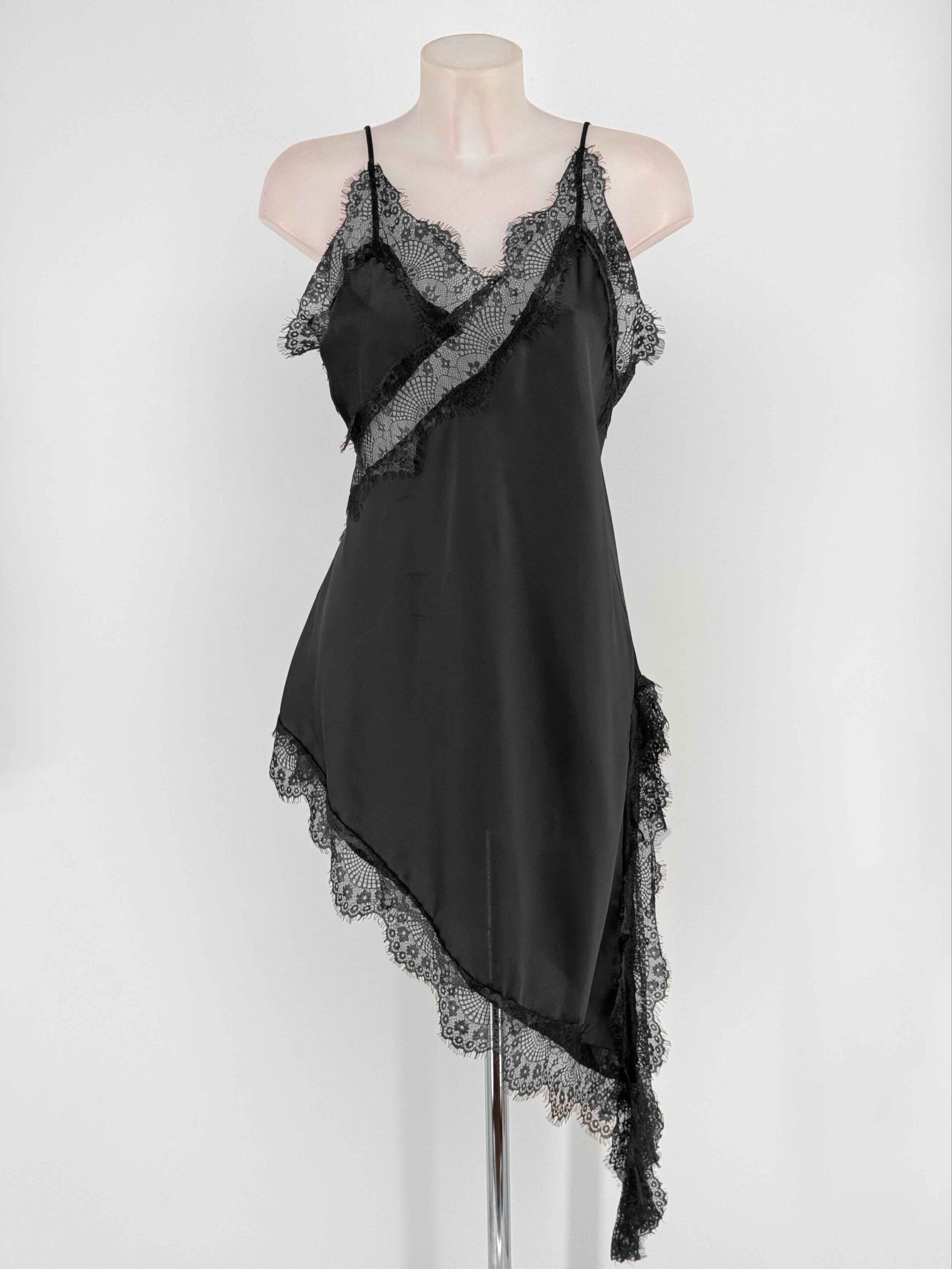 Con su corte asimétrico, tirantes finos y detalle de encaje en el escote y el bajo, realza la figura con delicadeza y feminidad. Su tejido fluido garantiza una caída perfecta, ofreciendo comodidad sin renunciar al glamour.