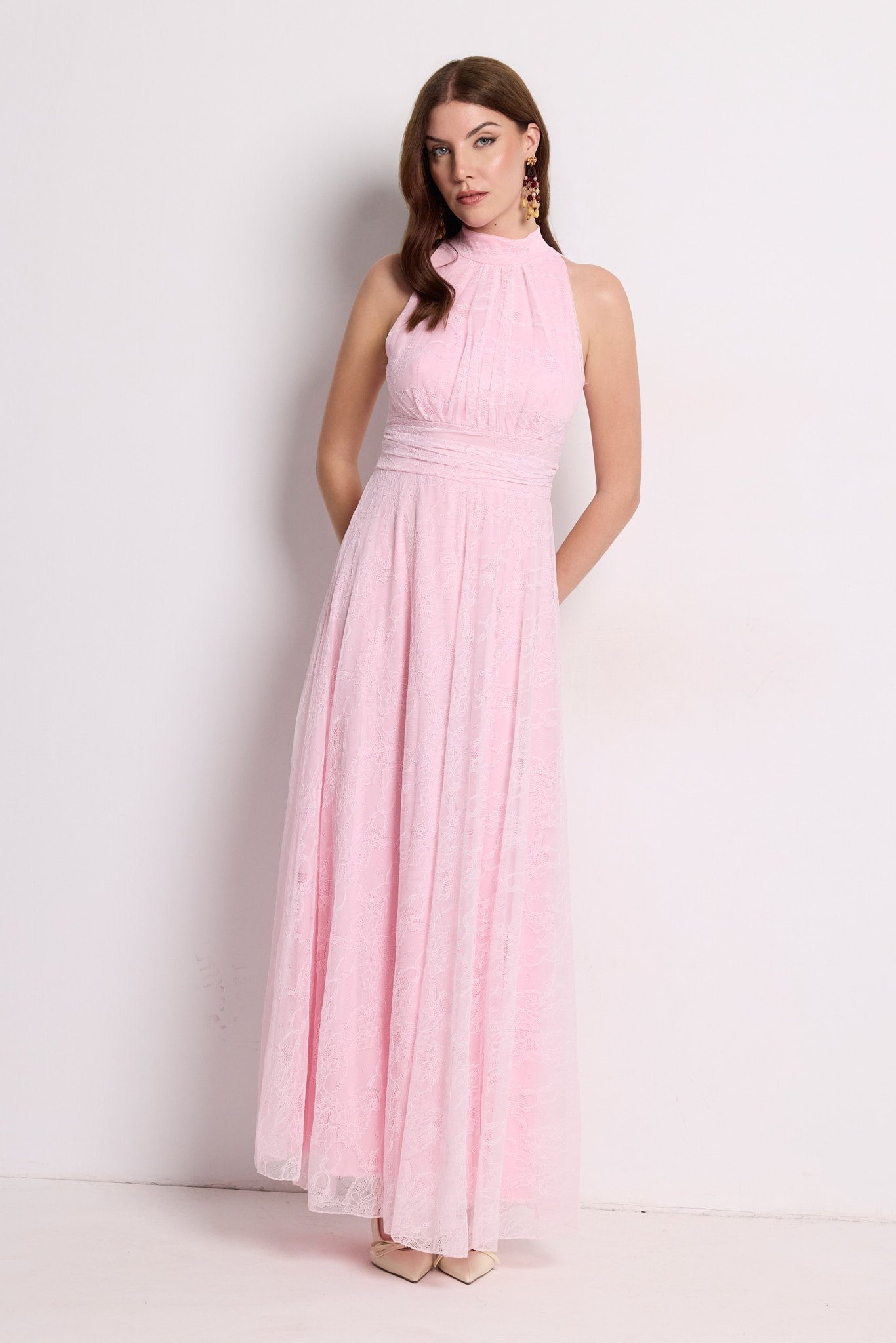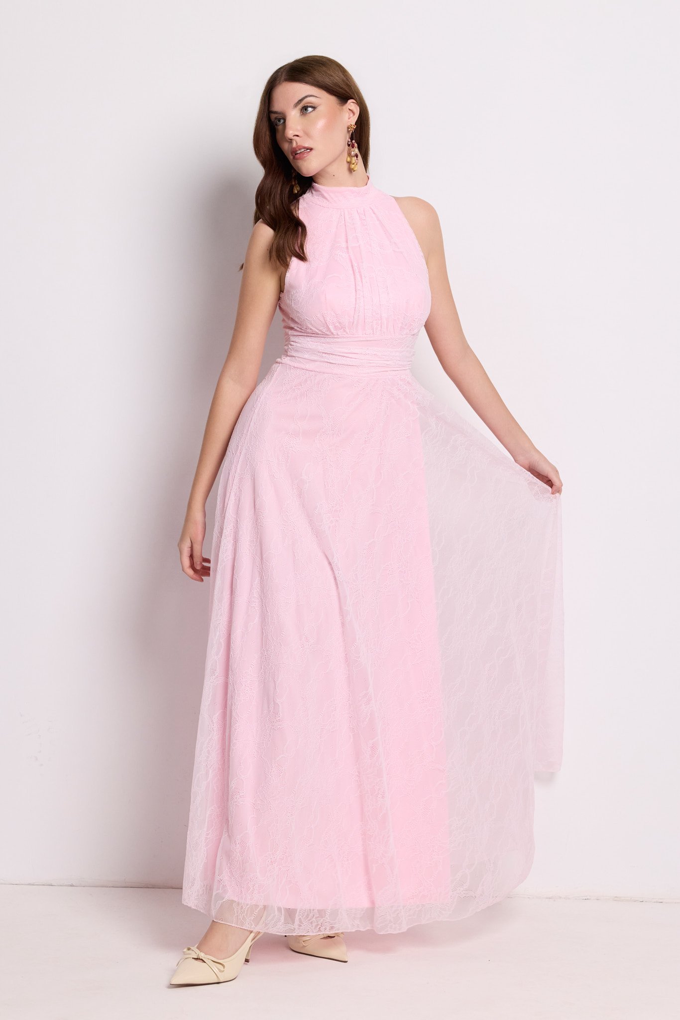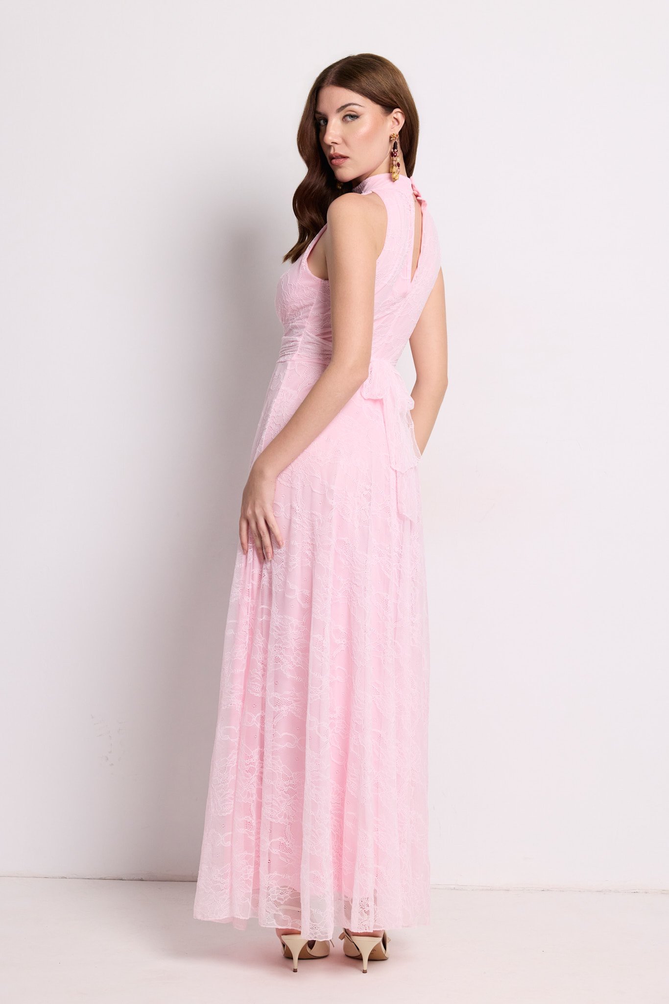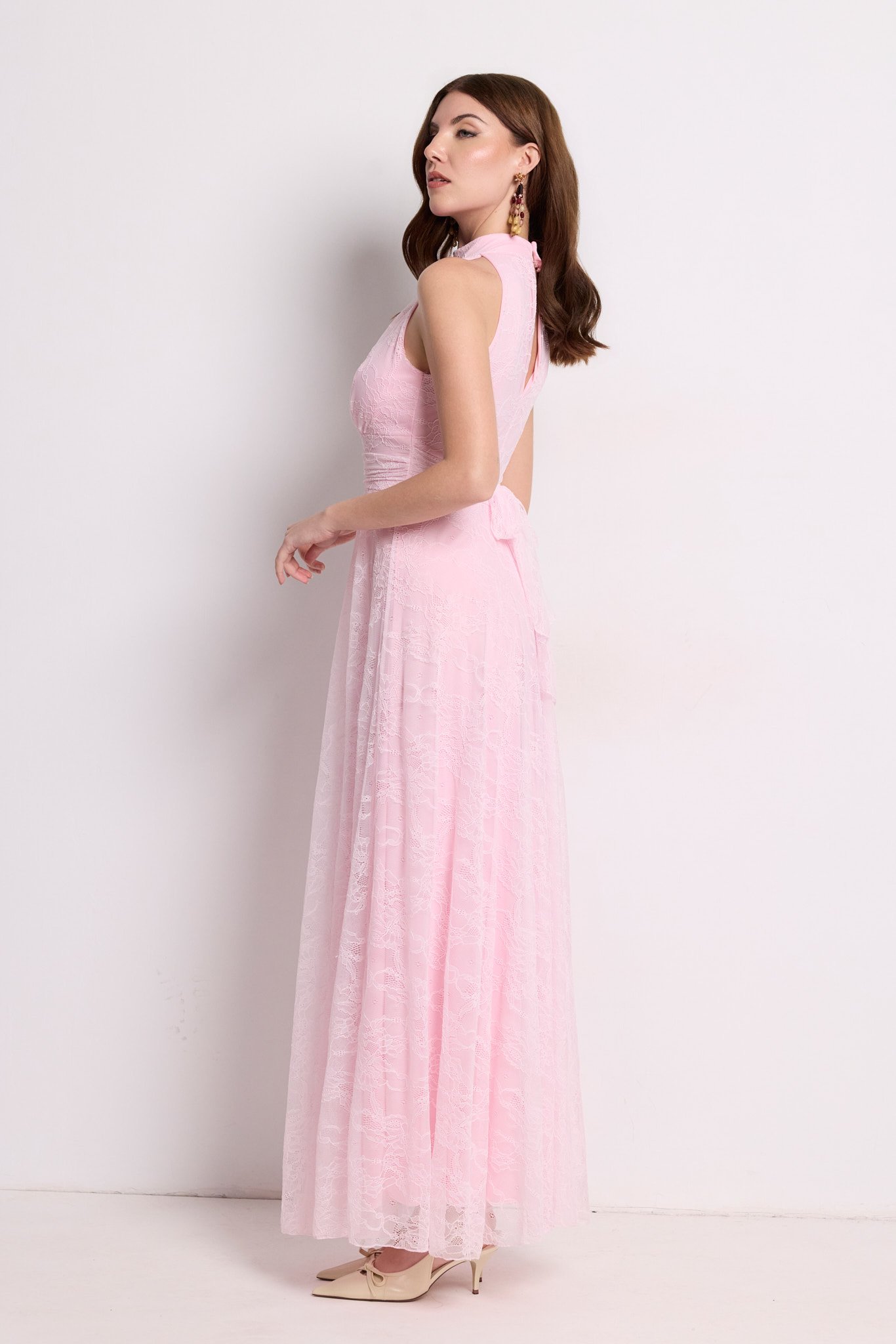 Vestido largo rosa de encaje con cuello halter y falda fluida. Elegante, romántico y perfecto para eventos.