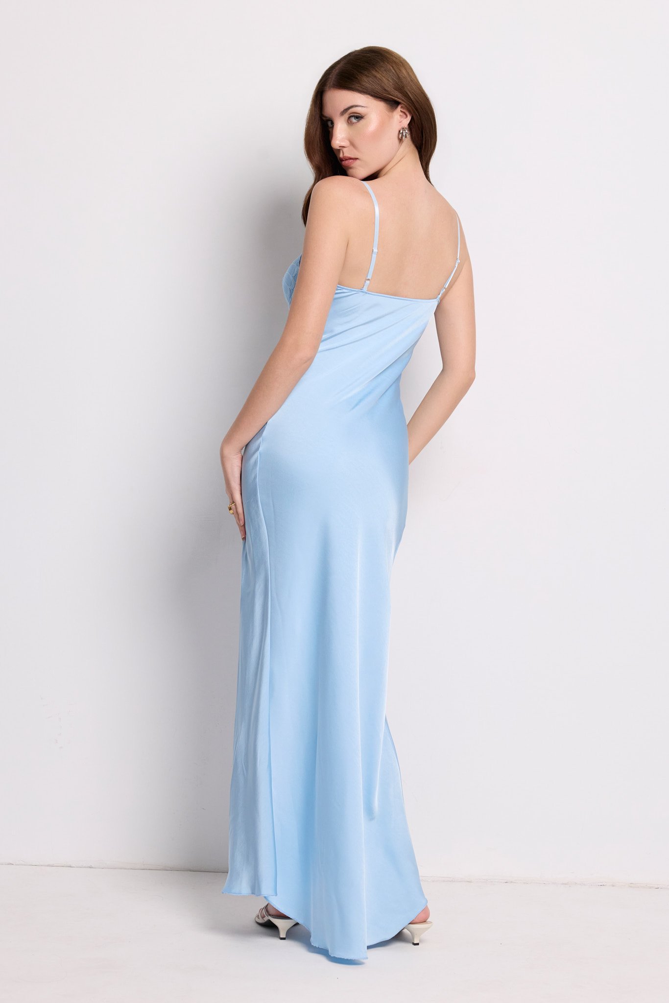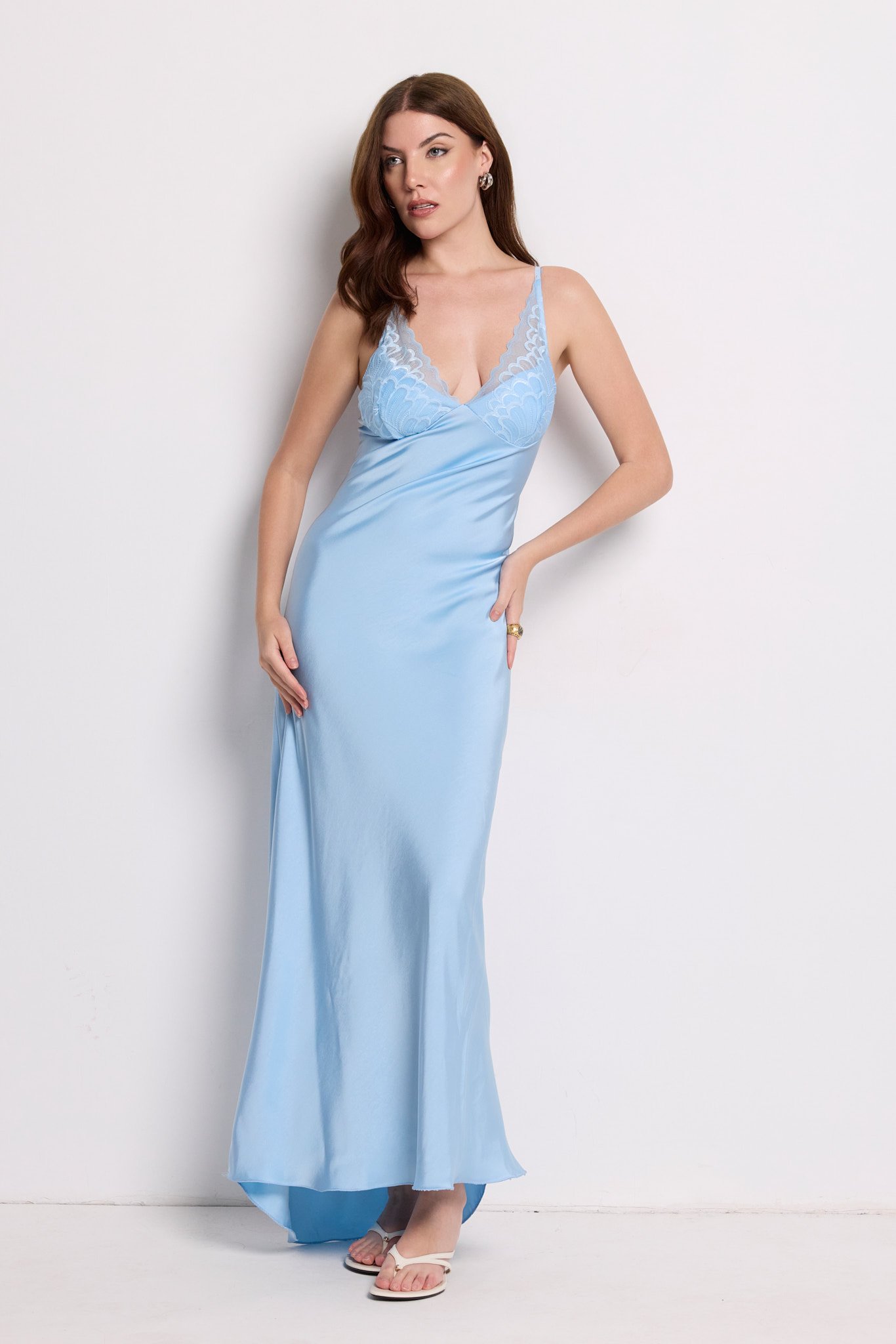 Vestido largo azul con detalle de encaje y tirantes finos. Romántico, elegante y perfecto para eventos especiales.