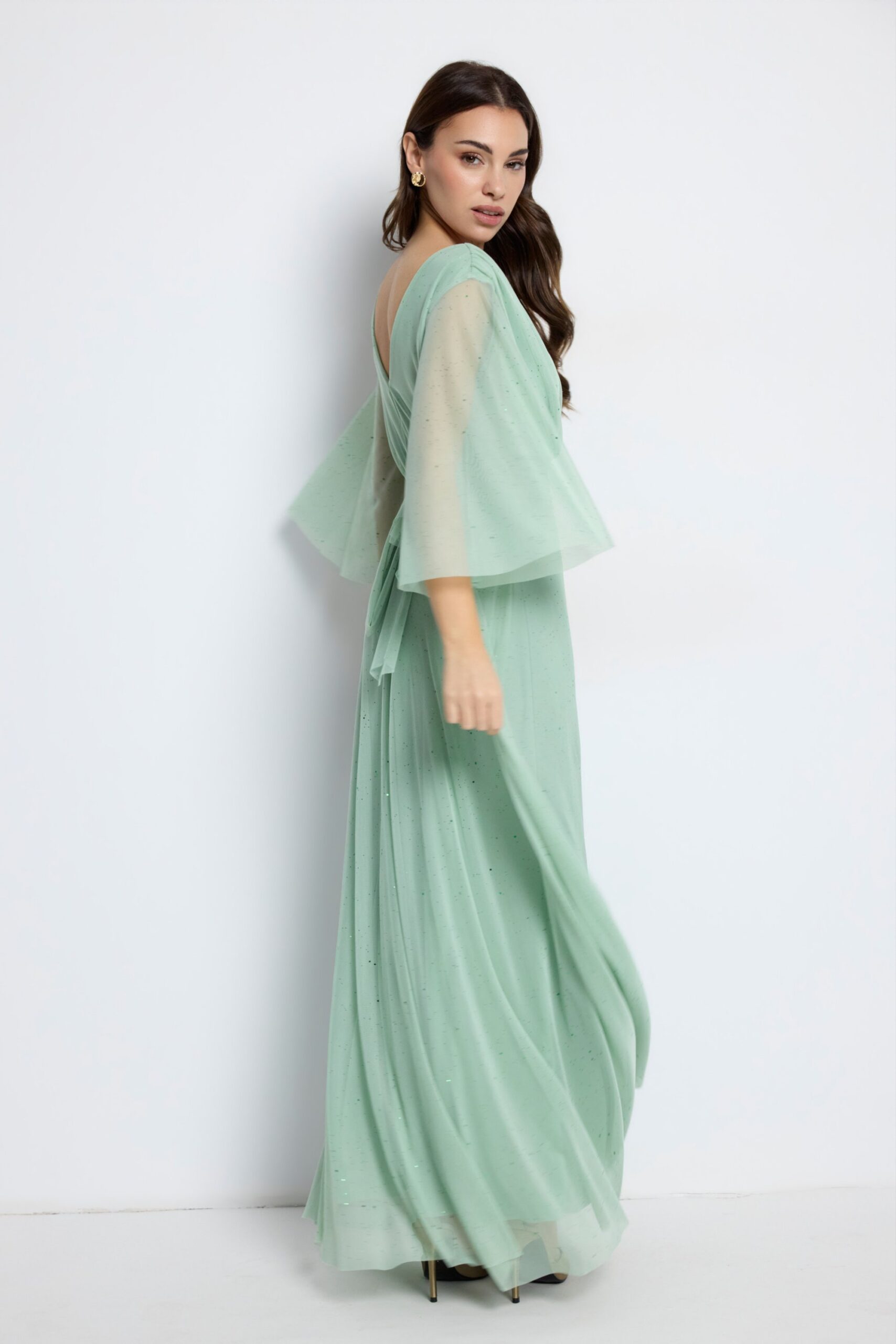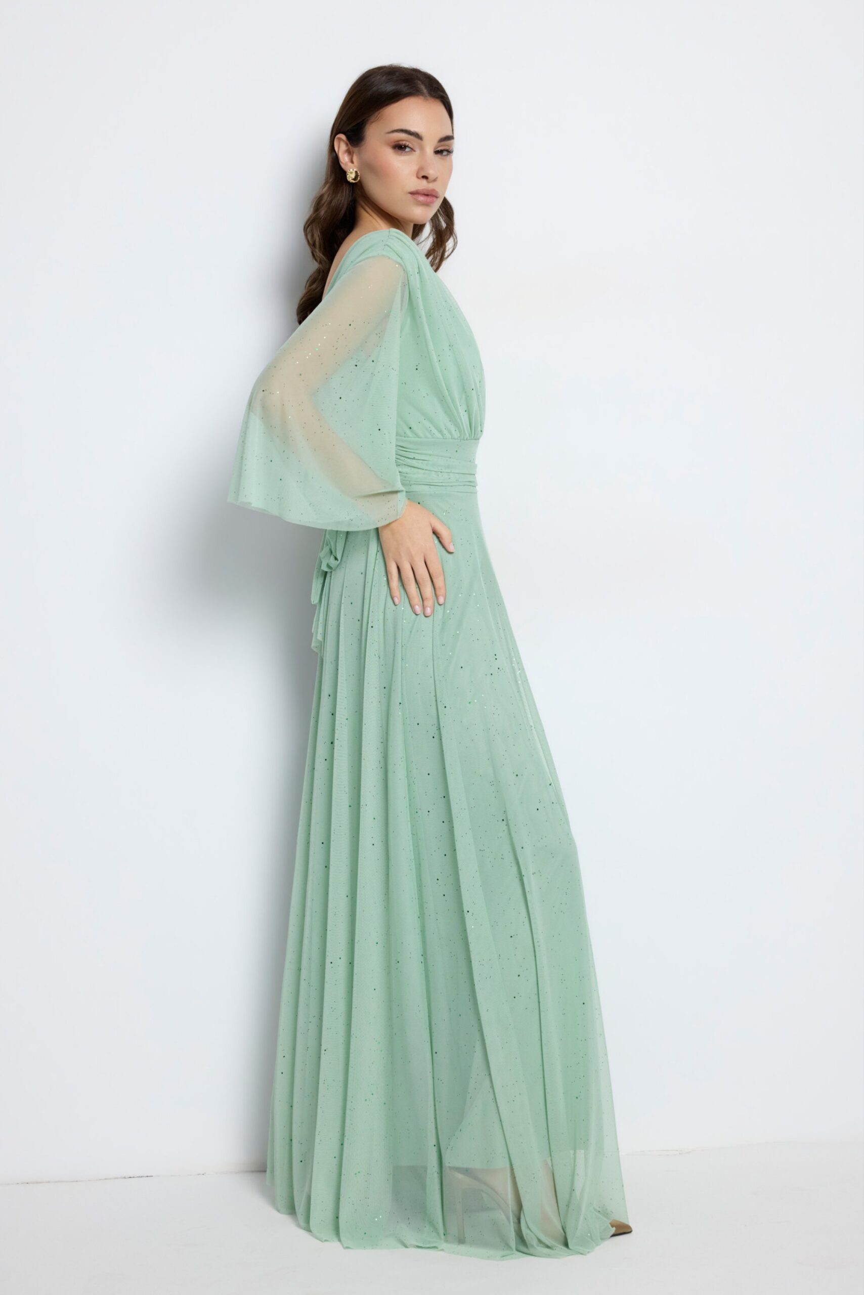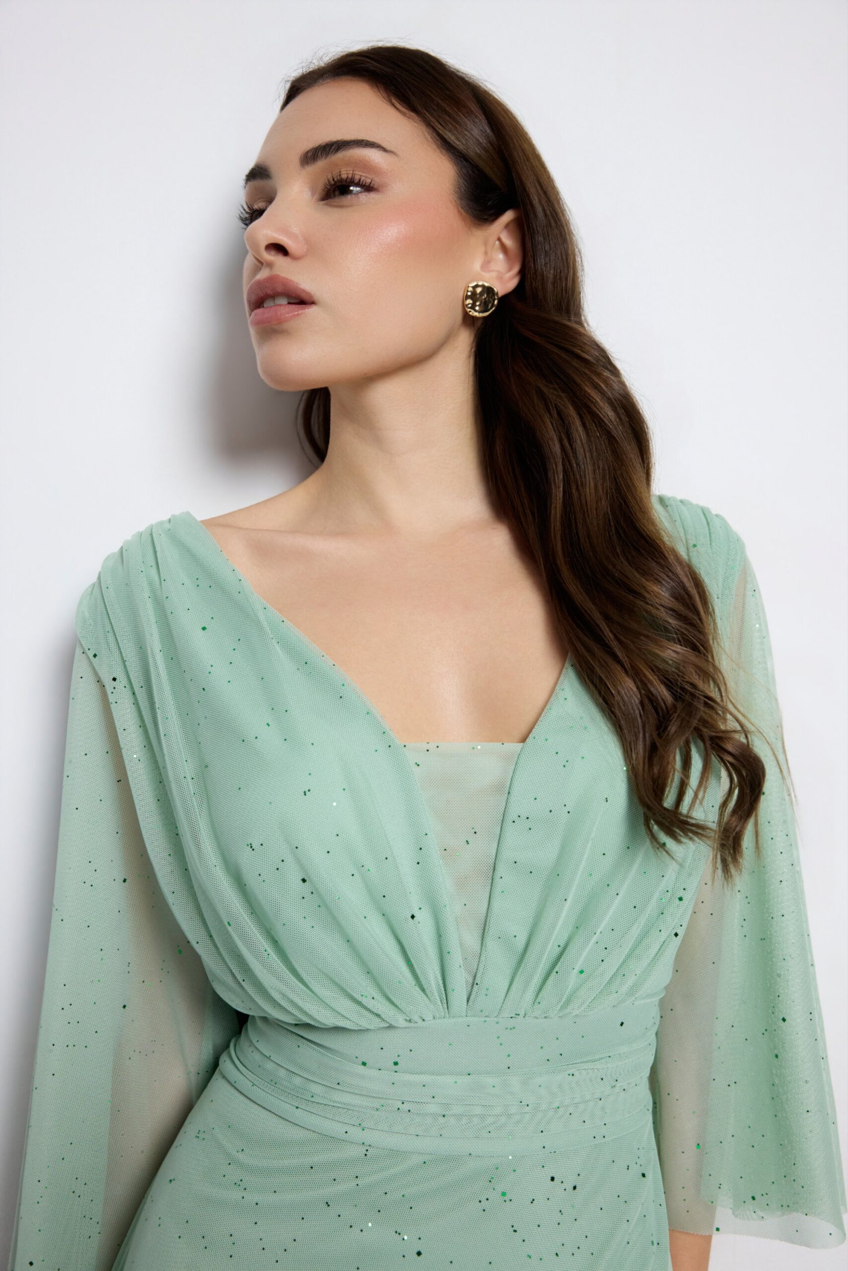 Las mangas semitransparentes y el escote en V cruzado crean un equilibrio perfecto entre elegancia y feminidad. El lazo trasero realza la cintura y aporta un acabado delicado y refinado.