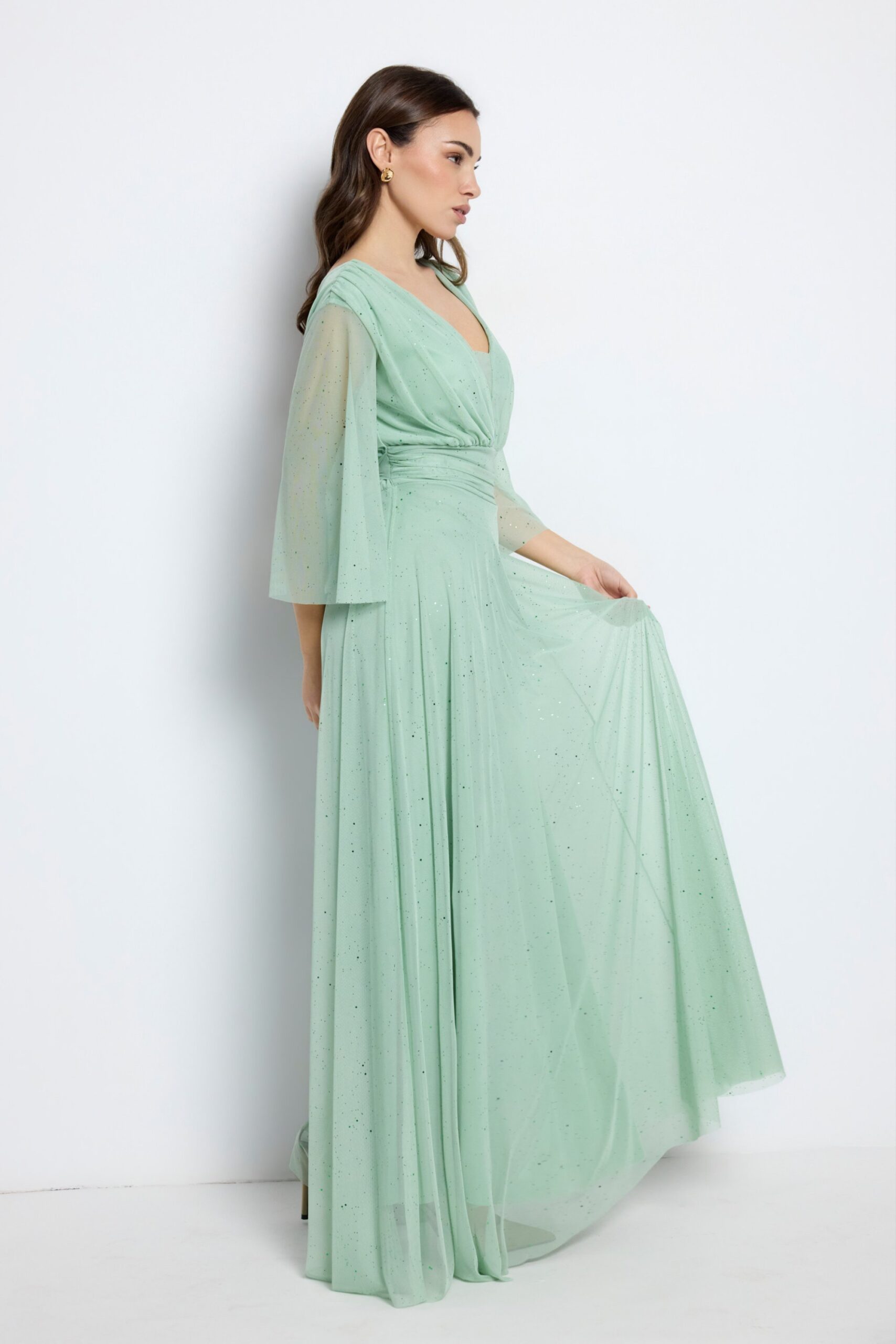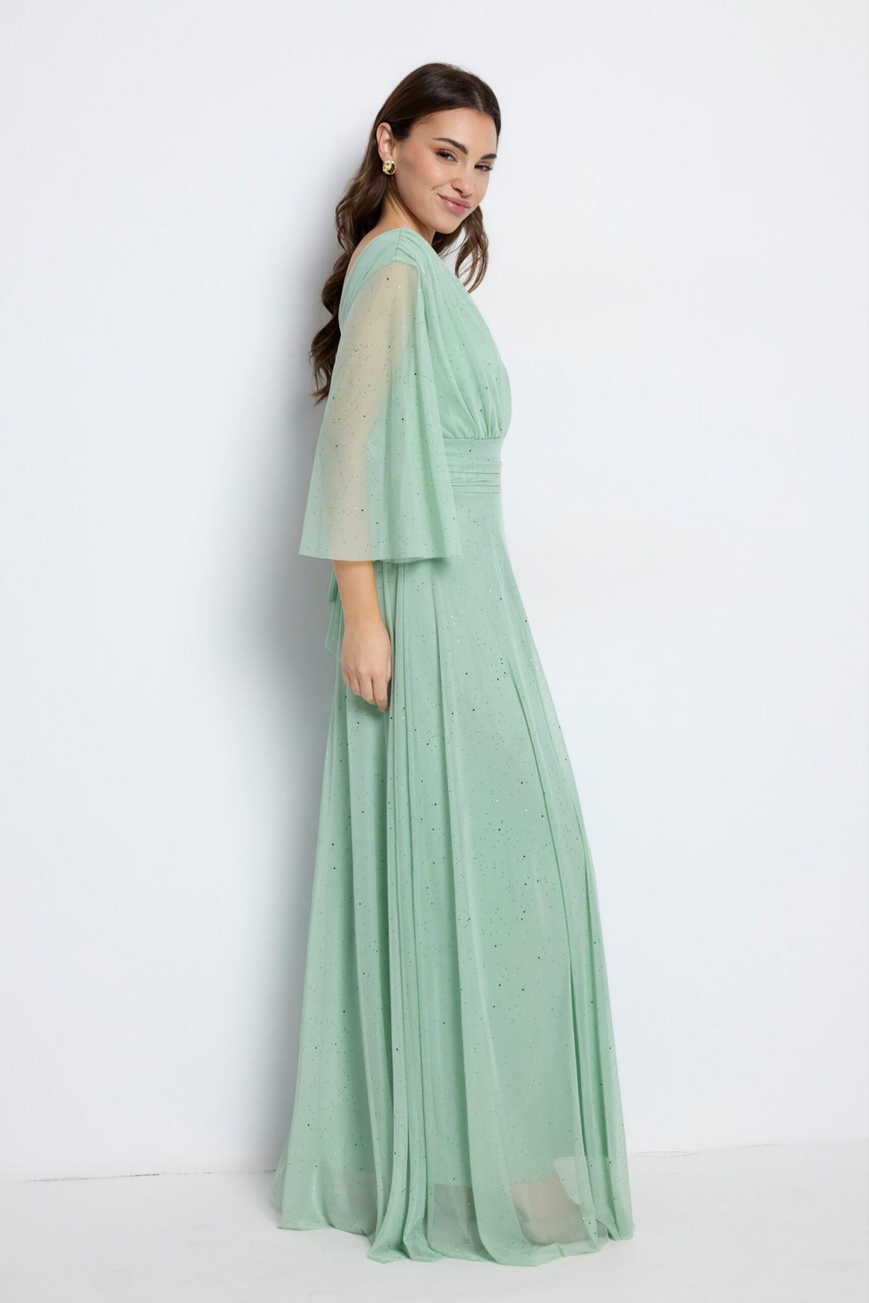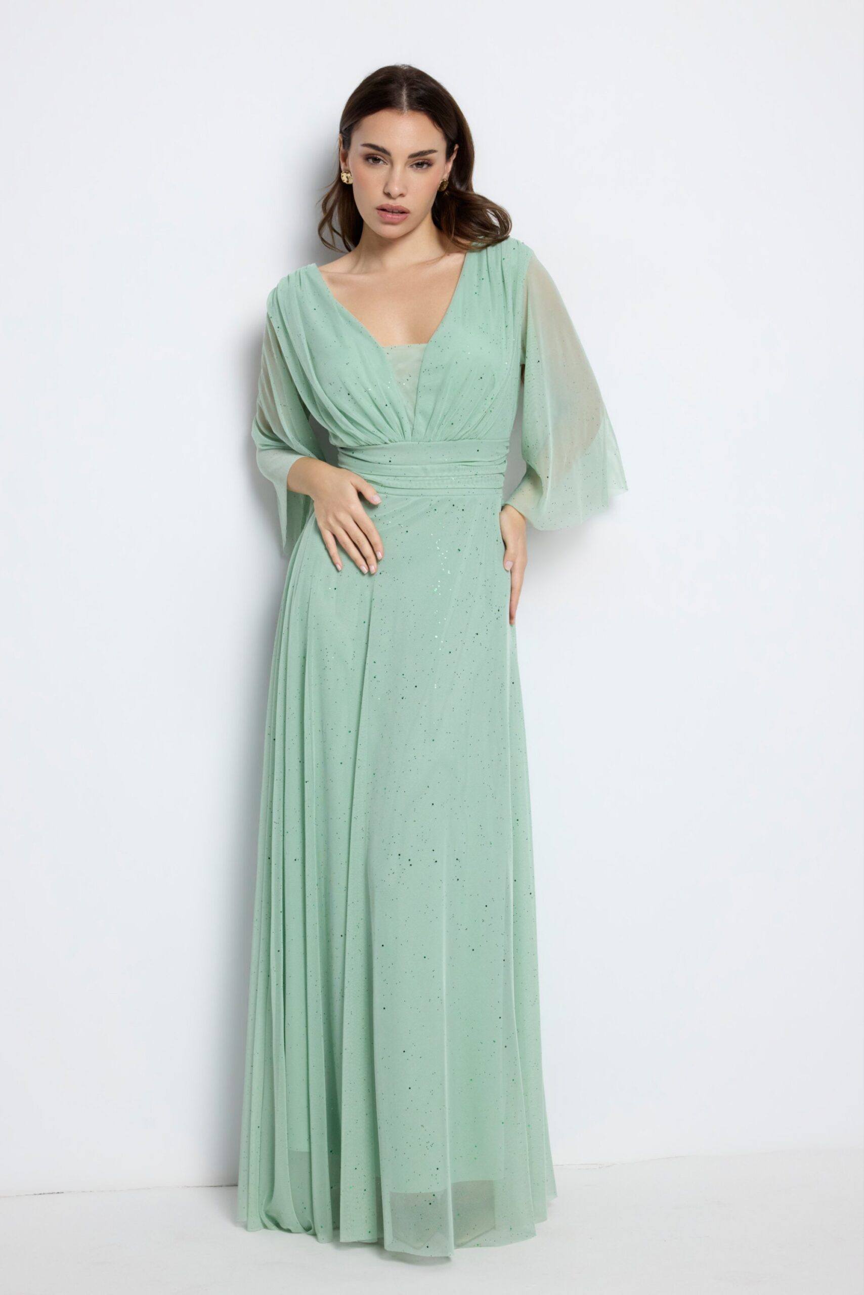 Las mangas semitransparentes y el escote en V cruzado crean un equilibrio perfecto entre elegancia y feminidad. El lazo trasero realza la cintura y aporta un acabado delicado y refinado.