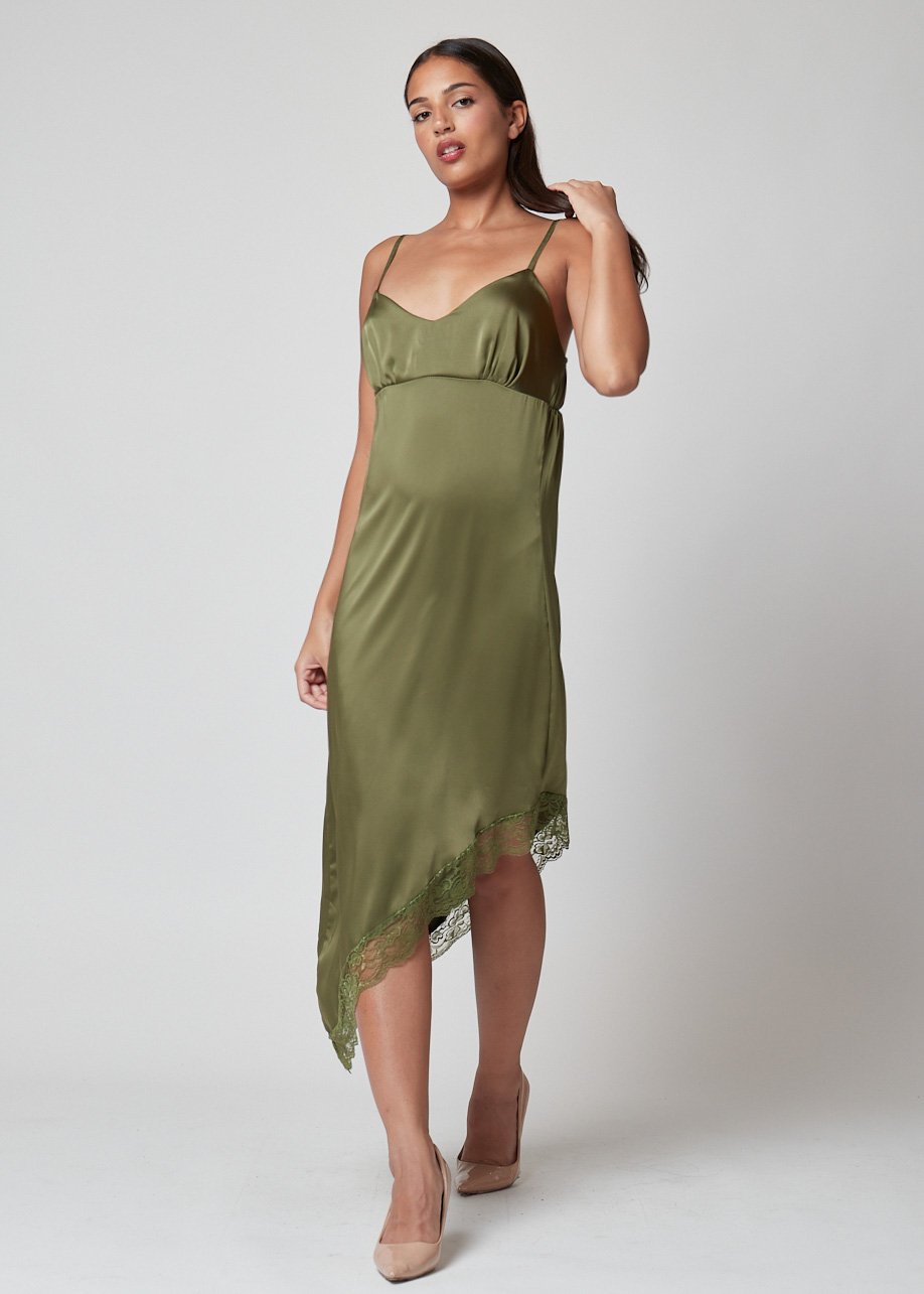 Vestido Melanie de satén verde con tirantes finos y encaje en el bajo. Estilo casual elegante perfecto para destacar en cualquier ocasión.