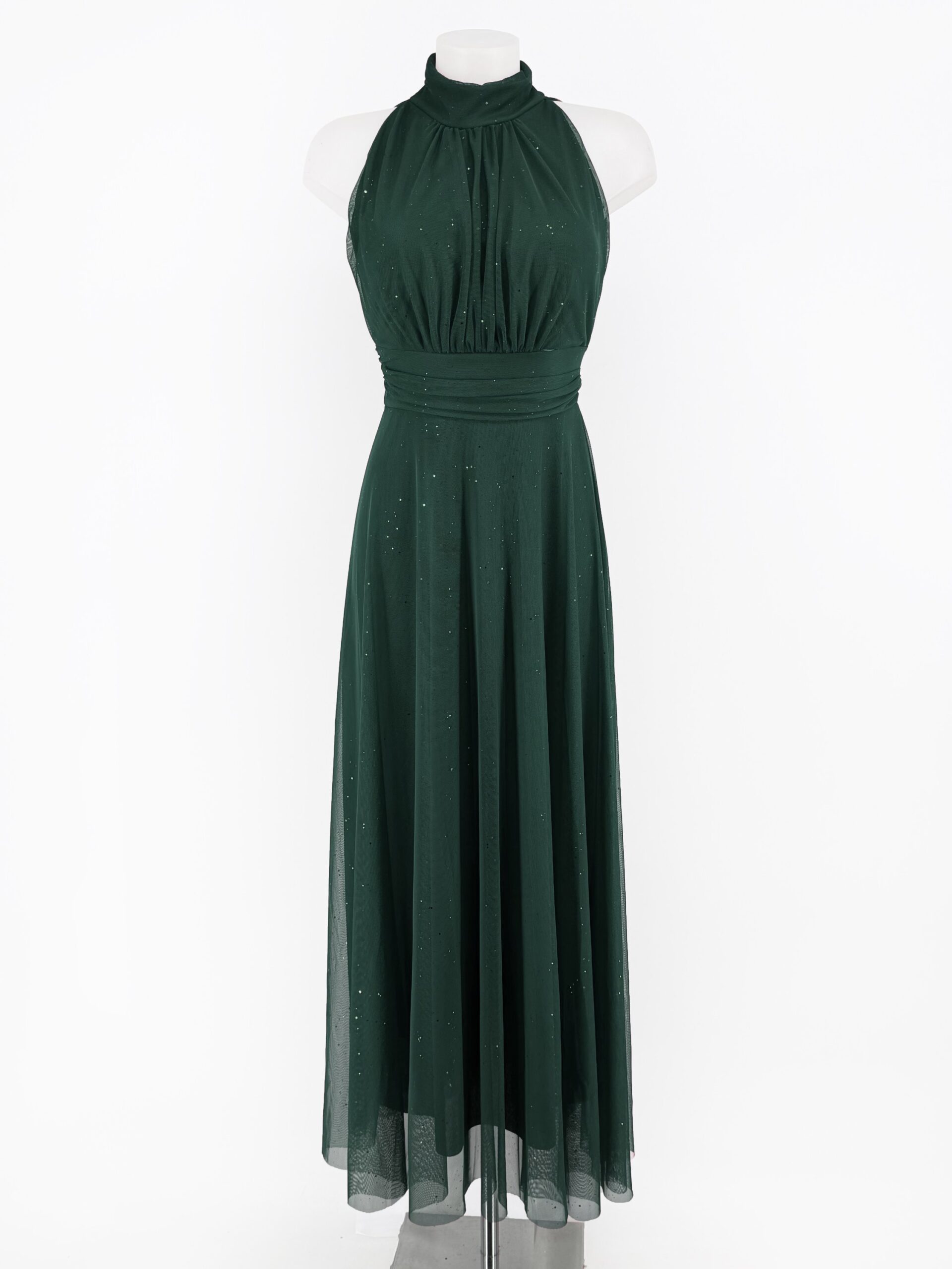El cuello halter fruncido realza los hombros y el porte, mientras que la falda fluida con caída ligera aporta movimiento y sofisticación.