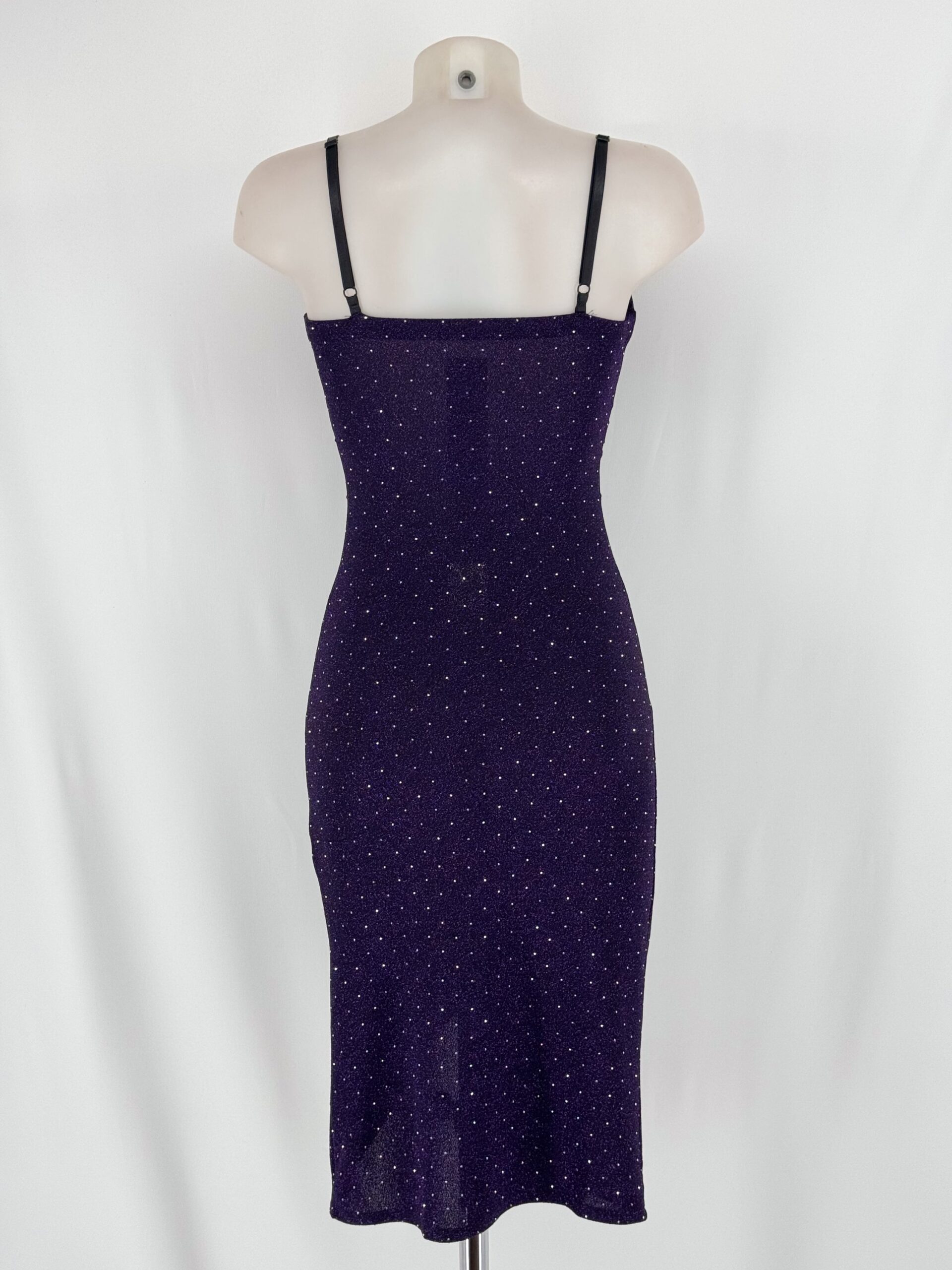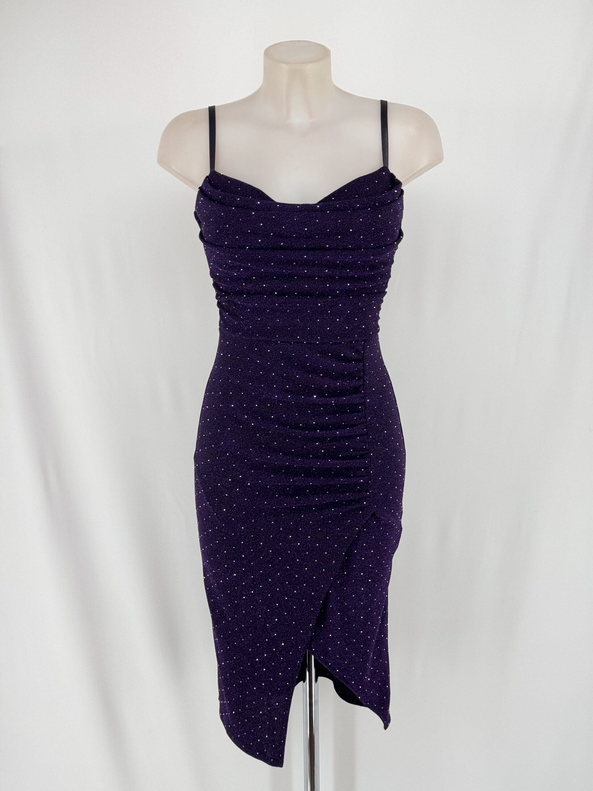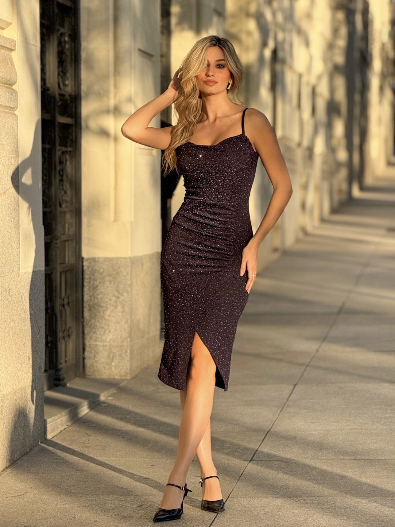 Noctésia: vestido midi brillante con tirantes finos, fruncido favorecedor y abertura lateral. Elegante, sexy y perfecto para noches especiales.