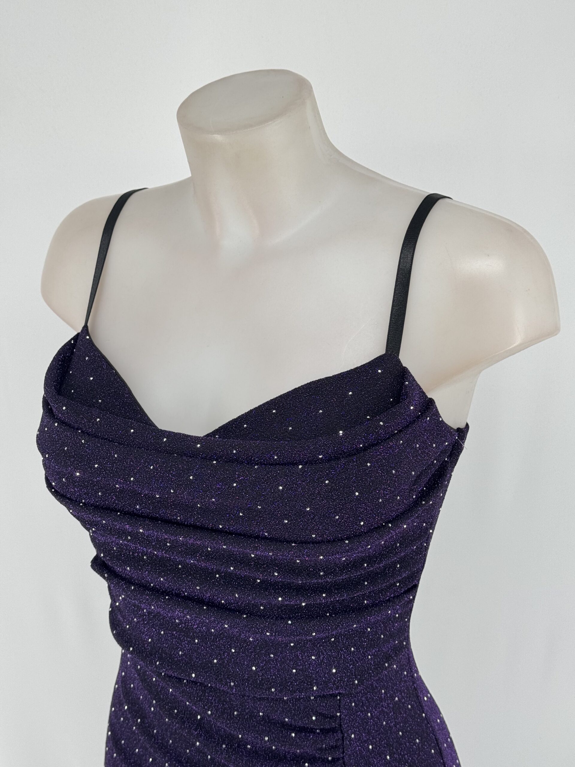 El diseño incluye tirantes finos y un escote delicado que realza la parte superior del cuerpo con un aire femenino y sofisticado. El fruncido lateral estiliza la cintura y disimula de forma natural, aportando un ajuste cómodo y favorecedor. La abertura lateral añade un toque sensual, permitiendo mostrar la pierna con elegancia y alargando visualmente la silueta.