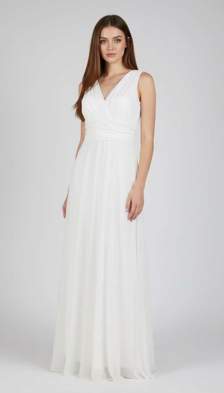 Vestido de novia low cost elegante con escote en V y falda larga fluida. Ideal para boda civil o ceremonia íntima.