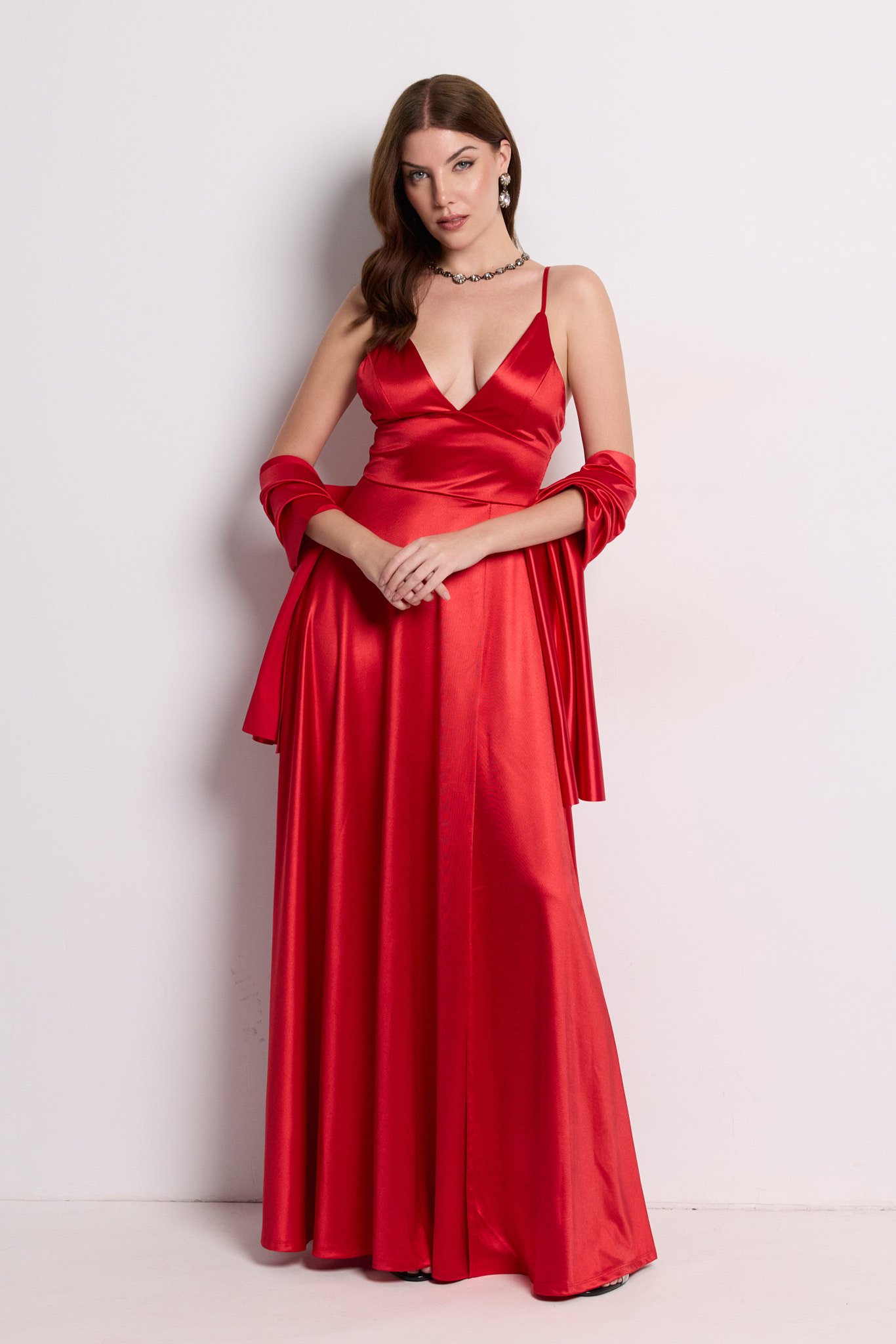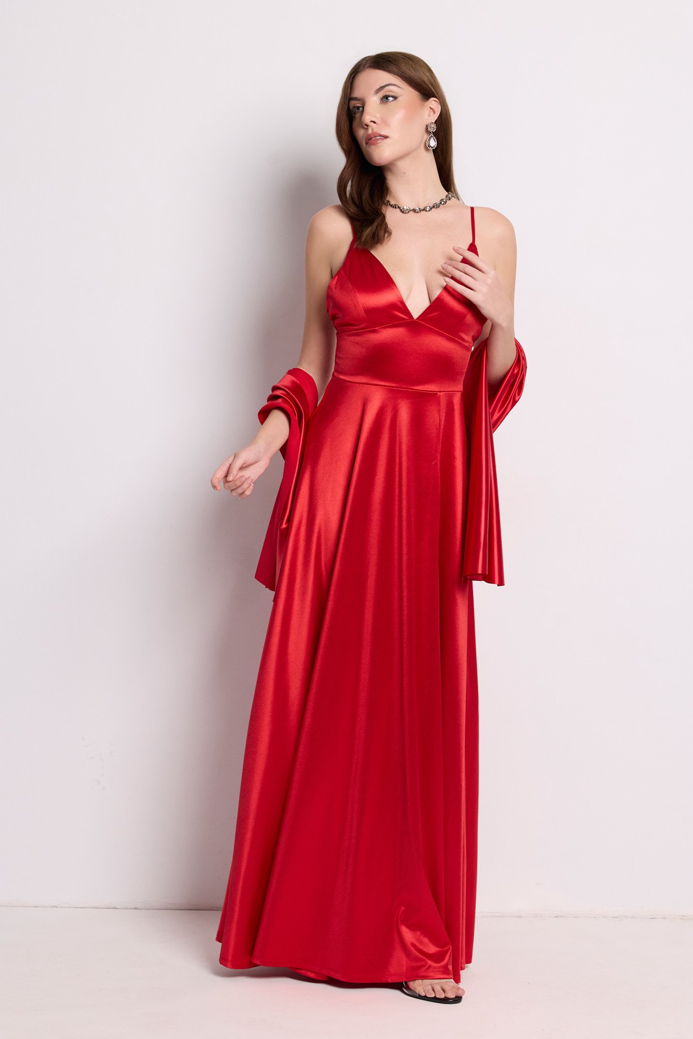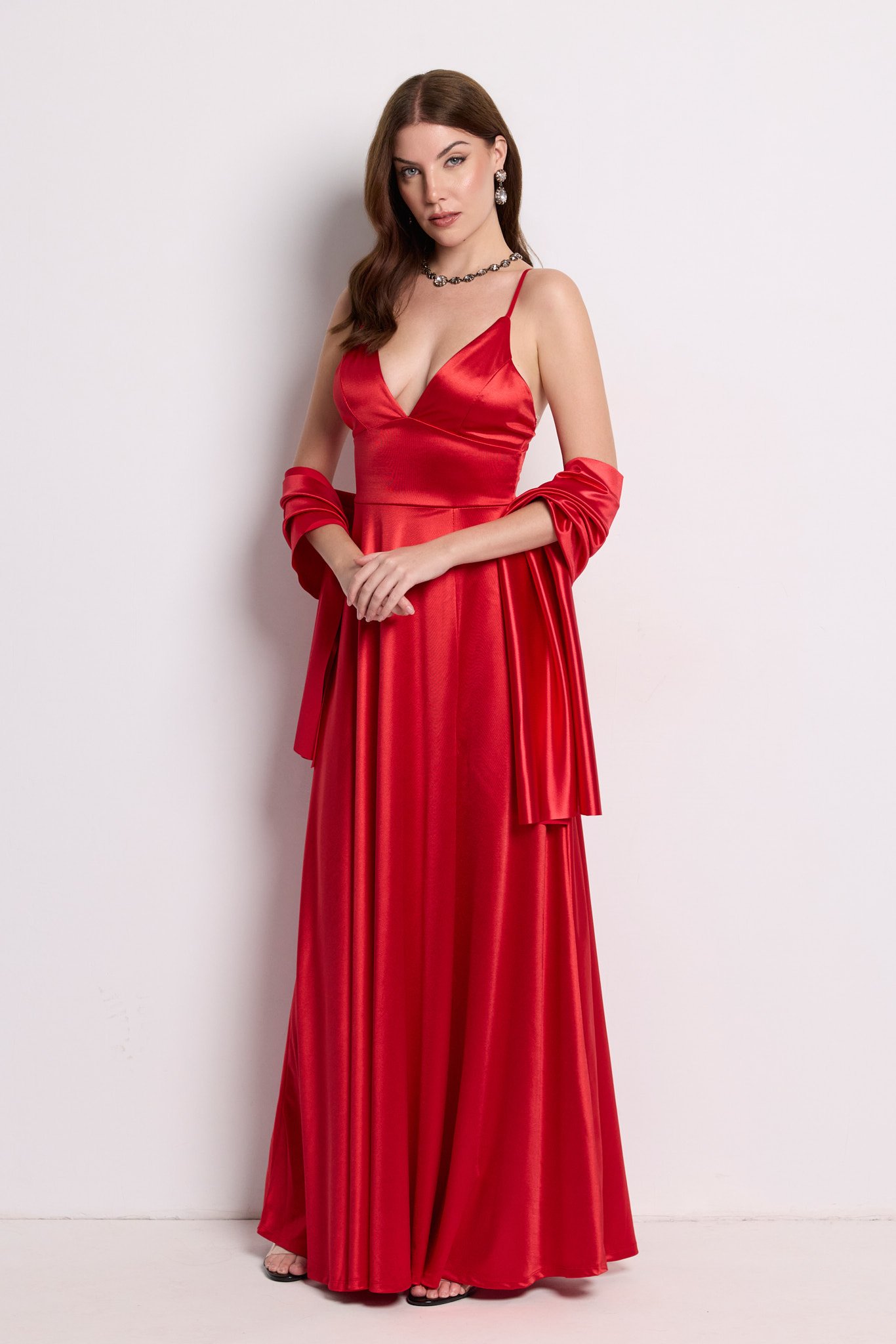 Vestido largo rojo satinado con escote y caída fluida. Elegante, sofisticado y perfecto para eventos especiales.