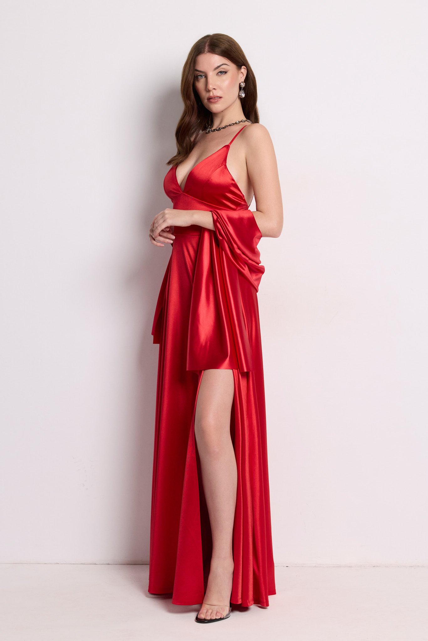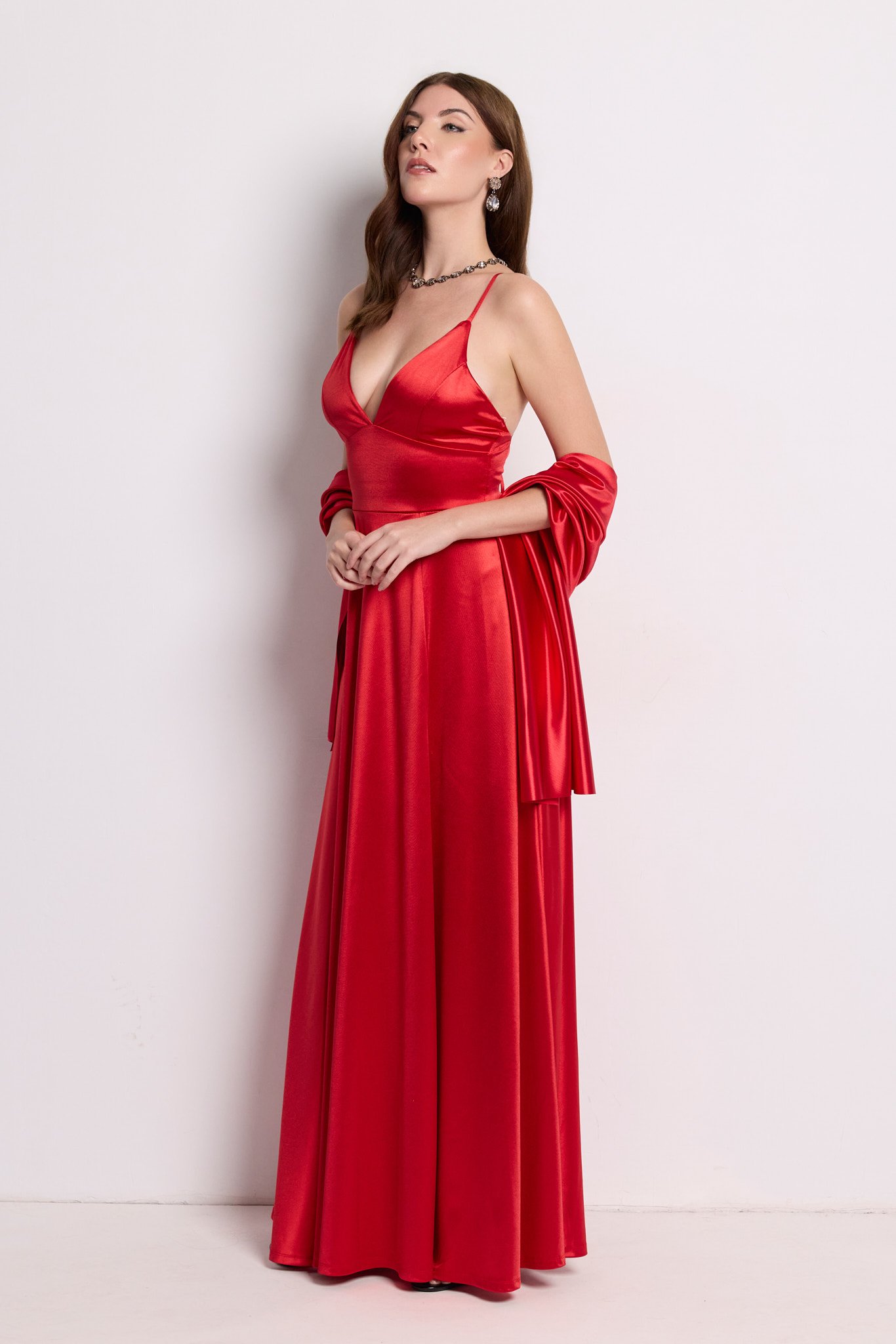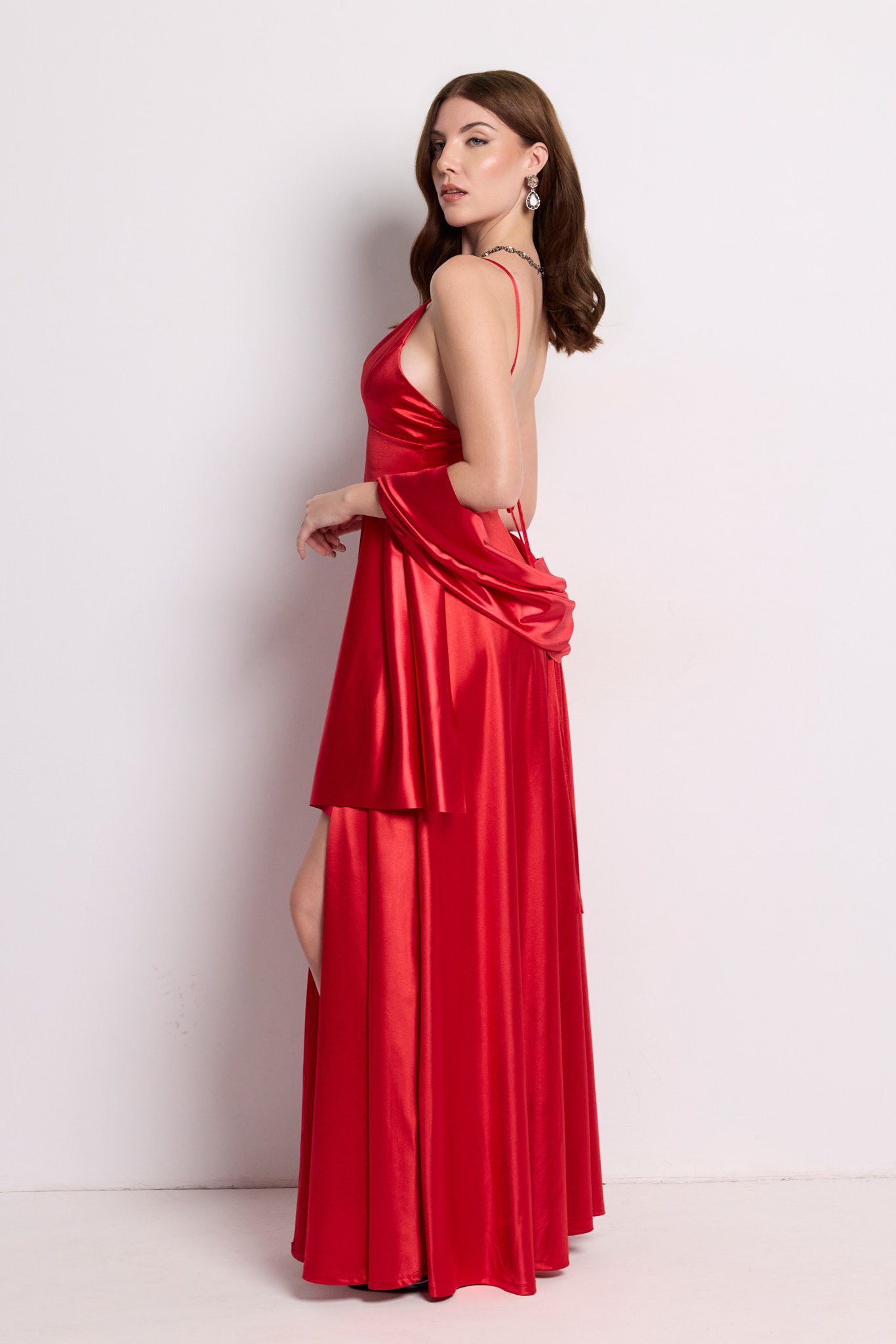 Vestido largo rojo satinado con escote y caída fluida. Elegante, sofisticado y perfecto para eventos especiales.