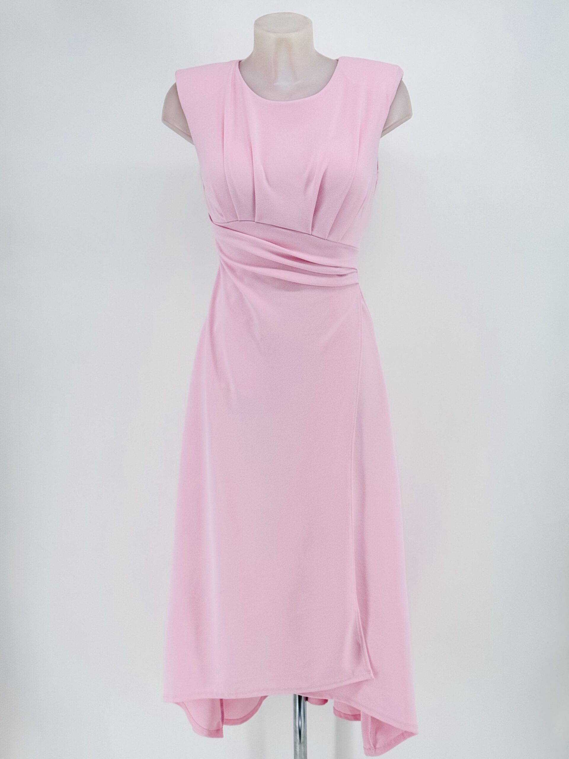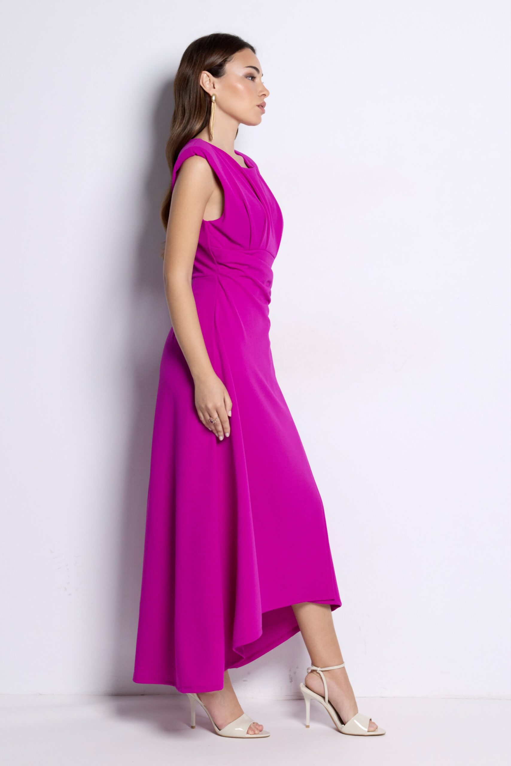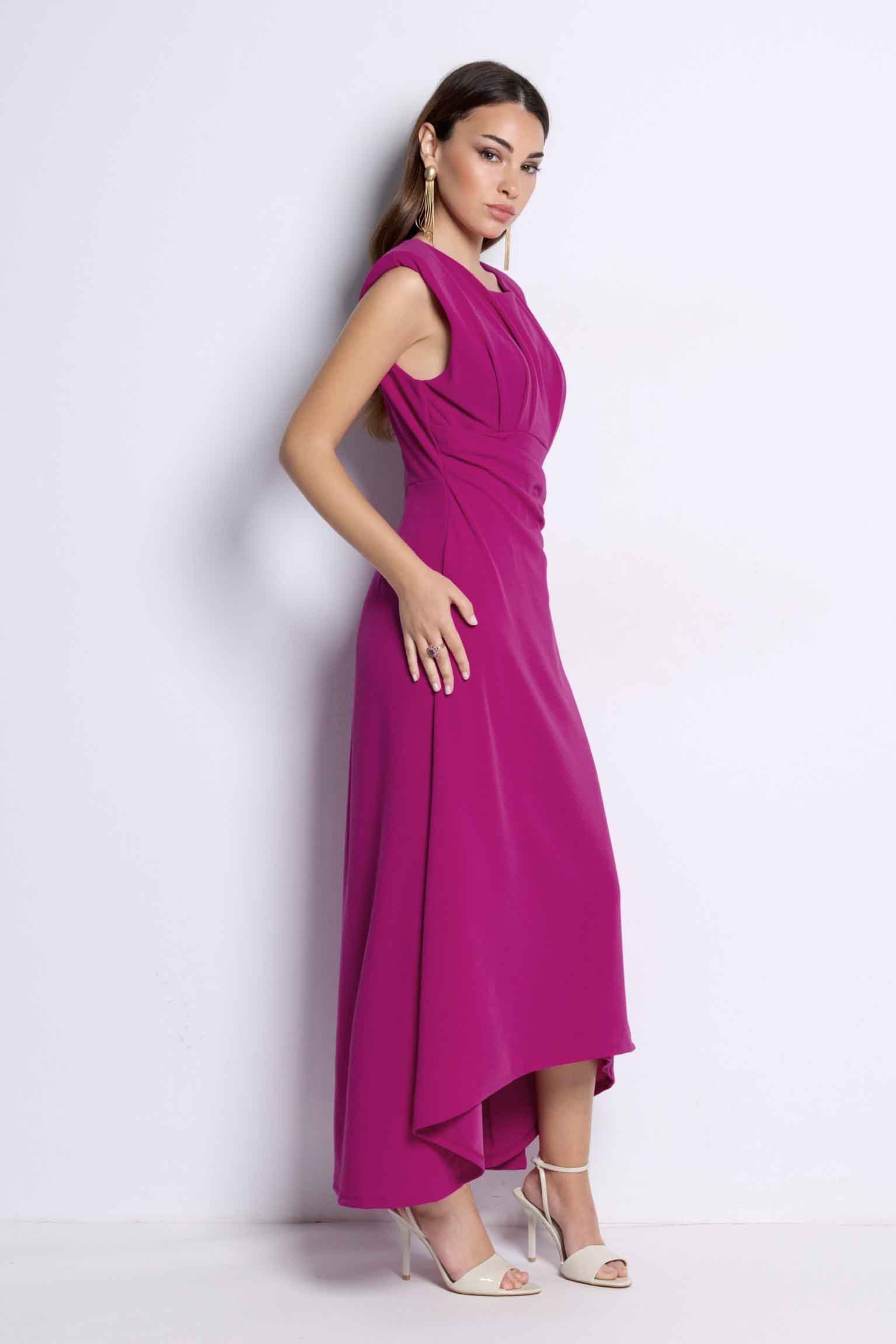 Vestido midi elegante con drapeado en cintura y bajo asimétrico. Ideal para invitadas y eventos especiales.