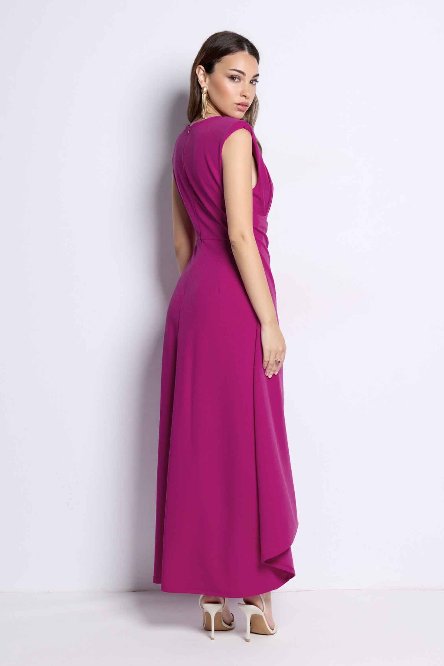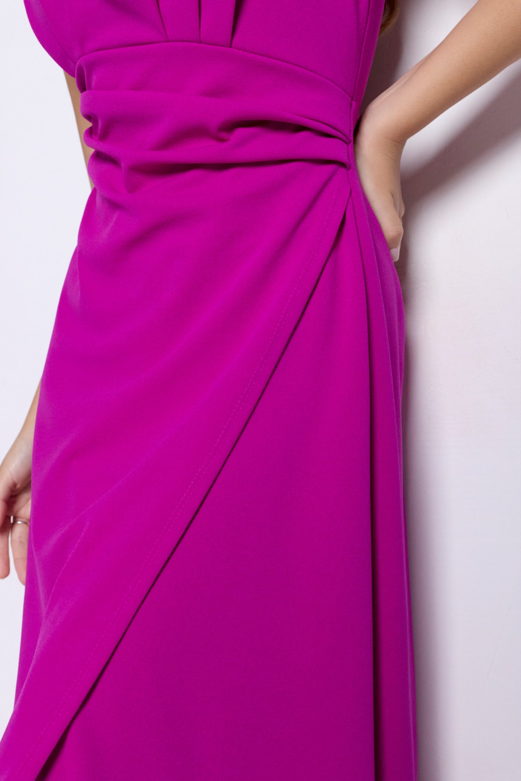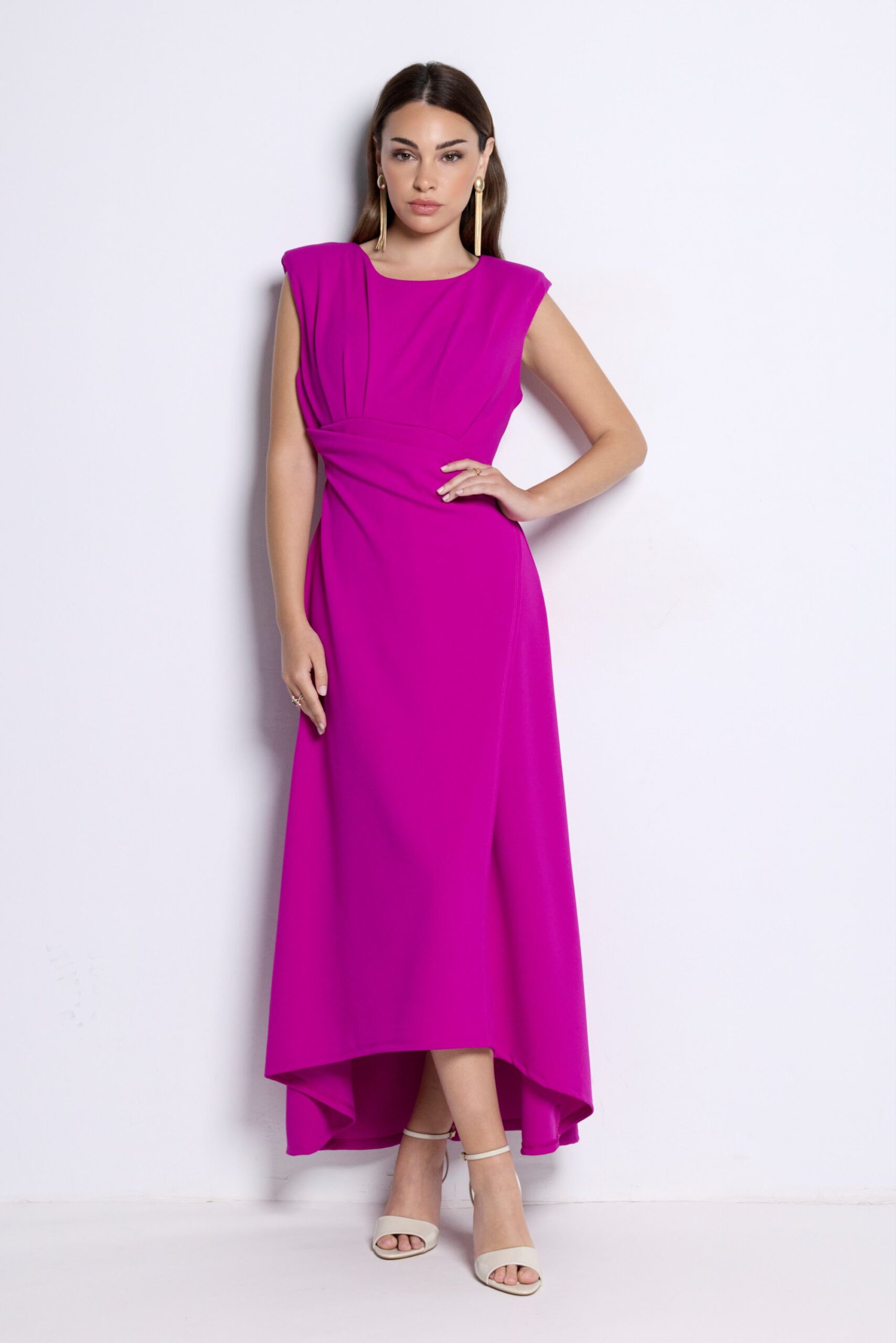 Vestido midi elegante con drapeado en cintura y bajo asimétrico. Ideal para invitadas y eventos especiales.