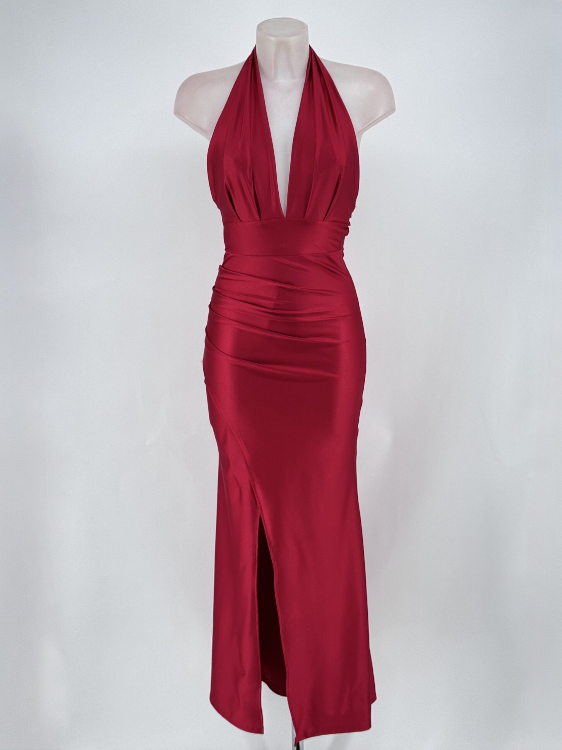 Vestido halter elegante con escote profundo, drapeado y abertura lateral. Ideal para invitadas y eventos.