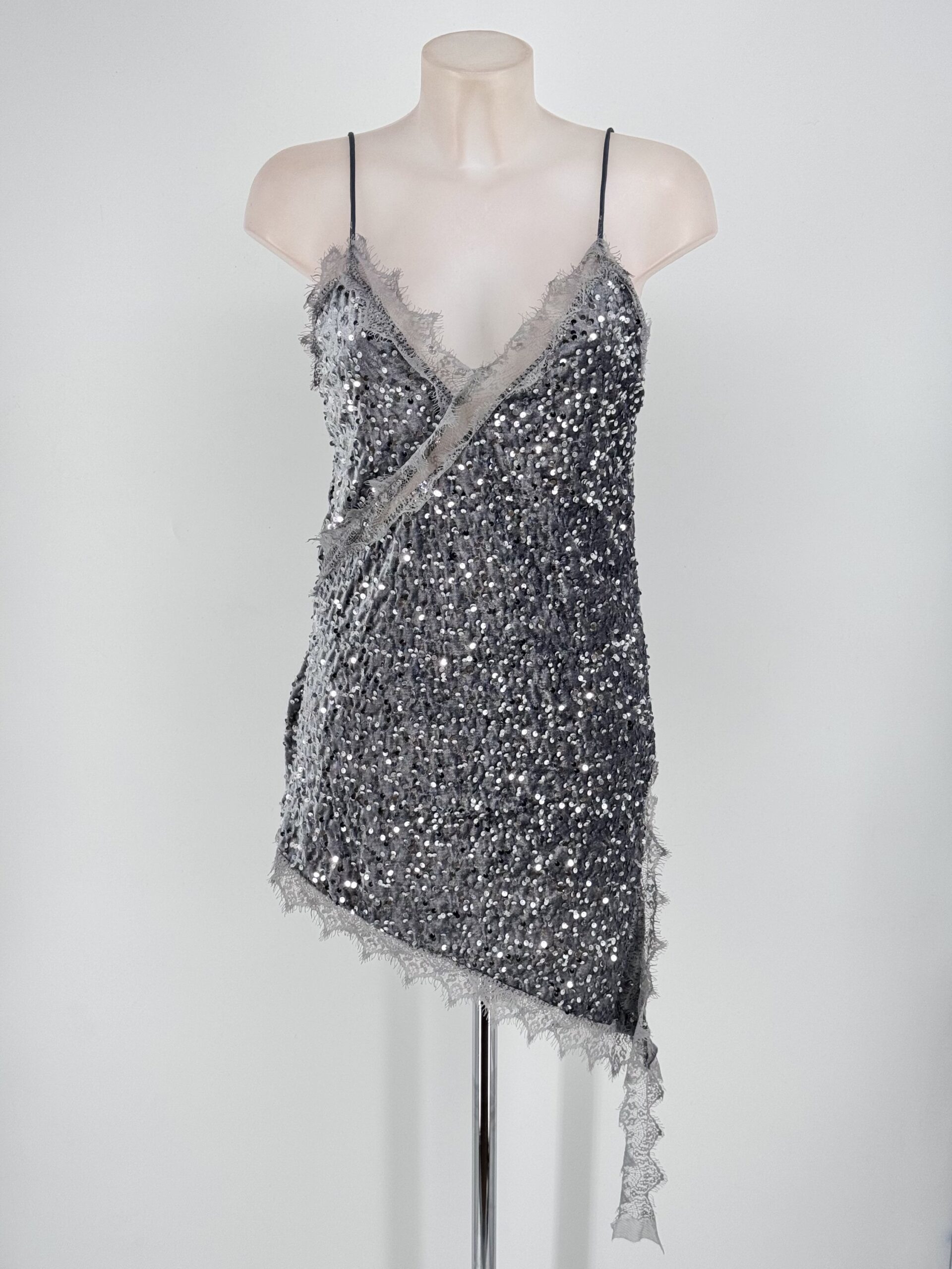 Vestido plateado asimétrico con lentejuelas y encaje. Diseño brillante y sofisticado para eventos y noches especiales.