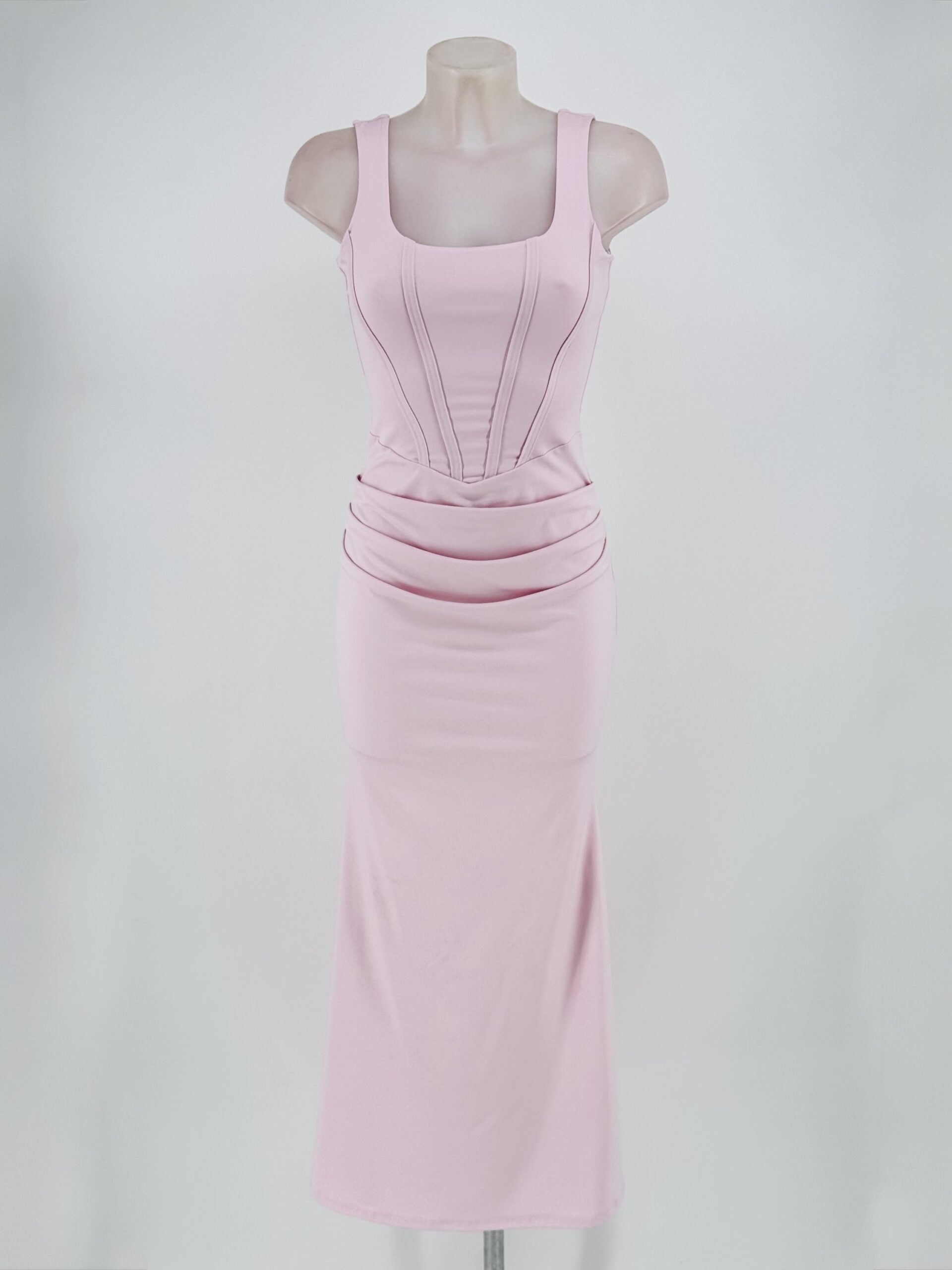 Vestido rosa largo con efecto corsé y corte sirena. Diseño elegante y sofisticado ideal para bodas y eventos especiales.